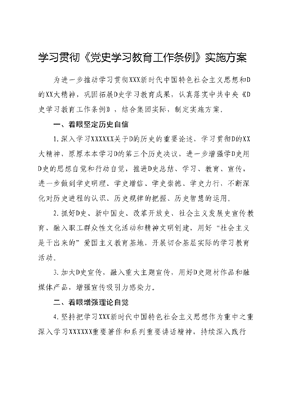 学习贯彻《党史学习教育工作条例》实施方案为进一步推动学习贯彻XXX新时代中国特色社会主义思想和D的XX大精神,巩固拓展D史学习教育成果,认真落实中共中央《D史学习教育工作条例》,结合集团实际,制定实施方案。一、着眼坚定历史自信1.深入学习XXXXXX关于D的历史的重要论述,学习贯彻D的XX大精神,原原本本学习D的第三个历史决议,进一步增强学D史用D史的思想自觉和行动自觉,推进D史总结、学习、教育、宣传,进一步做到学史明理、学史增信、学史崇德、学史力行,不断深化对历史进程的认识、历史规律的把握、历史智慧的运用。2.抓好D史、新中国史、改革开放史、社会主义发展史宣传教育,融入职工群众性文化活动和精神文明创建,用好社会主义是干出来的爱国主义教育基地,开展切合基层实际的学习教育活动。3.加大D史宣传,融入重大主题宣传,用好D史题材作品和融媒体产品,增强宣传吸引力感染力。二、着眼增强理论自觉4.坚持把学习XXX新时代中国特色社会主义思想作为重中之重深入学习XXXXXX重要著作和系列重要讲话精神,持续深入践行XXXXXX社会主义是干出来的伟大号召,及时跟进学习D的创新理论,既注重从总体上系统把握,又分专题分领域深入领会,做到至信而深厚、融通而致用、执着而笃行。三、着眼提高政治能力5.强化对D忠诚教育,把对D忠诚、做到两个维护体现在坚决贯彻D中央决策部署的行动上,体现在履职尽责、做好本职工作的实效上,体现在D员、干部的日常言行上,自觉同D的理论和路线方针政策对标对表、及时校准偏差,D中央作出的战略决策必须坚决执行,确保不偏向、不变通、不走样。6.强化政治能力训练和政治实践历练,推动D组织和广大D员干部从政治上研判形势、分析问题,牢记国之大者,一切在大局下思考、一切在大局下行动,以干工作、办实事的实际行动提高贯彻D中央决策部署的本领和水平。四、着眼强化宗旨意识7.常态化开展我为群众办实事活动,巩固我为群众办实事实践活动成果,深入实施惠民工程,用好智慧平台,在落实民生项目清单、做实政策措施的基础上,推动工作流程规范化、创新做法制度化、成熟经验机制化,完善解决民生问题的体制机制。8.完善发挥基层D组织战斗堡垒作用和D员先锋模范作用机制D委领导班子要制定年度民生实事计划并跟进抓好落实,班子成员要落实D建基层联系点制度,定期深入基层解决实际困难;D支部要建立办实事项目清单,向职工群众公开;基层D组织要组织D员开展结对帮扶、志愿服务。9.持续改进作风,坚决反对形式主义、官僚主义,不开空头支票,不增加基层负担,防止作秀,多做为民利民惠民的事情。五、着眼激发昂扬斗志10.把弘扬伟大建D精神作为推进D史学习教育常态化长效化的重要任务,融入D员、干部学习教育的日常,积极培育D内政治文化,推动干部职工积极践行社会主义核心价值观。11.加强斗争精神教育,从D的历史中汲取战胜风险挑战的智慧和力量,锤炼斗争精神和斗争本领,激励广大D员、干部发扬历史主动精神,敢于直面矛盾问题和困难挑战,积极履职尽责、勇于担当作为。六、着眼永葆初心使命12.全面贯彻新时代D的建设总要求,以D的政治建设为统领,深入落实四强化、六提升D建工作措施,推动集团D的建设全面进步、全面过硬。13.经常性开展政治体检,督促D员干部对照D章D规,对照D中央决策部署,对照职工群众新期待,对照先进典型、身边榜样查找自身在政治、思想、组织、作风、能力、廉洁等方面存在的差距和不足,用好批评和自我批评武器,深刻检视剖析,认真抓好整改落实。