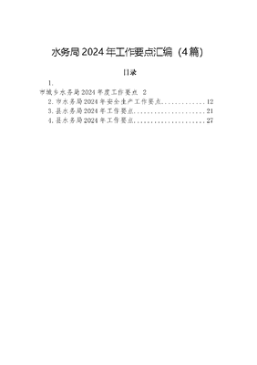 水务局2024年工作要点汇编(4篇)目录1.市城乡水务局2024年度工作要点22.市水务局2024年安全生产工作要点.123.县水务局2024年工作要点214.县水务局2024年工作要点27市城乡水务局2024年度工作要点2024年全市水务工作的指导思想和总体要求是:深入落实XXXXXX节水优先、空间均衡、系统治理、两手发力治水思路和关于治水重要论述精神,锚定开新局、树标杆、创亮点,围绕打造水美中国XX样板一个总体目标,突出河库水系水连路通和水利风景区风光带先行先试区建设两个重点,做好水资源、水循环、水生态、水环境、水安全和水文化六个统筹,落实依法管水、科技兴水、系统治水、改革活水、数字强水、文化铸水六水共治,大力实施九大工程,强力推进水务事业高质量发展,为中华善城、现代XX强势崛起提供坚实水务支撑和保障。主要任务目标是:全市力争完成多层次水利投资15亿元,全年用水总量控制在3.25亿方以内,综合治理河道28.4公里,铺设工业输配水管道24.2公里,新建改建城乡居民供水主管网43公里,治理水土流失面积10平方公里,完成5处以上省和国家级水利风景区和3处以上省级水利风景区风光带的创建。一、聚焦水系美,大力实施现代水网建设工程。联动水利工程建设指挥部成员单位,结合XX现代水网建设规划的实施,加快推动6条主要河流水连路通工程,让水蓄起来、活起来,让群众看得见流水,让沿河道路串连成线。1、北沙河段工程。重点实施马河水库18公里环库路硬化及绿化提升工程,打造9米宽环湖绿道,确保5月底前环库路建成通车,9月份全面完成绿化景观节点打造。2、界河段工程。规划实施8座闸坝建设,年内完成主体工程。市林业事业发展中心实施104国道下游右岸0.88公里道路建设,6月底前实现界河全线道路连通。3、城河段工程。规划新增1处闸坝,年内完成主体工程。市住建部门牵头,年内实施完成平行路至白龙湾大桥段右岸4.3公里道路建设,实施北辛路荆河大桥至愚公桥段右岸1.5公里道路建设工程,6月底前完工,实现城河岸线道路连通。4、郭河段工程。汛前完成上游段(墨子湖上库至XX山亭边界)5.3公里和中游段续建主体工程,年内完成滕山边界至文昌路郭河大桥(北池村西)道路建设及绿化项目;适时推进墨子湖环湖路道路连通工程,加快实现郭河水连路通。5、十字河段工程。12月底前完成新薛河(西江至东洪林段)18.8公里河道治理,建设拦河坝7座,全力打造梯级蓄水、水面连续的河道生态景观。6、冯河城区段工程。市住建部门牵头,结合棚改项目,实施冯河城区段冯河居、孙庄居、后屯居三段河道治理及沿河道路连通工程,10月份启动建设,工程结合棚改项目进度跨年度实施完成。二、聚焦生态美,大力实施河湖环境优化工程。坚持生态惠民、生态利民、生态为民,把解决突出生态环境问题作为民生优先领域,竭力让群众共享绿色福利、生态红利。7、推进生态美丽河湖建设。全面压实镇、村两级河长责任,加大对河长巡河的督导考核,严格落实常态化巡河和城区河道常态化保洁制度,确保巡河完成率稳中向好,发现问题按时整改到位;扎实做好河湖问题清零销号,积极创建岗头河等3条省级(含南四湖XX片)和2条枣庄市级美丽幸福河湖,确保完成建设任务,持续提升我市河湖生态环境品质,打造更多群众满意的幸福河湖。8、加快污水处理厂提标改造。总投资7900万元,实施第二、第三污水处理厂提标改造,年内完工后,提升出水水质至准四类标准,提前完成城区4座污水处理厂提标改造的任务目标。9、实施雨天污水溢流防治工程。聚焦污水管网雨天溢流问题,完成第一、第四污水处理厂连通工程,实现城区四座污水处理厂的互联互通,科学合理调配污水处理厂进水量。积极谋划实施王林水库至三污和七星湖湿地至四污调水管网,建设王林水库15万方的调蓄池,改建小清河拦河坝、取水闸等,充分发挥管网、河库、湿地的调蓄净化功能,全力解决污水管网雨天溢流问题,保障入湖河流水质,不断满足人民群众对美好水生态环境的需求。10、加大水土保持综合治理。加快完成葫芦套小流域水土保持治理各项扫尾工程,尽早交付使用、发挥效益。积极申报、力争实施总投资600多万元的谷山小流域治理工程,治理水土流失面积10平方公里,努力打造更多生态清洁小流域,实现治理一方水土,改善一片环境的效果。三、聚焦人文美,大力实施水文化弘扬工程。坚持弘扬优秀水文化,通过挖掘、传承、发展水文化,为推动新阶段水利高质量发展提供强大的精神动力和文化源泉。11、立足打造水利风景区风光带和水利风景区集群先行先试区的目标定位,谋划创建马河水库、九龙湾湿地等5处以上省和国家级水利风景区,以及城河、薛河、界河3条水利风景区风光带。12