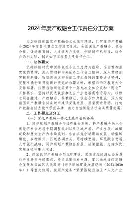 2024年度产教融合工作责任分工方案为加快推进国家产教融合试点城市建设,扎实推动产教融合2024年度各项重点工作落实落地,全面深化产教融合、校企合作,促进教育链、人才链与产业链、创新链有机衔接,结合自治州实际,制定如下工作要点及责任分工。一、总体要求坚持以新时代中国特色社会主义思想为指导,全面贯彻落实党的精神,深入贯彻和中央经济工作会议精神,深入贯彻落实视察新疆、听取自治区和兵团工作汇报时的重要讲话精神,完整准确全面贯彻新时代党的治疆方略,根据自治区教育大会安排部署,按照自治州党委第十一届九次全体会议和两会工作要求,坚持以促进就业和适应产业发展需求为导向,以推进职普融通、产教融合、科教融汇、校企合作为重点,深入实施国家产教融合试点城市建设深化发展、质量提升行动,打响产教融合试点城市示范品牌,助力自治州经济社会高质量发展。二、工作要点及分工(一)深化产教城一体化发展开创新格局1、同步规划产教融合与经济社会发展。将产教融合纳入全州经济社会发展中期调整规划以及区域发展、产业发展、城镇建设和重大生产力布局规划。结合实施创新驱动发展、新型城镇化、乡村振兴、区域协调发展、可持续发展、军民融合发展、人才强州战略,同步规划产教融合发展、政策措施、支持方式、实现途径和重大项目。2、抓紧抓实产教融合型城市建设。聚焦适应经济社会发展和产业转型升级需求,抢抓兵团向南发展、军兵油地援深度融合发展和自治区人民政府《若羌新城建设发展规划(2023-2030年)》等重大机遇,按照州党委紧紧围绕自治区入大产业集群、在继续抓实自治州三大任务、突出五个抓手、主攻七大战场的基础上,培育五大优势产业集群,构建中轴隆起、两翼齐飞、多点联动发展格局,加快建设教育医养新区、经济技术开发区、高新技术产业开发区产教融合示范园区。3、统筹职业教育与区域发展布局。统筹推进职业院校布局结构调整及优化,打造现代职业教育集聚区,实现全州职业教育集约化、规模化发展。依托重点园区,共建一批产学研创一体化的重点实验室、工程技术中心和科研成果转化创新服务基地。加强配套改革探索,通过共建特色产业学院、虚拟仿真实训中心,成立双师工作室、院士工作站,实现产业、行业、企业、职业、就业五业联动机制,聚力产教脉合实体化运作。4、促进高等教育融入区域创新体系。支持高校整合各类资源、平台、要素,与行业骨干企业、中小微创新创业型企业建立紧密协同的创新生态系统,增强创新中心人才集聚和牵引产业升级能力。把高等学校创新创业教育和学生创新创业活动与专业教育、教师科研及其成果转化有机结合起来,实施大学生创新创业训练计划项目,积极参与互联网+大学生创新创业大赛和各类学科创新竞赛活动,加快高等学校众创空间建设,促进高校科技创新成果转化和科教融合育人,推进产学研用深度融合。5、推进产教融合赋能产业转型升级。鼓励引导职业院校优先发展先进制造、新能源、新材料、生物技术、人工智能等产业需要的一批新兴专业,加快建设护理、康养、托育、家政等一批人才紧缺的专业,改造升级冶金、医药、建材、轻纺等领域的一批传统专业,撤并淘汰供给过剩、就业率低、职业岗位消失的专业。支持新疆科技学院按照优文科、扩工科、兴医科的办学思路,以一流本科专业建设带动学科专业群的协同发展,新增物联网工程、非织造材料与工程、中药资源与开发、精细化工、养老服务管理专业,增强服务产业链的适应性。巴音郭楞职业技术学院新增材料工程技术、网络直播与运营2个专业;新增畜牧兽医、石油化工、服装设计与工艺、食品智能加工技术4个2+3高本贯通专业。X学校年内实现与X学校联合申报产品艺术设计 3+2中高贯通专业、X职业技术学院联合申报社会体育 3+2中高贯通专业。努力打造自治州职业学校产教融合特色专业(群),实现一校一群一产业,即一个职业院校至少建设一个围绕自治区八大产业集群布局、环塔里木经济带建设,聚焦州党委七大战场主攻方向产业的特色专业群;一个专业群紧密对接一个重点产业。(二)深化产教融合校企合作取得新成效6、抓紧抓实产教融合型企业培育。企业是经济活动的主体,企业主体作用的发挥直接影响着产教融合的质量和水平。要用好我州制定出台的产教融合10 条组合式激励措施,发挥企业的重要办学主体作用,激发企业参与职业教育的积极性和主动性。要抢抓国家发改委到2025年培养1万家以上的产教融合型企业机遇,力争每批次我州至少有5家企业纳入自治区级培育名单,有1-2家纳入国家产教融合型企业名录。积极引导各类行业龙头企业依法参与校企合作,特别是国有企业和行业骨于企业要发挥引领示范作用,更加积极主动的深度参与职业院校专业规划、教材开发、教学设计、课程设置、实习实训,促进企业需求融入人才培养各环节,加快形成产教良性互动、校企优势互补的产教深度融合