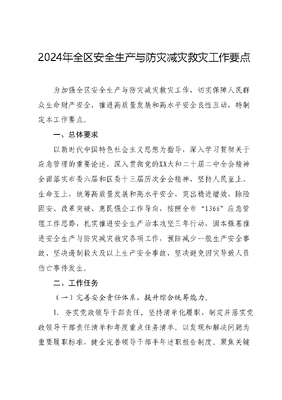 2024年全区安全生产与防灾减灾救灾工作要点为加强全区安全生产与防灾减灾救灾工作,切实保障人民群众生命财产安全,推进高质量发展和高水平安全良性互动,特制定本工作要点。一、总体要求以新时代中国特色社会主义思想为指导,深入学习贯彻关于应急管理的重要论述,深入贯彻党的XX大和二十届二中全会精神全面落实市委六届和区委十三届历次全会精神,坚持人民至上、生命至上,统筹高质量发展和高水平安全,突出稳进增效、除险固安、改革突破、惠民强企工作导向,按照全市1366应急管理工作思路,扎实推进安全生产治本攻坚三年行动,固本强基推进安全生产与防灾减灾救灾各项工作,预防减少一般生产安全事故、坚决遏制较大及以上生产安全事故,坚决避免因灾导致人员伤亡事件发生。二、工作任务(一)完善安全责任体系,提升综合统筹能力。1.夯实党政领导干部责任。坚持清单化履职,制定并落实党政领导干部责任清单和年度重点任务清单。以发现和解决问题为重要履职标准,健全完善领导干部半年述职报告制度。聚焦关键时段、重要节点、重大问题、重大险情等事项,建立完善党政领导干部统筹调度、专题研究等制度,实现科学应对。加强党政领导干部履职监督和考核,强化结果运用,着力解决作风不严不实等问题。2.加大统筹协调力度。加大区安委会、区减灾委统筹抓总力度,推进综合监管规范化建设和能力提升。统筹抓好工作安排部署、部门职责分工梳理,着力解决重点行业领域、重点区域、重点企业、重要环节存在的突出问题。充分发挥各专项办公室牵头部门专业优势,赋予其部分考核、约谈提醒等职责,强化其专项统筹力度。着力发挥专项指挥部组织协调、会商研判、调度指挥作用,完善灾前递进式预报预警、灾中预警响应联动、灾后点对点指导恢复重建机制。3.落实部门监管责任。聚焦企业安全生产主体责任,完善综合监管、行业监管、专业监管和属地监管共同发力的监管体系,形成监管合力。按照三管三必须谁主管谁负责、谁审批谁负责以及业务相近原则,持续厘清新经济业态下和机构改革后部门安全监管职责,消除监管盲区。自然灾害防治部门要发挥好专业优势,进一步强化自然灾害防灾减灾工作。对工程建设活动引发的地质灾害风险,按照谁引发谁治理的原则,落实防治责任。4.强化企业主体责任。推进安全生产标准化建设,全面建立安全风险分级管控和隐患排查治理双重预防机制。以一线岗位人员为基础、技术负责人为重点,强化全员安全生产责任制落实。健全监管责任人公示和履职评估制度,统一公示行政负责、行业监管、专业监管、企业(单位)4个责任人,对一企多牌实施整合。健全重大风险管控责任人和措施公示制度,在风险较大的场所、设施和部位,统一公示分管负责人、部门负责人、直接责任人和风险管控措施。5.强化企业主要负责人履责。推动企业主要负责人(实际控制人)的第一责任人安全责任量化和履职评估,发挥好关键少数作用。加强安全生产法律法规、特别是主要负责人法定职责的宣传培训,督促企业主要负责人学法懂法。将企业第一责任人全程参与标准化建设的履职情况作为现场评审重要指标,树立第一责任人抓标准化建设的优秀典型,推动在学法懂法的基础上守法履责。研究制定《企业主要负责人执法检查重点事项表》,坚持监管执法逢查必考,突出对第一责任人的处罚,严格执行安全生产失信行为联合惩戒制度,推动主要负责人懂红线意识,懂法律法规要求,懂本企业安全重点,懂同行业典型事故案例,严格落实第一责任人责任。(二)完善制度机制体系,提升监管执法能力。6.规范监管执法。运用应急监管执法平台对监管执法实施全过程监督,实现一网统管、上下衔接、分级负责、提高效能。加大对企业主要负责人履职行为的监督执法力度,围绕重大风险、重大隐患和突出违法行为编制执法计划和检查方案,严格开展检查诊断、行政处罚、整改复查三部曲闭环执法,依法采取联合惩戒、一案双罚等措施,严厉查处安全生产违法行为。围绕执法检查、问题查找、经济处罚三个强度,推动执法量提升,落实安全生产行刑衔接制度,严惩严重危险作业行为。推动执法技术检查员招录工作,解决基层执法人员专业性不足的问题。7.加强帮扶服务。全面推进严格规范公正文明执法,营造公平的市场竞争环境。开展企业主要负责人培训,组织开展企业安全管理经验交流大讲堂活动,邀请优秀企业主要负责人现身说法。创新小微企业安全治理模式,推动核心企业与产业链企业、行业区域内企业互助协作。大力发展安全生产专业技术服务市场,鼓励企业购买技术服务,推动企业购买安全生产责任保险,落实对标杆企业在安全生产责任保险和工伤保险费率、信贷信用评级等方面的激励政策。8.严肃事故调查和灾害调查评估。严格落实事故调查和灾害调查评估规范,规范调查行为,提高调查质量。坚持有案必查一案双查、三责同追、四不放过,严肃对生产安全事故进行调查处理。加