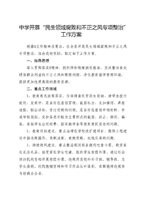 中学开展民生领域腐败和不正之风专项整治工作方案根据X文件精神及要求,在全县开展民生领域腐败和不正之风专项整治,结合我校实际,制定如下工作方案。一、指导思想深入贯彻落实X精神,把纪律和规矩挺在前面,坚决整治查处侵害群众利益的不正之风和腐败问题,净化教育教学管理环境,提供更加优质高效的教育资源。二、重点工作领域1、教育惠民政策落实。全面排查在贫困生资助、助学金拨付使用、发放中,是否存在虚报冒领、截留私分、克扣挪用、弄虚造假、假公济私、贪污受贿的问题。是否存在虚报申领材料、串通审核报批、克扣各类补贴为主要形式的截留、挤占、挪用、骗取、套取学生公用经费、国家助学金等教育惠民资金的问题。2、教育项目建设。重点治理在学校改扩建项目、维修工程建设中搞违规操作、失职渎职、索贿受贿,权钱交易的问题。3、师德师风建设。重点整治利用职务便利吃拿卡要、收受家长礼金礼品、接受家长学生吃请。组织学生有偿补课、通过社会培训机构变相开展有偿补课,违规开设校外补习班、辅导班。为学生推销、代购教辅资料和学习用品从中谋利。在职教师违规参与经商办企业。4.收费项目。重点治理巧立名目、扩大范围、提高标准乱收费,违规收取补课费、赞助费,在新生入学招生录取中以权谋私收受贿赂的问题。5.物资物品采购。重点整治在教学设备、大宗物资集中采购中,不按规定招投标,搞暗箱操作谋取私利。在招投标过程中违规操作、索贿受贿;违反规定私自截留、挪用、侵占公用物资问题。三、工作方法及步骤专项整治工作从X年4月至X年12月(一)全面宣传动员(4月底前完成)召开教职工大会学习传达稷办【X】12号文件精神。召开校委会研究制定民生领域腐败和不正之风专项整治工作方案,通过学校网站、显示屏、微信群、等多种形式加强宣传引导,开展廉政警示教育,让广大教职员工、学生家长知晓、支持、参与专项整治工作,营造良好的外部环境。(二)自查自纠阶段(5月底前完成)。聚焦本次整治的重点任务,对校党委履行从严治党主体责任管理使用项目资金等情况进行全面清理自查,通过信访举报、专项清理、明察暗访等形式发现可能引发腐败的问题,坚持边查边改、立查立改,对检查发现的侵害群众利益的问题,情节轻微尚不构成违纪的,运用好执纪第一种形态,通过批评教育,督促改正消除不良影响,对于涉嫌违纪违法的问题线索,建立问题文可居文库——海量学习资料,手机电脑均可下载www.wenkeju.com台账,按照执纪监督程序报上级纪检组织审查,配合上级纪检组织快查严处,坚持发现一起、查实一起、问责一起,绝不姑息迁就、包庇隐瞒。对在专项治理期间依然不收敛、不收手、顶风违纪,一律加重从重处理,决不搞特殊例外,决不搞下不为例,让顶风违纪的人付出终身难忘的代价。(三)配合督导检查(6月底前完成)。全校各处室、各部门应强化责任意识,积极配合校党委开展好整治各项工作。各处室、各部门要对专项整治工作中发现的问题进行深入分析,开列问题清单、整改清单和责任清单,强化措施,严格整改。校党委应做好工作的组织牵头协调,认真调查处理上级纪检组织交办督办的问题线索。(四)治理提升阶段(12月底前完成)。及时总结提炼好的经验做法,针对专项整治中发现的系统性、普遍性问题及监管方面存在的问题和漏洞,建立健全相关制度规定,规范程序流程,强化教育、教学、管理的公开透明度,巩固整治工作的成果。四、工作要求1、夯实主体责任。校党委是专项整治的责任主体,校党委书记为第一责任人,负责牵头抓总切实履行全面从严治党主体责任认真研究落实整治工作方案,明确各校级领导、处室部门的责任分工,定期督导整治工作时序进度,狠抓整治整改的落实落地。2、强化监督责任。校党委要认真履行监督责任,强化监督执纪问责,协调组织各部门紧密配合,上下联动开展自查自纠。主文可居文库——海量学习资料,手机电脑均可下载www.wenkeju.com动加强与上级纪检组织的沟通衔接,强化问题线索的上报、管理处置,加强对整治各项具体工作的督查督导。3、落实责任分工。学校校级班子成员和各部门处室要按照分工,认真排查职责范围内可能发生的侵害群众利益的问题,对普遍存在的管理机制漏洞问题,及时反馈校党委会研究。对制度执行不力,监管不位产生的问题,及时制定落实整改措施,做到排查不留死角,整治不留空白,落实全程留痕、可追可查。4.强化社会监督。畅通监督渠道和途径,主动公开整改进度及时通报整改问题,对整改工作推进不力,走过场走形式的,自查自纠敷衍了事甚至包庇隐瞒问题线索,整改处理避重就轻落实不到位的,将严格追究责任,以严肃问责倒逼责任落实。文可居文库——海量学习资料,手机电脑均可下载www.wenkeju.com
