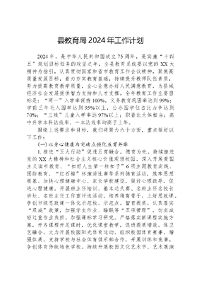 县教育局2024年工作计划2024年,是中华人民共和国成立75周年,是实施十四五规划目标任务的攻坚之年,全县教育系统要以党的XX大精神为指引,认真贯彻国家和省市教育工作会议精神,聚焦高质量发展目标,着力夯实教育基础,持续提升教师队伍素质,努力提高教育教学质量,全心全意办好人民满意教育,为县域经济社会发展提供智力支持和人才支撑。全年教育工作主要目标是:两一入学率保持100%,义务教育巩固率达到99%;学前三年毛入园率达到95%以上,公办园学位占比力争达到70%;三残儿童入学率达97%以上;职普比大体相当;高中升学本科达线率、一本达线率均高于上年。围绕上述要求和目标,我们将聚力六个方面,重点做好以下工作:(一)以身心健康为突破点强化五育并举1.推进五大行动促进五育融合。德育为先。持续推进党的XX大精神和社会主义核心价值观进校园,深入开展爱国主义读书教育、扣好人生第一粒扣子6项主题教育实践、国防教育、红石榴杯演讲比赛等系列德育活动,筑牢思想根基。加快心理健康中心、家长学校建设,做好心理疏导,促进心理健康。开展班主任培训、基本功大赛、名班主任名校长讲坛、名班主任工作室评选活动,培养德育骨干。上好思政课,争创市级思政课一体化示范校、示范点。智育提质。认真落实双减政策,加强学生作业、睡眠等五项管理,切实减轻过重作业负担。加强课标学习研究,严格落实新课程实施方案,开齐课程开足课时,优化课堂教学,促进提质增效。体卫艺融合。大力开展校园阳光体育运动,组织校园体育赛事,增强体质。支持学校与社会体育俱乐部合作,开展训练和竞赛,争创体育传统特色学校。持续开展校园文化艺术节、艺术展演活动,提高学生审美素养。加强卫生健康教育,落实晨午检及因病缺勤追踪制度,强化传染病防控。定期开展体检、军训、近视防控、体质健康监测,促进体卫艺融合。劳动促进。落实国家课程计划,培训劳动教育骨干,上好劳动教育课,开发校本课程,丰富劳动教育内容。因校制宜创建实践基地,组织开展校内外劳动实践。家校携手,制定劳动清单,倡导家庭劳动教育。加强文明校园、书香校园、绿色校园、卫生校园建设,努力形成一校一品特色,提升办学品位,营造良好育人氛围。2.坚持教育教学中心地位。学校工作要以提高教育教学质量为中心。深化教育教学改革,坚持素养导向,把学科素养落实到具体教育教学活动中,培养学生正确价值观、必备品格和关键能力。改革课堂教学模式,注重启发式、互动式、体验式教学,创设以学生为中心的课堂教学氛围,促进深度学习。加强教学常规管理,落实义务教育教学指导意见,规范教学设计,提高备课质量。执行作业设置与批改基本要求,科学设计作业,提高作业质量,减轻作业负担。规范考试工作,严格控制考试次数,降低考试难度,对考试成绩实行等级评价,严禁公开学生成绩和排名。3.提升各学段教学效益。学有方法,教有要求。各学段要充分发挥教坛新星、骨干教师、名师名校长辐射带动作用,积极参加、观摩省级教研江淮行-皖美课堂活动,加强教育教学研究。普通高中要深化新高考一核四层四翼研究,凝练学科核心素养,提高备考实效。依托普通高中学科核心组开展教学研究,继续做好新课程、新教材、新高考培训,做好高三复习研讨、质量检测工作。初中阶段要加强课标培训,研读课程标准,优化教学设计,提高备课上课效率。扎实做好教学业务督查、中考成绩分析、九年级模考、教学质量监测、学生综合素质评价等工作。小学阶段要加强理想课堂研究,通过师生读书、亲子共读,撰写教育随笔、教育叙事等,创设师生共同学习良好氛围,营造书香校园。充分发挥小教办教研职能作用,扎实开展分片教研、名师送教、思政课一体化建设等工作,实施小初衔接行动,落实零起点教学。学前教育坚持以游戏为基本活动,依托安吉游戏本土化实践,加强游戏课程研训,继续扩大试点规模,评选特类园,常态化推进幼小科学衔接学前教育宣传月,全面提高幼儿保教质量。(二)以提质扩优为着力点夯实教育基点1.推进学前教育普及普惠。启动学前教育普及普惠发展达标验收工作,持续开展安心托幼行动,新增公办园学位数630个,大幅提高公办园幼儿占比。大力推进托幼一体化建设,实现20%以上的幼儿园开设2-3岁托班。丰富幼儿延时服务内容,实现有需要的幼儿全覆盖。2.推进义务教育优质均衡。着眼人口变化趋势,加强前瞻性布局。以学位供给为突破口,优化整合城区教育资源,重点新建改扩建5所学校,整合2所小学,着力解决两一入学学位紧张问题。深入推进义务教育薄弱环节改善与能力提升工作,加大乡镇初中、九年一贯制学校和中心小学等3类学校标准化建设。深入落实集团化办学等举措,推进实施皖北地区基础教育优质资源扩容工程,实施优质教育资源引入和培育计划,支持马店、长集、周集等中心小学与省内外优质学校合作办学,扩大优质教育资源覆盖面,