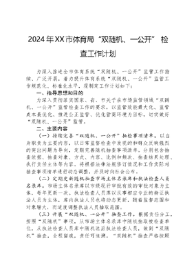 2024年XX市体育局双随机、一公开 检查工作计划为深入推进全市体育系统双随机、一公开监管工作持续、广泛开展,着力提升体育系统双随机、一公开监管工作规范化、标准化水平,现制定工作计划如下: 一、指导思想和目的为深入贯彻落实国家、省、市关于在市场监管领域双随机、一公开监管检查工作的要求,以监管效能最大化、监管成本最优化、推进公正监管、优化营商环境为目标,切实做好双随机、一公开监管。二、主要内容(一)持续完善双随机、一公开抽检事项清单。以自身职责为主要内容,以日常监督检查中发现的和群众反映强烈的突出问题为导向,定期完善随机抽查事项清单。分别包含抽查依据、抽查对象、方式、内容、比例和频次、抽查结果处理、执行责任主体等内容。将根据法律法规修订情况和工作实际对抽查事项清单进行动态调整,并及时向社会公布。(二)定期更新随机抽查市场主体名录库和执法检查人员名录库。市场主体名录库以市级现行审批有效的审批对象为主体,每年更新一次。执法检查人员库以从事相应专业的持证执法人员为主体,库内执法人员也将动态更新,随着监督范围和对象增大,而适度调整执法人员抽取范围。(三)开展双随机、一公开抽查工作。根据责任分工,按照双随机事项,从市场主体名录库中随机抽取被检查单位,从执法检查人员库中随机选派执法检查人员,做到双随机抽查,全程留痕,责任可追溯。双随机抽查严格按照规定的比例和频次开展,不扩大比例、不缩小范围,确保抽检公正有序。(四)结果录入并公示。现场检查结束后,执法检查人员要按照相关的规范要求,坚持审慎、依法的原则,认定检查结果,形成最终检查结论,并对检查结论负责。按照谁检查、谁录入、谁公示的原则,执法检查人员要在规定时限内将检查结果录入山东省政府部门联合双随机、一公开监管平台进行公示。三、要求(一)加强组织领导。要高度重视年度检查工作,按照工作要求,合理统筹时间,加强联系沟通,认真落实各项工作任务,做到计划完成率、信用风险分类结果应用率、标签化管理应用率、移动端应用率、部门联合抽查率达到100%,杜绝重复抽查率。(二)加强服务引导。进一步强化服务意识,最大程度减少对检查对象正常经营活动的干扰。依法实施包容审慎监管,对轻微违法行为,引导企业自觉改正。(三)严守工作纪律。执法检查人员必须自觉遵守中央八项规定精神和廉洁自律各项要求,严格执行工作纪律、保密纪律和群众纪律。