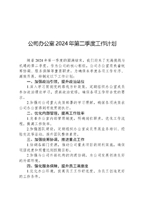 公司办公室2024年第二季度工作计划随着2024年第一季度的圆满结束,我们迎来了充满挑战与机遇的第二季度。作为公司的核心枢纽,公司办公室肩负着统筹协调、服务保障等重要职责。为确保本季度各项工作有序、高效开展,特制定以下工作计划:一、加强政治引领,提升政治站位1.深入学习贯彻党的路线方针政策,定期组织办公室成员参加政治理论学习,提高政治觉悟,确保各项工作符合党的要求。2.加强对公司重大决策部署的学习理解,确保各项决策在公司办公室得到有效贯彻执行。二、优化内部管理,提高工作效率1.完善办公室内部管理制度,明确岗位职责,优化工作流程,提高工作效率。2.加强团队建设,定期组织办公室成员开展业务培训、经验交流等活动,提升团队整体素质。三、加强统筹协调,推进重点工作1.协调各部门资源,推动公司重点项目的顺利实施,确保项目进度和质量达到预期目标。2.加强与公司外部机构的沟通协调,为公司发展创造良好的外部环境。四、强化服务保障,提升员工满意度1.优化办公环境,提高员工工作舒适度,为员工创造更好的工作条件。2.加强员工福利保障,关心员工生活,提高员工归属感和满意度。五、加强信息安全与保密工作1.完善信息安全管理制度,加强信息安全培训,提高员工信息安全意识。2.严格执行保密规定,确保公司机密信息不被泄露。六、具体工作计划及时间安排1.第二季度初,组织办公室成员开展政治理论学习,学习党的最新理论成果和方针政策,提高政治站位。2.第二季度中,完善办公室内部管理制度,明确各岗位职责,优化工作流程,提高工作效率。同时,组织办公室成员开展业务培训,提升团队整体素质。3.第二季度末,全面梳理公司重点项目进展情况,协调解决项目推进过程中遇到的困难和问题,确保项目按期完成。同时,加强与外部机构的沟通协调,为公司发展创造良好的外部环境。在加强服务保障方面,我们将持续关注员工需求,优化办公环境,提高员工工作舒适度。同时,加强员工福利保障,关心员工生活,定期组织员工活动,增强员工凝聚力和归属感。在信息安全与保密工作方面,我们将严格执行信息安全和保密规定,加强信息安全培训,提高员工信息安全意识。同时,加强信息安全检查,及时发现和消除安全隐患,确保公司信息安全。七、强化监督检查,确保计划执行到位为确保本季度工作计划的顺利执行,我们将加强监督检查力度,确保各项任务得到有效落实。具体措施如下:1.建立定期汇报制度,要求各部门定期向公司办公室汇报工作进展情况,以便及时掌握工作动态,发现问题并督促整改。2.加强现场检查,定期对公司重点项目和关键环节进行实地检查,确保工作质量和进度符合预期目标。文可居文库——海量学习资料,手机电脑均可下载www.wenkeju.com3.建立奖惩机制,对在工作中表现突出的部门和个人给予表彰和奖励,对未能按时完成任务或工作质量不符合要求的部门和个人进行问责和惩处。八、总结与展望通过本季度的工作计划,我们期望能够进一步加强公司办公室的统筹协调能力,提高工作效率,优化服务保障,为公司的发展提供有力支持。同时,我们也将不断总结经验教训,不断完善工作计划和管理制度,为公司未来的发展奠定坚实基础。展望未来,我们将继续坚持以员工为本、以客户需求为导向的理念,不断提升公司办公室的服务水平和专业能力。同时,我们也将密切关注市场动态和行业发展趋势,及时调整和优化工作计划,确保公司始终保持竞争优势和市场地位。总之,公司办公室将全力以赴完成本季度的工作任务,为公司的发展贡献自己的力量。我们相信,在全体员工的共同努力下,公司一定能够迎来更加美好的明天。以上便是我们公司办公室2024年第二季度的工作计划。我们将以饱满的热情、务实的作风和高效的执行力,确保各项任务得到圆满完成,为公司的发展做出新的更大贡献。同时,我们也期待与各部门加强沟通协作,共同推动公司事业的蓬勃发展。文可居文库——海量学习资料,手机电脑均可下载www.wenkeju.com