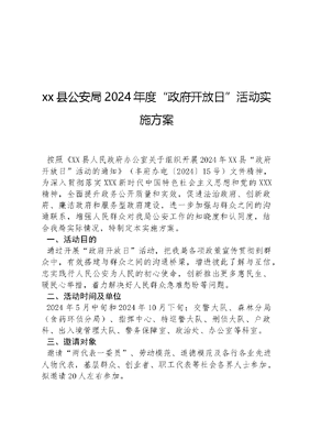 xx县公安局2024年度政府开放日活动实施方案按照《XX县人民政府办公室关于组织开展2024年XX县政府开放日活动的通知》(丰府办电〔2024〕15号)文件精神,为深入贯彻落实XXX新时代中国特色社会主义思想和党的XXX精神,全面提升政务公开质量和实效,促进法治政府、创新政府、廉洁政府和服务型政府建设,进一步加强与群众之间的沟通联系,增强人民群众对我局公安工作的知晓度和认同度,结合我局实际情况,特制定本实施方案。一、活动目的通过开展政府开放日活动,把我局各项政策宣传贯彻到群众中,有效搭建与群众之间的沟通桥梁,增进彼此了解与互信,忠实践行人民公安为人民的初心使命,创新推出更多惠民生、暖民心举措,着力解决好人民群众急难愁盼等问题。二、活动时间及单位2024年5月中旬和2024年10月下旬;交警大队、森林分局(食药环侦分局)、指挥中心、特巡警大队、刑侦大队、户政科、出入境管理大队、警务保障室、政治处、办公室等科室。三、邀请对象邀请两代表一委员、劳动模范、道德模范及各行各业先进人物代表,基层群众、创业者、职工代表等社会各界人士参加,拟邀请20人左右参加。四、活动内容及形式(一)实地观摩1.各位代表参观政务服务办事大厅、执法办案中心等工作情况,由专人介绍部门结构设置、主要职能、办事程序;(二)座谈交流1.局三楼会议室召开座谈会,向公众介绍本单位业务工作、队伍建设开展等情况;2.广泛听取社会各界的意见和建议,各位代表为我县公安工作建言献策。(三)联系方式XX县公安局办公室:0794-322XXX五、工作要求(一)提高认识,加强领导。为推进政府开放日活动深入开展,涉及本次政府开放日活动的有关单位部门要高度重视,精心组织实施,将本次活动列为本单位重要工作日程,明确时间安排、参加人员、活动方式等内容,提前做好活动安排,明确公开内容,做好与各位代表及群众的讲解互动工作。(二)结合实际,务求实效。从实际出发,确定活动内容和具体方式,认真组织宣传活动,营造良好氛围,合理确定政府开放日的活动内容和具体方式,进一步提升廉洁高效行政水平的客观要求,扎实抓好政府开放日活动,从而提升活动的针对性和实效性。(三)广泛宣传,做好总结。在活动日开放期间,结合公安工作实际,积极通过公众号、宣传栏等形式,要加大宣传力度,提高公众知晓度。活动结束后,对活动进行认真总结,特别是加强对政府开放日推动解决群众反映强烈的难点、热点问题的典型进行总结,并拿出可行的解决措施。同时,做好资料收集整理工作。文可居文库——海量学习资料,手机电脑均可下载www.wenkeju.com