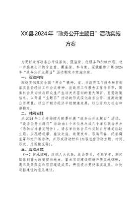 XX县2024年政务公开主题日活动实施方案为更好发挥政务公开促落实、强监管、优服务的积极作用,进一步提高公开的含金量、覆盖面、参与度,现就组织开展2024年政务公开主题日活动制定本实施方案。一、活动内容围绕贯彻落实全国两会精神、省、市政府工作报告和贯彻落实县委经济工作会议精神、县政府工作报告工作任务等,聚焦社会关切或与群众生产生活关系密切的重大项目、重要政策信息,以开展主题日活动的形式深化政务公开,提高政策公开质量,以公开助力经济平稳健康发展,以公开助力社会和谐稳定。二、时间安排从2024年3月开始按月部署开展政务公开主题日活动。政务公开主题日活动由1个单位承办或几个单位联合承办(活动安排表见附件),请各单位结合工作实际自行确定活动主题,以现场观摩、座谈交流、政策发布、咨询问答、问卷调查等形式开展活动,并形成活动材料(内容包括活动主题、时间、形式、开展情况等)。三、活动形式(一)实地调研。组织人大代表、政协委员、专家学者、新闻媒体到重大政策提出地点、重点项目建设现场开展实地调研,展示政策落实和项目建设成果,研究提出更好落实政策、加快项目建设的意见建议。(二)现场观摩。邀请人大代表、政协委员、专家学者、新闻媒体或普通市民现场观摩办事服务,场景式体验式展示相关办事流程和服务举措,推广更加便捷的办事服务方式。(三)座谈交流。采取召开座谈会的形式,向人大代表、政协委员、专家学者、新闻媒体或普通市民介绍本单位重点、亮点工作推进情况,主动接受监督、听取意见建议。(四)政策发布。结合重大政策的制定出台,采取举办新闻发布会、开展政策宣传活动等方式,向社会公众面对面解读、互动式公开。(五)问卷调查。结合本单位主责主业,面向社会组织开展线上或线下问卷调查。通过问卷调查,掌握政策实施情况、存在问题及群众反映诉求等。四、组织保障(一)加强组织领导。政务公开主题日活动是打造XX政务公开品牌的重要举措之一,活动开展情况将纳入2024年全县政务公开绩效考核范围。各单位要高度重视,精心组织实施,确保活动取得实效。各单位要进一步创新公开的形式、丰富公开的内容、夯实公开的抓手。(二)突出公开主题。突出政务公开主题日活动的公开属性,不断扩大活动参与面和受众面。同时,通过活动的开展,做好政策信息发布解读工作,并在社会普遍关注的热点问题上主动发声、解疑释惑,以更好稳定市场预期、增强社会信心。(三)广泛宣传推介。各单位要注重活动宣传,增强社会反响,提升活动开展的社会效益。要通过在新闻媒体发布宣传报道、在政府网站开设活动专栏、在政务新媒体发布活动消息等方式,持续扩大政务公开主题日活动影响力,营造全社会知晓、全社会评价、全社会参与的活动氛围。文可居文库——海量学习资料,手机电脑均可下载www.wenkeju.com