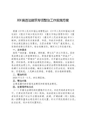 XX镇违法建筑专项整治工作实施方案根据《中华人民共和国土地管理法》《中华人民共和国城乡规划法》《重庆市城乡规划条例》《重庆市物业管理条例》《重庆市查处违法建筑若干规定》(重庆市人民政府第282号令)精神,按照国务院决策部署、市委、市政府和县委、县政府关于违法建设整治工作要求,为坚决遏制两违蔓延势头,扎实推进我镇品质提升,结合我镇实际,制定本工作实施方案。一、总体要求按照消存量、遏增量、建机制、管长远的工作要求,坚持违法建设查人和查事相结合,聚焦存量违法建筑净减少、新增违法建筑零增加的总体目标,对存量违法建筑分类处置、序时推进,新增违法建筑坚决制止、强制拆除,全面推动违法建筑治理工作,助推我镇违法建设治理形势得到根本好转,违建行为得到根本遏制,确保全镇建设行为符合规划、做到规矩、实现规范,人民群众获得感、幸福感、安全感持续增强。二、整治时间2024年X月—X月,并长期坚持。三、整治对象全镇范围内的存量违法建筑和新增违法建筑。四、处置程序和方式(一)存量违法建筑的处置程序及方式。未经用地或者规划许可,已建成使用的建(构)筑物,包括经竣工规划核实确认或者取得房屋产权证件后擅自新建、改建、扩建的建(构)筑物,统一按照存量违法建设进行分类处置。针对不同类别进行分类,依法依规、逐步逐项处置到位。(二)新增违法建筑的处置程序及方式。依照《重庆市查处违法建设若干规定》(重庆市人民政府第282号令),对新增违法建设实行即查即治,及时对施工现场查封或强行制止、强制拆除直至消除,原则上在15个工作日内予以消除。健全镇、村两级巡查机制,完善违法建筑基层巡查网络。并在第一时间对村报告的情况进行现场复核,制止违建当事人继续施工并现场监管,引导当事人自愿配合拆除违法建设,并及时向XX镇人民政府报告。由具有违法建设查处职责的相关板块职能岗位负责对我镇报告的违法建设行为进行调查取证并出具执法文书,负责相关案件的办理、移交、移送工作。由XX镇人民政府及时组织力量实施强制拆除,并做好台账登记、保管等相应工作。五、职责分工(一)经济发展板块1.镇两违办:负责组织领导安排部署、统筹协调调度、目标任务考核、督导检查奖惩等工作;负责研究重大复杂违法建筑案件的处理工作,协调解决工作推进中遇到的问题;负责指导全镇各单位开展违法建筑管控整治工作;负责对疑似违法建设卫片图斑交办核查处置工作。2.村镇规划建设岗:负责组织查处专门管理区域范围外、属规划城镇建设用地范围内、已征收为国有土地上的城市违法建设;负责办理全镇规划区城镇建设用地范围内的未进入规划审批程序的违法建筑案件;负责移送违建公职人员及违建当事人公共信用信息管理;负责全镇违法建筑管控工作的业务指导,配合各单位实施违法建(构)筑物拆除。3. 农经农技岗:负责组织查处专门管理区域范围外、属规划城镇建设用地范围外的违法建设,以及规划城镇建设用地范围内、仍为集体土地上的农村违法建设;负责对非法占用土地行为修建违法建筑进行查处;负责按照谁审批、谁负责原则,查处规划城镇建设用地范围内进入规划审批程序的违法建设;负责对非法开挖山体、非法交易买卖土地进行查处。负责查处文可居文库——海量学习资料,手机电脑均可下载www.wenkeju.com居民自建房占用公共空间、侵占消防通道、破坏消防设施、影响消防安全的违法建筑行为;负责配合相关单位实施违法建(构)物拆除工作提供安全文明技术指导;负责对公路建筑控制区内的违法建设进行调查摸底和依法查处,并配合其他板块职能岗位实施违法建(构)物拆除工作。负责查处农村居民非法占用土地建设住宅的行为;负责指导监督我镇做好农村宅基地管理及违法用地整改。负责对占用河道、水库和渠道管理范围内的违法建设行为进行调查摸底和依法查处,并配合其他板块职能岗位实施违法建(构)物拆除工作。负责对占用风景名胜区保护范围内存量违法建设行为或非法占用林地进行调查摸底和依法查处,并配合其他板块职能岗位实施违法建(构)物拆除工作。(二)党的建设板块1.纪检监察岗:负责按照干部管理权限等有关规定对违建相关人员进行问责和处理,强化对我镇、各村的工作纪律监察;负责对参与违法建设且不按要求进行整改的党员干部和财政供养人员实施纪律责任追究。2.党政文秘岗:协助领导小组在我镇考核过程中征求县两违办建议或意见,对单位干部职工参与或实施违法建设,不得评优评先。协助领导小组将拒不履行违法建筑处罚决定的违建企业或人员纳入信用管理体系,列入失信人员名单进行管理,实行联合惩戒,信用记录归集至公共信用信息平台。(三)平安法治板块负责为查处违法建筑工作提供政策支持和法治保障;负责做好违法建设案件查处的行政复议工作;负责对强制拆除过程进行全程法律公证,不得为违法建筑办理财产公证。(四)各村按照《重庆市查处违法建筑若干规定》(