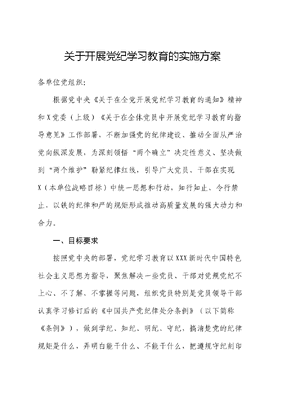 关于开展党纪学习教育的实施方案各单位党组织:根据党中央《关于在全党开展党纪学习教育的通知》精神和X党委(上级)《关于在全体党员中开展党纪学习教育的指导意见》工作部署,不断加强党的纪律建设、推动全面从严治党向纵深发展,为深刻领悟两个确立决定性意义、坚决做到两个维护勒紧纪律红线,引导广大党员、干部在实现X(本单位战略目标)中统一思想和行动,知行知止、令行禁止,以铁的纪律和严的规矩形成推动高质量发展的强大动力和合力。一、目标要求按照党中央的部署,党纪学习教育以XXX新时代中国特色社会主义思想为指导,聚焦解决一些党员、干部对党规党纪不上心、不了解、不掌握等问题,组织党员特别是党员领导干部认真学习修订后的《中国共产党纪律处分条例》(以下简称《条例》),做到学纪、知纪、明纪、守纪,搞清楚党的纪律规矩是什么,弄明白能干什么、不能干什么,把遵规守纪刻印在心,内化为日用而不觉的言行准则,进一步强化纪律意识、加强自我约束、提高免疫能力,增强政治定力、纪律定力、道德定力、抵腐定力,始终做到忠诚干净担当。X单位全体党员、干部要把党纪学习教育与巩固拓展学习贯彻XXX新时代中国特色社会主义思想主题教育成果结合起来,持续深挖在主题教育中检视到的与党的纪律建设相关的问题,充分利用固化下来的理论学习好经验好做法强化《条例》学习效果;要把党纪学习教育与健全全面从严治党体系结合起来,在做到学纪、知纪、明纪、守纪的同时深化明责、履责、考责、问责,推动纪责同向发力、一体落实;要把党纪学习教育与建设X工作结合起来,以具体的工作任务为载体,以承担任务的党员、干部为对象,提前预判纪律风险,有针对性地开展纪律教育,确保形成清清爽爽的同志关系、风情气正的发展氛围。二、工作安排党纪学习教育从2024年4月开始、7月结束,注重融入日常、抓在经常。主要开展以下三个方面的工作:文可居文库——海量学习资料,手机电脑均可下载www.wenkeju.com(一)要原原本本学,推动《条例》入脑入心。坚持个人自学与集中学习相结合,既注重学习的全面性,也注重学习的实效性,分类分级统筹开展好学习活动。1.以自学为基本形式打好理论基础。各级党组织要对党员、干部自学《条例》在内容、进度、质量等各个方面提出具体要求,各单位党委班子成员要制定个人的自学计划,普通党员要以承诺书的形式明确学习目标和学习任务,基层党支部书记要适时通过谈心谈话等形式了解党员学习实际情况并加以督促指导。2.以党委理论学习中心组、党支部三会一课为主要形式深化学习研讨。各单位党委要通过理论学习中心组、党支部通过党员大会持续开展针对党的政治纪律、组织纪律、廉洁纪律、群众纪律、工作纪律、生活纪律等6个专题的学习研讨,深入检视查摆自身存在的问题及刚刚冒头的苗头性倾向性问题,在学习中找准解决及预防方法,在讨论中明确产生问题的根源并及时加以整改;党支部委员要在支委会会议上先学一步、学深一层,党小组要针对学习中的难点重点不断加强学文可居文库——海量学习资料,手机电脑均可下载www.wenkeju.com习;各单位党委书记要在党纪学习教育启动初期和七一期间各讲一次纪律党课,基层党支部书记结合本支部工作开展情况适时讲一次纪律党课。3.以读书班为重要形式开展专项辅导。各单位党委要在4月底前专门安排至少5个工作日,举办党纪学习教育读书班,对党委班子成员实现全覆盖式强学强记,重点章节现场学、难点内容辅导学、堵点内容讨论学。读书班要以理论文章、实践方案作为学习成果,与实际工作紧密联系、追踪落实。4.以主题党日为创新形式提升学习质效。各基层党支部在党纪学习教育开展期间,每月开展一次以纪律教育为主线的主题党日活动。其中,4月主题为学纪·知行止,5月主题为知纪·筑底线,6月主题为明纪·强短板,7月主题为守纪·共担当,以此形成针对《条例》的学习成果转化完整链条。主题党日要善于与其它学习形式相结合,聚焦统筹深化,兼顾党员、干部及员工群众等不同群体特点。文可居文库——海量学习资料,手机电脑均可下载www.wenkeju.com(二)要加强警示教育,让党员、干部受警醒、明底线、知敬畏。坚持集中性警示大会与常态化警示教育相结合,抓好以案促学,推动以案促改促治。1.持续召开警示教育大会。各单位党委在党纪学习教育期间,每月召开一次覆盖全体党员、干部的警示教育大会。其中,4月聚焦以案说德,5月聚焦以案说纪,6月聚焦以案说法,7月聚焦以案说责。警示教育大会既要有案例展示,也要有案例分析,分组开展讨论交流,确保形成正风肃纪的良好氛围。2.灵活开展警示教育活动。各级党组织要结合实际,深入挖掘本地区本单位的警示教育资源,运用违纪违法干部警示录、忏悔录、警示教育片以及警示教育基地开展警示教育,与三会一课、主题党日