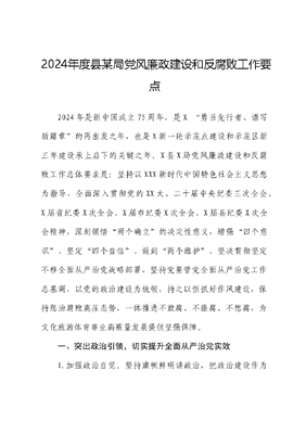 2024年度县某局党风廉政建设和反腐败工作要点2024年是新中国成立75周年,是X 勇当先行者、谱写新篇章的再出发之年,也是X新一轮示范点建设和示范区新三年建设承上启下的关键之年。X县X局党风廉政建设和反腐败工作总体要求是:坚持以XXX新时代中国特色社会主义思想为指导,全面深入贯彻党的XX大、二十届中央纪委三次全会、X届省纪委X次全会、X届市纪委X次全会、X届县纪委X次全会精神,深刻领悟两个确立的决定性意义,增强四个意识、坚定四个自信、做到两个维护,坚决贯彻坚定不移全面从严治党战略部署,坚持党要管党全面从严治党工作总基调,以党的政治建设为统领,持之以恒抓好作风建设,保持惩治腐败高压态势,一体推进不敢腐、不能腐、不想腐,为文化旅游体育事业高质量发展提供坚强保障。一、突出政治引领,切实提升全面从严治党实效1.加强政治自觉。坚持旗帜鲜明讲政治,把政治建设作为全面从严治党、深化党员干部理想信念教育的首要政治任务,常态化开展学习贯彻XXX新时代中国特色社会主义思想主题教育,自觉在思想上政治上行动上同以XXX同志为核心的党中央保持高度一致。充分发挥领导班子和领导干部关键少数作用,定期召开会议,研究部署支部党建和中心重点工作,确保党建和业务工作沿着正确的政治方向迈进。2.严肃政治生活。全面加强和规范党内政治生活,严格执行《关于新形势下党内政治生活的若干准则》,切实落实三会一课、主题党日、组织生活会、民主生活会、谈心谈话、民主评议党员等制度,严把民主生活会、组织生活会质量,用好批评和自我批评利器,加强对党内政治生活状况、党的路线方针政策执行情况、民主集中制等执行情况的监督检查,进一步增强党内政治生活的政治性、时代性、原则性、战斗性。3.打造党建成果。围绕中心抓党建、抓好党建促业务,促进党建和业务融合发展。结合大走访大调研大服务大解题、共联共建、两地报到、网格服务等工作和活动,引导基层党组织把工作落脚点放在为基层办实事、为群众解难题上,全力解决基层重点难点堵点问题,找准文旅体服务中心大局的突破口,以党建引领推动文旅体工作有举措、有成效、有亮点。深化一支部一品牌建设,持续深化支部特色党建品牌培育工作,提升基层党组织的认知度、知名度和美誉度。二、坚持培根铸魂,着力提升党的思想建设水平4.加强理论武装。坚持把学习贯彻XXX新时代中国特色社会主义思想作为首要任务、长期任务,发挥党委理论学习中心组学习第一议题作用,深入开展党的XX大精神和XXXXXX考察X时的重要讲话精神。局党委全年开展党委理论学习中心组学习不少于12次,开展研讨不少于4次,创新学习方式,做好学用结合文章,力求做到思想上零偏差,推进上零温差,行动上零时差。5.加强意识形态。严格落实党委意识形态工作责任制,定期研究部署意识形态工作,分析研判意识形态领域形势和机关党员干部思想状况,加强意识形态阵地的建设和管理,严把文化活动、文创产品等备案审批关,严把党建阵地、信息宣传审核关,确保文旅体领域意识形态安全。6.深化廉政教育。坚持把廉政教育作为党风廉政建设的基础性工作来抓,不断创新载体、丰富内容。对各级重要文件及时传达学习,组织赴廉政教育基地现场观摩,讲廉政党课,开展廉政谈话和工作提醒,利用各类警示教育读本、影像资料、案件通报等经常性开展以案示警,把廉洁从政抓实抓细。加强新时代廉洁文化教育,努力实现廉洁文化建设的广泛覆盖、有效覆盖,营造崇德尚廉、风清气正的良好氛围。三、强化监督质效,全面构筑高效严密廉政体系7.推进作风建设。贯彻落实好中央八项规定及实施细则精神,各级领导干部带头遵守作风建设各项制度,率先垂范,发挥头雁效应。全体干部要讲纪律,讲规矩,严明工作纪律,主动作为,强化责任担当,落实好上级对开展形式主义官僚主义不作为不担当问题专项治理的相关要求,积极主动整改查找的问题,进一步强化作风建设永远在路上的良好治理氛围。配合纪委监委严肃查处党员干部违法违纪问题,真正把对干部的严管厚爱体现到落实主体责任的具体行动中。8.强化风险防控。紧盯干部人事、财务管理、资产管理、大额经费使用、物资采购、评奖评优、基建维修、后勤保障等权力集中、资金密集、资源富集的重点领域关键环节,梳理廉政风险点位,制定防控措施,规范权力运行。结合县委巡察、审计,制定整改措施,做到对账销号、举一反三。加强基层权力监督,常态化开展部门巡查。筑牢制度防线,健全完善财务、内控、采购、工程、招投标等方面廉洁制度。自觉接受人大监督、民主监督,及时处理投诉举报案件,加强信访办理,妥善化解矛盾纠纷。9.完善干部管理。坚持按程序选拔任用干部,严格把好干部选拔任用的动议、民主推荐、组织考察、讨论决定、任职等各环节。坚持德才兼备、以德为先,重实绩、重能力的用人导向,加强干部廉洁考察,对廉洁上有问题