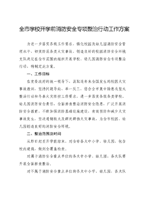 全市学校开学前消防安全专项整治行动工作方案为进一步落实各级工作要求,强化校园及幼儿园消防安全管理水平,切实防范各类火灾事故,创造良好的校园消防安全环境支队决定在全市范围内组织开展学校、幼儿园消防安全专项整治行动,特制定此方案。一、工作目标在党委政府的统一领导下,汲取近年来全国发生的校园火灾事故教训,坚持问题导向、举一反三,结合全市集中除患攻坚大整治行动和冬春火灾防控工作要求,进一步落实各级各类学校、幼儿园消防安全责任,全面排查整治消防安全隐患,广泛开展消防安全教育,不断加强消防基础设施建设,有效预防和减少火灾事故发生,坚决遏制较大及群死群伤火灾事故,为全市校园、幼儿园创造良好的消防安全环境。二、整治范围及时间从即日起至开学前结束,对全市各大中小学、幼儿园,包含校内建筑,做到全覆盖检查。对属于消防安全重点单位的各大中小学、幼儿园,各大队要开展全面排查整治。对不属于消防安全重点单位的各大中小学、幼儿园,各大队要指导公安派出所做好消防安全检查,视情提供消防技术服务。派出所指导科要提请市公安局户政支队发文部署全市公安派出所同步开展此项工作。三、检查重点(一)消防安全条件。学校、幼儿园建筑布局不合理、耐火等级低、消防通道不畅、防火间距不足、防火分隔设施和消防设施缺乏,消防设施无法正常使用。幼儿园、托儿所违规设置在建筑物4层及以上。宿舍楼违规截断疏散通道、锁闭安全出口,在宿舍窗户和安全出口安装铁栅栏且未设置从内部开启的逃生窗。(二)用电管理情况。办公室、宿舍内大量使用小太阳暖脚器、电暖气、空调等大功率电器设备,且宿舍配电设计远远不能满足现实需要,以及不遵守安全用电规定,随意连接插座,私拉乱接电线,无人情况下为电器设备充电,超负荷用电等情况违规停放电动自行车、平衡车并为其充电。(三)易燃可燃物品管理。偏远地区学校、幼儿园违规采用明火取暖,锅炉房设备性能不良,存在爆炸危险。宿舍内大量堆放衣物、床被、桌椅、书籍等易燃可燃物品。食堂燃料储存及使用不规范,油烟管道清洗不及时,集聚大量易燃可燃油污。实验室危化品在领用、登记、使用、回收等环节失控漏管现象。学校幼儿园违规采用易燃可燃夹芯彩钢板搭建附属用房,甚至用作临时宿舍、办公室。(四)日常消防安全制度。学校、幼儿园主要负责人消防安全意识不强,逐级和各岗位消防安全责任制不健全、不落实。消防设施器材未定期维护保养,损坏后未及时维修恢复。日常防火巡查检查不到位,夜间值班与防火巡查未有效结合。消防控制室值班人员未持证上岗,不熟悉应急处置程序。未制定灭火和应急疏散预案,未建立志愿消防队、微型消防站等力量。(五)消防宣传教育培训。学校、幼儿园未认真组织开展消防宣传进课堂,未将消防安全教育纳入教学计划;未达到消防安全教育有教材、有师资、有课时、有场地四有要求;未定期组织开展应急疏散演练;对学生消防安全常识宣传和火灾警示教育不到位。四、工作要求(一)提高思想认识。各地要提高政治站位,高度重视此项工作,深刻认识做好校园和幼儿园消防安全工作的重要性。结合此次排查整治中发现的隐患问题情况,主动会同教育部门、公安派出所对存在消防安全隐患问题的各级各类学校和幼儿园的消防安全责任人、管理人开展一次集中警示约谈和培训,通报学校突出风险和火灾情况,剖析典型案例,讲清法定职责,讲透事故后果,使其充分重视消防安全。对属于重点单位的各级各类学校和幼儿园,要督促明确消防安全工作的资金投入和组织保障方案,强化消防安全主体责任落实。(二)狠抓问题整改。各地要重点整治消防控制系统失灵、消防管线无水、储水设施无法使用;未配备消防水池、灭火器等设施或消防设备已过期;疏散通道、消防通道被占用、堵塞、封闭;消防安全重点部位未确定安全管理员,未进行防火巡查,未定期组织培训演练,未落实消防责任等问题,对于属于消防安全重点单位的和公安派出所移交的隐患问题、违法行为,必须依法依规严肃处理,力争在春季开学前整改完成,不能立即整改、无法确保安全的,用好查封、三停等执法手段,属于重大火灾隐患的,要应立尽立,并函告教育部门采取停用、限用等管控措施,倒逼校园及幼儿园消防安全环境提升。(三)营造浓厚氛围。各地要通过召开会议、采取媒体宣传等多种形式,全方位、多角度地做好校园消防宣传工作。要结合典型案例和本地实际,开展校园及幼儿园主题消防宣传工作,同步推进线上、线下开学季消防第一课。并对属于消防安全重点单位的校园和幼儿园全面开展六熟悉和演练工作。(四)总结汇报工作。各地要在开学前收集汇总本地公安派出所排查治理情况,撰写本地区校园和幼儿园排查治理情况总结上报本地政府和支队防火监督科,并函告本地教育部门。《全市校园和幼儿园隐患台账》于开学前,上报支队防火监督科。