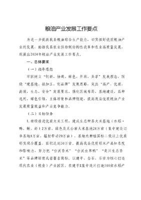 粮油产业发展工作要点为进一步提高我县粮油综合生产能力,切实抓好优质粮油产业的发展,助推我县农业供给侧结构性改革和农业高质量发展,现提出2024年粮油产业发展工作要点。一、总体要求(一)指导思想牢固树立创新、协调、绿色、开放、共享发展理念,围绕建基地、搞加工、创品牌发展思路,突出高产,优质,高效,生态,安全发展要求,强化区域布局、基地建设、品种选用、绿色引领、主体培育和品牌创建,提高我县优质粮油产业发展质量效益和产业竞争能力。(二)目标任务1.继续推进优质大米工程,建成生态种养大米基地(水稻+鸭、鳅、虾)2万亩、绿色及无公害大米基地28万亩(集中建设订单基地8万亩,辐射带动20万亩),基地内种植国标二级以上优质稻实现全覆盖,面积达到30万亩。提高我县优质稻米产品知名度和影响力,努力把台沃香米台沃虫草鸭奕川生态香米等品牌培育成省著名商标。以建平、金石、乐安为核心打造现代农业(粮食)产业园区,在建平X集中连片打造500亩水稻产业园核心区,辐射周边20000亩。2.巩固发展优质油料基地30万亩,其中在X江以东11个X乡集中建设浓香型菜籽油生产基地10.8万亩,在西北南路建立双低油菜生产基地20万亩。做响梓香菜籽油品牌。结合油菜产业基地建设,适度发展彩色油菜花,开发油菜创意功能,举办油菜花节,发展油菜休闲观光,推动农旅融合互动发展,体现产业发展新业态。二、重点工作(一)优化区域布局,加速示范推广。充分利用和发挥资源优势,加快调整优化种植区域布局,围绕加工龙头企业,水稻上加快发展国标二级以上优质稻,积极发展国标一级优质稻,积极开展稻香杯品种展示观摩推介;油菜上加快发展浓香型品种和双低油菜品种;重点推广高产、优质、多抗、适应市场需求的优良品种和配套种植技术。(二)强化基地建设,实施绿色发展。大力整合各类涉农项目资金,加强高标准农田建设,促进田网、路网、水网三网配套进一步完善,实现农田建设标准化,不断夯实我县粮食综合生产能力。大力发展粮油订单,采取龙头企业+基地+大户或龙头企业+农民合作社+农户等形式,建立一批优质粮油生产基地,通过定向投入、订单生产、订单收购,向农户提供产前、产中、产后服务和技术支持,引导农民按照市场需求进行标准化生产。加快现代农业社会化服务超市建设,引导服务主体创新服务形式,开展优质粮油耕、种、防、收全程托管、半托管或单项环节服务,带动小农户节本增收。积极探索推广种养结合、稻田共育共生等1+N生态驱动型模式,大力推广有机肥秸秆综合利用、专业化统防统治和绿色防控技术,切实减少化肥农药使用量,确保产品质量安全,提升稻米和油料产品品质。(三)加强品种选推,提升科技水平。积极与省、市县农科院、农业院校等科研院所协作,选推适宜我县不同生态条件的优质稻、优质油菜新品种,助推品种更新换代。同时针对我县优质粮油产业发展中存在的新品种与栽培技术相配套、高产与优质相协调、规模种植与绿色发展相适应等关键技术问题开展攻关研究组装和集成一批省工节本、增产增效的实用栽培技术,促进良种良法配套、农机农艺融合。大规模开展粮食绿色高产创建,重点抓好轻简化栽培、油菜少免耕直播机收、水稻集中育秧、旱育抛秧、机械化生产、病虫专业化统防统治和绿色防控技术等技术的普及应用,推进优质粮油生产向规模化、标准化、专业化、机械化方向发展。(四)培育经营主体,促进产业融合。积极引导农民合作社家庭农场、龙头企业大力发展优质稻和优质油料基地建设,按照不改变土地所有性质、不改变土地用途、不损害农民权益和依法自愿有偿的原则,通过转包、租赁、股份合作等形式,流转土地承包经营权,实行规模化种植、标准化生产、产业化经营。大力培育和扶持龙头企业,围绕消费升级和市场个性化需求,整体打造有竞争力的优质稻米品牌和优质菜油品牌。充分开发生态旅游功能,融合农耕文化、田园风光,培育形成一批以稻田垂钓稻田美化栽培农耕文化艺术节油菜花节等为代表的休闲旅游产品,不断提升优质粮油产业综合效益。(五)加大品牌创建,实现优质优价。高度重视优质粮油质量安全,大力推进优质粮油产品三品一标认证工作,积极支持龙头企业、专合社等新型经营主体加快农产品品牌化进程,积极争创中国驰名、省级著名、县级知名商标,达到以品牌提升形象,以形象促进质量,以质量拉升价格的目的。鼓励龙头企业、专合社等新型经营主体参加展销会、推介会,进一步提高我县优质粮油产品和企业的知名度,扩大市场占有率,提升我县粮油品牌溢价能力,不断增加农民收入。三、保障措施(一)加强组织领导。将优质大米工程和优质油料基地建设任务纳入政府目标考核,制定工作措施和相关配套办法,分解落实发展任务。有关部门各司其职,加强协作,强化对优质粮油产业的规划、指导、管理和服务,落实相关支持政策,切实推进优质粮油产业