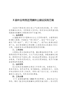 X县林业局推进清廉林业建设实施方案为坚定不移推进全局全面从严治党向纵深发展,进一步打造清廉林业机关,切实转变工作作风,促进X林业高质量发展,现就推进清廉林业建设制定如下实施方案。一、指导思想以XXX新时代中国特色社会主义思想为指导,全面贯彻党的XX大精神,牢固树立四个意识,坚定四个自信,做到两个维护,捍卫两个确立,把严的主基调长期坚持下去,真正使清廉林业建设融入全县经济社会发展各方面全过程,为推进X自由贸易港建设提供坚实保障。二、工作目标以营造山青水秀的政治环境、廉洁高效的政务环境、公平透明的经济环境为目标,以从严治党为统揽,加强清廉林业建设,促使党内正气持续上扬,政治生活更加规范,政治生态更加纯净,干部作风更加优化,权力运行更加规范,党员干部廉洁自觉性明显提高。三、组织领导成立县林业局清廉林业建设工作领导小组,由党组书记、局X任组长,党员成员X、X任副组长,各股室负责人、林场、护林站等相关负责人为成员。领导小组下设办公室,由X同志兼任办公室主任,负责具体相关事宜。四、工作步骤(一)启动实施阶段(2024年3月开始)。结合林业行业特色,制定《X县林业局清廉林业建设实施方案》;结合党风廉政建设会议,及时召开清廉林业建设动员部署会议,强化组织领导,制订方案,迅速启动清廉林业建设工作。(二)深入推进阶段(2024年4月至11月)。根据实施方案,结合党建、林业中心工作,有序开展清廉林业大讨论、大培训、大宣传、大整治、大监督,立足工作岗位、工作职能、工作成效,不断找问题、查不足、补短板,切实让清廉意识入脑入心,清廉林业建设落实见效。清廉林业建设工作领导小组办公室对局机关各股室、林场、护林站清廉林业建设工作情况进行督促检查,发现问题立即整改,确保清廉林业建设工作高质量推进。(三)评比总结阶段(11月至年底)。11月起,局机关各股室、林场、护林站把今年以来清廉林业建设工作报送至清廉林业建设工作领导小组。清廉文化建设工作领导小组办公室做好工作资料台帐整理,年底对清廉林业机关建设工作进行总结。(四)巩固提升阶段(长期坚持)。坚持边实践边总结边提升,将清廉林业建设过程中形成的实践成果、制度成果、理论成果转化为制度规范和治理效能,一体推进不敢腐、不能腐、不想腐体制机制建设,切实建设清廉林业机关。五、工作措施按照政治建设过硬、理论武装扎实、履职尽责到位、队伍建设有力、纪律作风严明、执纪监督有效的标准,组织开展大讨论、大培训、大宣传、大整治、大监督活动,抓细抓实廉洁文化建设提升工作。(一)开展清廉机关大讨论,切实提高政治站位,树牢政治机关意识。以我心目中的清廉机关为主题,组织全局干部职工开展大讨论;组织党员开展重温入党誓词、过政治生日等活动,切实强化政治意识,坚决捍卫两个确立,切实做到两个维护,不断提高全局干部职工创建清廉机关的主动性、自觉性。(二)开展廉洁知识大培训,不断深化理论武装,夯实清文可居文库——海量学习资料,手机电脑均可下载www.wenkeju.com廉思想根基。局党组理论学习中心组和各党支部,每个月至少组织一次理论知识集中学习,深入学习贯彻XXXXXX关于党风廉政建设的重要论述和重要指示精神;加强党员教育管理,教育党员干部坚定理想信念,强化宗旨意识,筑牢秉公用权、为政清廉的思想根基。(三)开展清廉文化大宣传,突出林业行业特色,建好清廉文化宣传阵地。利用微信、抖音、滚动电子屏、宣传标语、宣传专栏等载体,全方位、多角度宣传廉洁文化建设工作的重大意义、工作要求、实施步骤等内容,营造清廉机关创建的浓厚氛围。(四)开展清廉作风大整治,切实纠治顽瘴痼疾,提高清廉工作效能。加强机关管理,完善机关考勤、业绩考核等规章制度,实现依章依制管人管事;突出纪律作风建设,组织人事股、办公室等,对慵懒散、推拖等、执行力不强、服务质量不优、工作效率不高等问题,标本兼治,重拳整治,联评联治,切实改进工作作风,大力提升工作效能。(五)开展廉洁文化建设大监督,突出党务政务公开,筑牢清廉机关防线。设立党务政务公开栏,结合互联网+监督等多种方式,依法依规公开党务政务,全方位接受社会监督,增强权力运行的透明度;完善廉政风险防控机制,加强重要岗位、重点领域廉政风险防范,打好权力运行的预防针;坚决、及时查处各类违规违纪行为,严防死守清廉建设成色。六、工作要求一是提高政治站位。廉洁文化建设提升工作是落实管党治党、从严治党责任的具体措施,全局干部职工要高度重视,充分认识到廉洁机关建设的重要意义,实行领导班子牵头、党员干部带头,自觉把廉洁意识融入自身工作、学习、生活,结合林业特色,深入推进清廉机关建设。二是精心安排部署。局清廉林业建设工作领导小组加强部署调度,严循创建时间表与路线图;领导小组办公室具体指导,文可居文库——海量学习资料,手