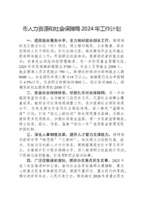 市人力资源和社会保障局2024年工作计划一.提高就业服务水平,全力做好就业创业工作。继续做好充分就业社区(村)建设,建立相对稳定、业务精湛、服务优质的人社干部队伍;加大扶持力度,做好高校毕业生和就业困难群体就业工作;开展职业技能培训,提高劳动者的就业能力;完善失业保险内控管理制度,进一步防范基金管理风险。2024年实现城镇新增就业5700人,失业人员再就业2300人,就业困难人员实现就业790人,新增农村劳动力转移就业人数8600人,失业保险参保人数4.44万以上,城镇登记失业率控制在4.5%以内,完成职业技能培训800人,创业培训600人,新增发放创业担保贷款2000万元。二.完善社会保障体系,织密扎牢社会保障网。进一步加强政策宣传力度,全力做好三险同参工作,巩固社会保障全覆盖成果。做好各项社保待遇调整工作,逐步提高社会保险待遇水平,及时足额支付各项社会保险待遇。深入推进温暖社保行动,打造指尖上的社保特色便民服务品牌,为群众提供更多优质服务。加强社保基金监督,进一步完善监管制度,建立政策、经办、信息、监督四位一体社保基金管理风险防控机制。三.深化人事制度改革,提升人才智力支撑能力。持续推进职称评审破思维立新标,加快建立以创新价值、能力、贡献为导向的人才评价体系,积极搭建柔性引才等工作平台,全面提升引才服务保障水平。深入推进职业技能提升行动,不断细化培训措施,打造XX职业培训品牌。四.广泛征集提前谋划,抓好办实重点民生实事。2023年底下发征集通知和公告,面向社会各界征集群众最期盼、最关心的重点民生实事候选项目,根据尽量而为、量力而行的原则,通过政府常务会、人民代表大会,精选确定2024年度重点民生实事项目。尽快出台方案、组建工作专班、强化要素保障,建立快速推动落实机制,开辟绿色通道,保障资金投入,推动重点民生实事项目顺利实施,不断增强群众的获得感、幸福感、安全感。五.不断完善工作机制,切实维护劳动关系和谐稳定。加强劳资矛盾隐患的排摸活动,加大宣传力度,不断扩大劳动关系法规政策宣传覆盖面。加强劳动监察执法,突出抓好根治欠薪部门协同机制建设,优化调解仲裁工作体系,提升仲裁工作效能。六.强化思想政治引领,不断凝聚团结奋斗合力。始终把党的政治建设摆在首位,加强政治引领,深刻领悟两个确立的决定性意义,增强四个意识、坚定四个自信、做到两个维护,始终在思想上政治上行动上同以XXX同志为核心的党中央保持高度一致。狠抓干部作风建设,不断提升人社系统干部职工的业务能力和服务水平,奋力推动人社事业高质量发展。