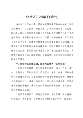 XX社区2024年工作计划2023年XX社区在市委、区委的坚强领导下和XX街道党工委的正确指导下,守正创新、踔厉奋发,各项工作均取得一定成绩。2024年,XX社区将始终坚持以习近平新时代中国特色社会主义思想为指导,全面贯彻党的XX大和二十届二中全会精神,深入贯彻习近平总书记关于新疆工作的重要讲话和重要指示批示精神,完整准确全面贯彻新时代党的治疆方略,坚持以铸牢中华民族共同体意识为主线,紧紧围绕各项重点工作,继续发扬求真务实、真抓实干的优良作风,脚踏实地,狠抓落实,以优秀成绩庆祝新中国成立75周年。一、持续夯实党建基础,激发为民服务红色动能一是深化学思践悟。以主题教育为契机,结合三会一课和主题党日等组织生活,严格落实首学制度,不断加强党员干部理论学习,全面系统的学习领会党的XX大精神,增强学习教育的针对性、普及性和时效性,突出政治忠诚教育、党性教育和理想信念教育,推动党的XX大提出的重大战略、重大任务、重大举措落地见效。二是培养全科社工。围绕党群服务、民生保障、卫生健康、创业服务、城市管理、综合服务等6项重点服务事项,制定每月双五双务学习计划。通过集中学习、月末测试、知识竞赛等方式,教育引导社区干部提高思想认识、掌握业务本领,熟悉政策解读。组织开展交流分享、实操演练、示范点位观摩等学习活动,采取交互式、体验式、情景式等手段,不断提高社区干部掌握办理各项业务技能。三是发挥先锋模范作用。结合五个好党支部创建和四个合格党员队伍建设,以在职党员四个一和三学三亮三比争当先锋行动为抓手,进一步梳理制定2024年社区四项清单,持续开展点单-派单-接单满足居民微心愿活动优化志愿服务激励机制,以清单化监督履职效果,推动各项工作有效落实。结合社区实际,谋深谋细2024工作,推动党建工作再上新台阶。二、持续突出党建引领,激活基层治理核心力量一是建强党员中心户。坚持因地制宜、居住相邻、易于集中、便于管理的原则,划分党员中心户。采取个人自荐、党组织推荐、党员居民联荐等方式,推选党性观念强、积极热心乐于奉献的党员担任党员中心户,负责联系和组织社区内的党员和群众参与社区建设,构建以党员中心户为核心,党支部指导、党员靠前、群众参与共治的一核多元运行机制,实现一户带一片,多片带整体的效益。二是推进四位一体协调机制。在有物业小区和无物业小区分类施策,在党组织的领导下设立居民议事会,对重大事项进行民主协商、共同决策。积极推行小区党员和业主提议,居民小组和业主委员会审议,通过召开四位一体协调会议决议物业公司、行业主管部门办理,解决问题、办理结果公开的议事办理机制,解决小区治理难题,提升社区居民的满意度。三是推动共驻共建。严格落实大党委会议制度,积极调动大党委成员单位参与社区工作重大决策和重要活动,商议决定社区建设、管理、服务方面的重大问题,推动辖区单位党组织与社区党组织结对共建。结合在职党员双报到活动,着力抓好平急转换能力建设和力量储备,将警格长、社区干部、在职党员、志愿者、网格员、物业服务人员、卫生服务站医务人员等分组编队,成立服务队、党员突击队,平时服务群众、战时应急处突。三、持续推进社会治理,构筑平安建设强力磁场一是夯实网格化管理。以网格化管理为抓手,推动警网深度融合,着力做优服务、做细管理,全力打造支部建在网格上、党员深入网格中、事务处理网格内的基层治理体系,切实把民生实事办理在基层、矛盾纠纷化解在基层、群众需求解决在基层,以网格化管理小支点撬动基层治理大能量,真正做到小事不出网格、大事不出社区。二是深化平安社区建设。坚持线下+线上宣传,加强对《民法典》、禁毒反邪、养老诈骗、扫黑除恶、食品安全等知识宣传,扩大普法宣传面。紧盯9类人,及时掌握重点人员的动态情况,持续开展关心关爱,确保重点人员情况稳定、安全可控。定期开展流动人口大清查、大排查工作,特别是空置房屋、半拆迁房屋的排查,消除安全隐患,全力以赴保障辖区群众的安全三是强化安全生产排查整治。持续开展安全隐患大排查大整治工作。继续深入开展三合一场所专项整治行动、安全生产大检查。继续推进自建房消防隐患排查工作,加大对引线充电、燃煤取暖、一插多用等督查整改。继续推进小区公共安全设施建设,加大对高层建筑消防设施、地下室及楼道占用等督查整改。积极开展公共安全宣传工作,加强巡逻和宣传力度,提高社会风险防范水平和应急处置能力。四、持续推进民生建设,解锁融合共治幸福密码一是不断强化精神文明建设。结合XX大学习精神,打造特色宣讲+主题活动,推动群众性精神文明创建活动纵深发展,激发、凝聚辖区群众向上向善向美的精神力量,打造更具美誉度和传播力的社区品牌。通过3.5雷锋日、文明实践日