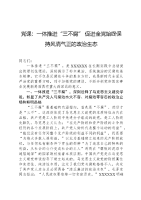 党课:一体推进三不腐 促进全党始终保持风清气正的政治生态同志们:一体推进三不腐,是XXXXXX在长期实践中总结提出的原创性理论,深刻揭示了标本兼治、系统施治的反腐败基本规律。它不仅是反腐败斗争的基本方针,也是新时代全面从严治党的重要方略,对于加强党的建设、不断开创党和国家事业发展新局面具有重大而深远的意义。一、一体推进三不腐,深刻诠释了马克思主义建党学说,彰显了共产党人与腐败水火不容、对腐败零容忍的政治立场和鲜明品格三不腐最基础的内涵指向,首先是不腐,然后才是三不。这深刻体现了马克思主义政党的本质特征与内在品格。共产党是工人阶级中先进分子组成的政党,是工人阶级先锋队。马克思主义认为:在无产阶级和资产阶级的斗争所经历的各个发展阶段上,共产党人始终代表整个运动的利益,他们没有任何同整个无产阶级的利益不同的利益,而是要为绝大多数人谋利益。以此为基础建立起来的无产阶级政权,与任何私有制条件下育生的那种为了追求自己的特殊的利益,从社会的公仆变成社会的主人进而在腐败的泥沼中越陷越深的国家政权有着本质区别。中国共产党是在马克思主义建党学说指导下建立起来的,马克思主义政党的阶级属性和先进性、纯洁性本质,注定了我们党与腐败格格不入,决定了共产党人应当且必须具备清正廉洁的政治本色。毛泽东同志指出:人民政权要取缔一切贪官污吏。XXXXXX明确指出:始终同人民在一起,为人民利益而奋斗,是马克思主义政党同其他政党的根本区别……中国共产党始终代表最广大人民根本利益……没有任何自己特殊的利益,从来不代表任何利益集团、任何权势团体、任何特权阶层的利益。并鲜明地宣示:我们党同腐败水火不容。历史地看,党百余年的奋斗史也是一部坚守党的初心、坚决同各种消极腐败现象作斗争的历史。无论时代变迁、形势任务变化,反对腐败是党一贯的政治立场,我们党从来都坚决秉持有腐必反、有贪必肃的原则方针。在党取得全面执政地位并长期执政后,这一点表现得更为鲜明。党的十八大以来,XXXXXX立足新时代新征程深刻指出:中国共产党要解决好长期执政问题,就必须解决好反腐败问题,永葆党的先进性和纯洁性。基于此,党的十八大以来反腐力度和规模之大,在中国历史和世界历史上都没有过。更可喜的是,党通过前所未有的反腐败斗争,赢得了保持同人民群众的血肉联系、人民衷心拥护的历史主动,赢得了全党高度团结统一、走在时代前列、带领人民实现中华民族伟大复兴的历史主动。经过坚决斗争,反腐败业已取得压倒性胜利并全面巩固。着眼未来,我们党时刻保持解决大党独有难题的清醒和坚定,坚定地把反腐败作为最彻底的自我革命,作为一场输不起也决不能输的重大政治斗争,作为必须赢得全胜的攻坚战、持久战,要求全党不断提高一体推进不敢腐、不能腐、不想腐的能力和水平。二、一体推进三不腐,是对更加科学有效地防治腐败这一新时代治党管党课题的系统作答,经历了一个萌芽、生长和成型、完善的过程坚决反对腐败、防止党在长期执政条件下腐化变质,是重大现实课题,也是必须抓好的长期重大政治任务。2012年11月15日,在中外记者见面会上,XXX同志就明确表示:新形势下,我们党面临许多严峻挑战,党内存在着许多亟待解决的问文可居文库——海量学习资料,手机电脑均可下载www.wenkeju.com题。尤其是一些党员干部中发生的贪污腐败、脱离群众、形式主义、官僚主义等问题,必须下大气力解决。两天后,他在十八届中央政治局第一次集体学习时深刻指出:大量事实告诉我们,腐败问题越演越烈,最终必然会亡党亡国!我们要警醒啊!并强调要永葆共产党人清正廉洁的政治本色,就必须旗帜鲜明反对腐败,更加科学有效地防治腐败。很显然,这次讲话首次把更加科学有效地防治腐败这一时代课题郑重地摆到全党面前,并且提到了十分紧要的位置。实际上,对于反腐败如何更加科学有效的探求,XXX同志早在浙江工作期间就已起步。2004年8月,时任浙江省委书记的XXX为《浙江日报》之江新语撰文《努力把不能为、不敢为、不想为的工作抓实做细》,开始触及这一宏大课题。在该文中,他把制约权力和惩治权力滥用的监督执纪工作特别是反腐倡廉工作的规律性认识,总结提炼为通过严格制度让其不能为,通过强化警示使其不敢为,通过增强自身免疫力促其不想为。他指出:我们要不断强化不能为的制度建设、不敢为的惩戒警示和不想为的素质教育,努力把反腐倡廉的工作抓实做细。党的十八大以来,以XXX同志为核心的党中央以前所未有的勇气和定力推进全面从严治党,更以霹雳手段惩治腐败,反腐败斗争不断取得新胜利新成果,党对反腐败斗争的规律性认识不断深化。2013年1月,XXXXXX在十八届中央纪