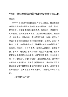 党课:坚持系统观念着力建设高素质干部队伍同志们:XXXXXX在2018年全国组织工作会议上提出,建设忠诚干净担当的高素质干部队伍重点是做好干部培育、选拔、管理、使用工作,并明确要求建立素质培养、知事识人、选拔任用、从严管理、正向激励五大体系。五大体系相互联系、相辅相成,环环相扣、整体闭环,是对新时代精准、科学、规范培养忠诚干净担当的高素质干部队伍的总部署、总要求,必须一体推进。其中,素质培养是基础,要遵循干部成长客观规律进行系统性、持续性、针对性培养;知事识人是路径,重在全方位、多角度、近距离了解识别干部;选拔任用是关键,要拓宽视野看功能最优而非结构最优;从严管理是保障,突出日常经常,早打预防针,多管小毛病;正向激励是方法,要牢固树立激励干部勇于担当、积极作为的鲜明导向。在中国式现代化建设的新征程中做好堪当重任的新时代干部工作,必须不断强化系统观念,统筹推进五大体系建设,才能抓实干部队伍建设。一、坚持知事识人选要建立日常考核、分类考核、近距离考核相结合的知事识人体系。经世之道,识人为先。XXXXXX指出:识人用人是组织部门的一项基本职能,也是一项基本功。人识准了、用好了,党和国家的事业才会有可靠的干部和人才基础。干部工作担负着选贤任能的重要职责,必须练好知事识人的基本功。组工干部最大的德是公道正派、最大的才是识人用人。只有练就一双慧眼,掌握一套绝活,用专业眼光去选拔使用,才能扣好干部工作的第一颗扣子,把人识准用准。(一)坚持在实践一线识人,听其言更要观其行。物质决定意识,意识是对物质的反映。只有坚持一切从实际出发,使主观符合客观,做到主观和客观具体的历史的统一,才能正确认识客观世界,促进事物发展。干部工作也是如此,只有多到一线同广大干部实际接触,多到干部工作生活的实际环境中去,才能真正全面地做到知事识人。新时代新征程中,我们的广大干部奋战在乡村振兴、产业发展、项目建设一线,因此,干部工作也要深入经济社会发展一线,了解干部抓乡村振兴、抓产业发展、抓项目建设的实际能力,既要看干部自己怎么说,还要看其干了什么、干成了什么,用事实说话。(二)常态化开展日常识人,看一时还要重一贯。毛泽东同志早就指出:不但要看干部的一时一事,而且要看干部的全部历史和全部工作,这是识别干部的主要方法。要通过干部考察、年度测评、参加班子民主生活会、述职述德述廉、听取工作汇报、与干部谈心谈话、日常接触了解等渠道,全面深入了解干部有关情况,注重一贯表现和全部工作。力争全方位多角度立体认识干部,既要了解干部现在在干什么,也要了解干部过去干过什么;既要了解在现单位的表现,也要了解在原单位的情况;既要了解同事和上级的意见,也要了解下级和群众的意见,这样才能全面了解和掌握干部的德才表现。(三)客观全面精准识人,全面历史看还要辩证看。全面看就是要用系统的眼光看,既看主流看全貌、又看细节看本质,既看能力优点、又看不足缺陷,既看到优中之缺、又看到短中之长,不能用片面、极端的眼光看待干部。历史看就是要用纵深的眼光看,既看现在能力素质也看过去成长轨迹,既看到一贯表现也看到未来潜能,不能用孤立、静止的眼光看待干部。辩证看就是要用一分为二的眼光看,既用两点论看、又用重点论看,既看政治立场又看能力本领,既看显绩又看潜绩,既看到成绩又看到失误,不能用感性、绝对的眼光看待干部。只有坚持用全面、历史、辩证的眼光看待干部的过去和当下,归纳总结能力特质,综合分析干部的成长路径和未来发展趋势,才能做到精准识人。二、坚持培训锻炼育要建立源头培养、跟踪培养、全程培养贯通的素质培养体系。干部能力素质水平的高低影响着其所在岗位作用的发挥。作为团结率领广大人民群众开展中国式现代化建设的实际推动者和党的各项政策方针的实际执行者,新时代的干部必须要有过硬的政治、经济、文化素养。XXXXXX在2018年全国组织工作会议上指出:干部素质培养是一个长期过程,不是朝夕之功,要增强干部素质培养的系统性、持续性、针对性。能力素质不是凭空而来的,也不是一成不变的,需要干部自身不断从理论学习和实践锻炼中汲取养分,也需要党组织长期的培养。XXXXXX用打好四个基础来概括干部培养的重点,即加强党性修养、筑牢信仰之基,加强政德修养、打牢从政之基,严守纪律规矩、夯实廉政之基,健全基本知识体系、强化能力之基,并提出要把理想信念教育、知识结构改善、能力素质提升贯穿干部成长全过程。(一)深化思想淬炼。理论素养是干部综合素质的核心,只有掌握马克思主义看家本领,才能保证信仰不迷茫、思想不迷航、行动不迷向。要坚持不懈用XXX新时代中国特色社会主义思想凝心铸魂,把学习贯彻这一重要思想作为首要任务,组织实施党的创新理论学习教育计划,以县处级以上