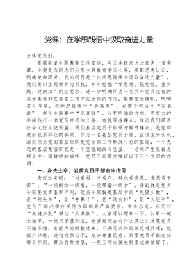 党课:在学思践悟中汲取奋进力量全体党员们:根据街道主题教育工作安排,今天由我来为大家讲一堂党课,主要是与同志们分享主题教育学习心得,提高思想认识,明确使命职责。我的题目是在学思践悟中汲取奋进力量,我们要以主题教育为契机,牢牢把握学思想、强党性、重实践、建新功的总要求,进一步明确作为一名共产党员应有的基本素养和在基层工作中应发挥的作用,高擎信念旗帜、吹响奋斗号角,在学思践悟中尝真理、在实干担当中写真章、在民生实事中见真效,以更明确的方向、更有力的举措践行一名党员应尽的义务,有效服务群众,推动我们经济社会又好又快发展。我们基层党员干部最为贴近群众,是党和政府联系群众的桥梁。作为一名基层党员干部,应该充分认识、深刻领会党的基层组织是党全部工作和战斗力的基础,一个先进的基层党组织就是一个坚强的战斗堡垒,一名共产党员就是群众中一面鲜艳的旗帜,党员干部要发挥好以下三个方面的作用。一、身先士卒,发挥党员干部表率作用老百姓常说:村看村,户看户,群众看党员,党员看干部,一级做给一级看,一级带着一级干。讲的就是党员干部要发挥表率作用,党员干部就是基层中的关键少数,是领头羊,是牛鼻子,是风向标,是火炬手,党员干部必须在任何方面都要严格要求,带头示范,从而以关键少数带动大多数。大家可以想象一下,如果一碗水端平,一把尺子量到底,老百姓还会有什么异议?发展党员不偏不倚,有能力的吸收进来,不满足条件的该反对反对;低保户评选,进行投票公示,充分尊重民意。只要党员干部起好带头作用,群众自然信服,一些工作也就水到渠成地做好了。我在这里重点强调党员干部要在以下几个方面发挥先锋模范作用:1.树立好形象的表率。我们的党和政府形象是广大党员干部个体形象的集合,每个党员干部都是党的形象代言人,都有责任和义务维护党的形象。察一叶可见春秋,观滴水可知沧海。我们基层党员干部,每天面对面与群众打交道,最为贴近群众,就是人民群众观察判断党和政府形象的窗口。与群众处在一起,打成一片,使窗口成为展示自身良好形象、党的良好形象的重要平台。因此,我们自觉维护好自身形象责任重大,意义重大。实际上,在我们的党员干部中,个别人形象的确不敢恭维,站没个站像,坐没个坐样,口无遮拦,大家回去以后,好好照照镜子,做好自我反省,要明责任,知忧患,做到知行合一,真知笃行,修身、养德,塑造好党员干部的良好形象。2.做主动学习的表率。十一假期之前,街道党工委已经把《XXX新时代中国特色社会主义思想专题摘编》等书籍发下去了,这本书是本次主题教育重点书目,大家要认真研读,党员干部要主动学习的问题我也多次强调,党课也是广大党员学习的一种方式,但更多地要靠大家自身去主动学习。本次主题教育,不强制大家写笔记、写心得体会,作为基层党员干部,大家一定要牢记只有善于学习、坚持学习,才能提高自己的思想境界、认识水平和领导能力,才能正确理解党和国家的方针、政策,并且深入贯彻执行,才能解决一些党员干部本领恐慌的问题。在学习时,按照干什么学什么,缺什么补什么的原则,务求入脑入心,掌握精髓,做到学而信,学而用,学而行。3.做干事创业的表率。当前,我们正在大力推进乡村振兴工作,除了已经完成整村安置的小所社区,其他社区人居环境整治、供排水一体化建设等任务都比较重,尤其是推进特色产业发展方面,进程较为缓慢。如何在层层困难面前找到新路子,带动群众增收致富,这就要求我们党员干部不但要做给群众看,更要带着群众干。克服领导让干什么才干什么的被动服从思想,修炼敢破敢立、开拓创新的锐气,做领导群众发展,带领群众创业的先行者。党员干部要做国家政策的执行者,经济发展的推动者,为民服务的实施者,社会管理的践行者,勇当先头兵。二、联系群众,发挥党员干部纽带作用。《XXX新时代中国特色社会主义思想专题摘编》第四篇坚持以人民为中心,强调全心全意为人民服务,是我们党一切行动的根本出发点和落脚点。发挥好基层党员干部的纽带作用,首要的是要坚持群众路线,增强群众观念,密切联系群众。在不断地学习和实践中,努力提高自身教育引导群众,化解各种矛盾,解决各种问题,促进社会和谐的能力与水平。针对我们工作中存在的一些现象、问题,我认为必须解决好两方面问题。1.要解决我们自身存在的问题。要围绕聚焦服务功能、夯实基层基础、进一步密切党群干群关系,从去年五星支部创建以来,我们重点解决两委班子战斗力不强,服务阵地不完善、服务制度不健全,服务群众意识和能力较弱等问题,效果大家也都看得到,希望各位继续努力,二星支部向三星支部看齐,三星支部向四星支部看齐,四星支部要朝着五星标准加快推进。2.要解决人民群众实际困难与问题。民生连着民心。我们要把服务民生、群众满意作为群