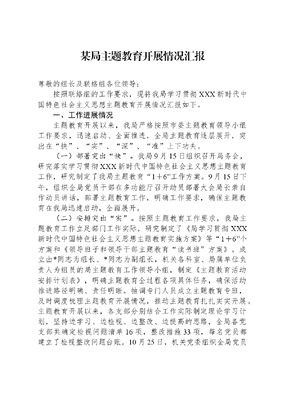 某局主题教育开展情况汇报尊敬的组长及联络组各位领导:按照联络组的工作要求,现将我局学习贯彻XXX新时代中国特色社会主义思想主题教育开展情况汇报如下。一、工作进展情况主题教育开展以来,我局严格按照市委主题教育领导小组工作要求,迅速启动、全面推进,全局主题教育逐层展开,突出在快、实、深、准上下功夫。(一)部署突出快。我局9月15日组织召开局务会,研究落实学习贯彻XXX新时代中国特色社会主义思想主题教育工作,研究制定了我局主题教育1+6工作方案。9月15日下午,组织全局党员干部在多功能厅召开动员部署大会局长亲自作动员讲话,部署主题教育工作,明确工作要求,确保主题教育在我局迅速启动,全面展开。(二)安排突出实。按照主题教育工作要求,我局主题教育工作立足部门工作实际,研究制定了《局学习贯彻XXX新时代中国特色社会主义思想主题教育实施方案》等1+6个方案和《领导班子和领导干部主题教育读书班方案》。成立由*同志为组长、*同志为副组长,机关各科室、局属单位负责人为组员的局主题教育工作领导小组,制定《主题教育活动安排计划表》,明确主题教育全过程各项具体任务,确保活动推进路径明确、责任明晰。抽调专门人员成立主题教育专班,及时调度梳理主题教育开展情况,推动主题教育扎扎实实开展。主题教育开展以来,各支部分别结合工作实际制定理论学习计划,坚持边学习、边检视、边整改、边提高的思路,全局各党支部共确定检视问题清单16项,整改措施33项,每名党员都建立了检视整改问题台账。10月25日,机关党委组织全局党员干部到邯郸涉县129师旧址开展主题教育专题党日活动,近距离感受革命先烈的坚强党性;中秋前后,机关党支部组织党员撰写学习心得体会,并分批次拜访离退休干部送去节日问候;老干部休养所党支部开展重阳节给老干部送温暖活动,开展精神慰藉;老干部活动中心党支部充分发挥阵地作用,组织开展全市老干部重阳节联谊赛比赛;老年大学党支部举办银龄之声艺术节汇报演出活动,展现新时代老年人风采,落地落实主题教育重实践工作要求。(三)学习突出深。一是明确学习重点。按照要求为党员干部订购规定学习书目800余册,党章、党的XX大报告、《XXX著作选读》等所有必读书目覆盖到每名党员干部职工,确保通读8本书人手一册。认真研究、合理统筹,将重点学习内容纳入班子理论中心组学习计划和支部三会一课安排,及时跟进学习习XXX最新重要讲话和各级重要会议精神,自觉用理论学习成果武装头脑、指导实践、推动工作。二是坚持领导干部带头学、做表率。从9月19日-22日、9月25日-28日分两个阶段,组织了为期8天的领导班子和领导干部主题教育读书班,采取集中研读、专家辅导、交流研讨、个人自学等多种形式进行学习研讨,确保一天一专题,上午集中研读、观看专家辅导讲座,下午结合思想和工作实际进行交流研讨。三是活动牵引,注重实效。结合主题教育开展,我们于9月22日组织全体党员到省委党校廉政教育基地进行参观见学,感受十八大以来从严治党成果。每周组织党员干部开展我是文明市民、要为城市争光,我是燕赵儿女、要为河北争气党员志愿服务活动,在职党员到社区服务群众,为群众办实事好事。10月16日-17日,组织召开全市*局长主题教育学习交流研讨会,认真落实学思想、强党性、重实践、建新功工作要求,以主题教育为牵引,深入推动我市*工作上水平、上台阶。10月24日-27日举办全市局各党支部书记示范培训班,组织深入学习贯彻XXX新时代中国特色社会主义思想,引导广大我局充分发挥自身优势,为加快建设现代化、国际化美丽省会城市作出新贡献。(四)问题导向准。我局领导班子坚持边学习、边对照、边检视、边整改,对标对表XXX新时代中国特色社会主义思想、对标对表XXXXXX对河北工作的重要指示批示和对老干部工作的指示批示精神等查找自身存在问题不足。10月8日,由主题教育领导小组办公室主任主持召开检视整治整改工作专题会议,广泛征求各科室、单位意见建议,研究确定局领导班子第一批问题清单6项,整改措施12项,逐项明确整改目标、整改时限,确保检视问题精准、整改整治有力。10月11日召开调研工作协调会,针对前期局领导班子结合省市重点任务和自身职能确定的正反面调研课题,班子成员结合分管工作确定的调研课题,进一步统筹全局力量,确保调研工作高质高效完成。二、下步工作主题教育着眼点在学,落脚点在干。为此,我们将始终贯彻以学铸魂、以学增智、以学正风、以学促干的工作要求,紧密联系我局工作实际,坚持边学、边查、边改,把学习教育、调查研究、检视问题、整改落实贯穿始终,努力做到学以致用、用有所成,切实把XXX新时代中国特色社会主义思想转化为推进我局工作高质量发展的实际行动,为加快建设现代化、国际化美丽省会城市积极贡献力量。最