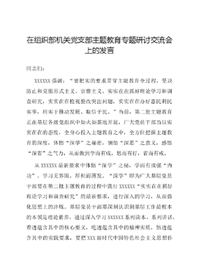 在组织部机关党支部主题教育专题研讨交流会上的发言同志们:XXXXXX强调:要把实的要求贯穿主题教育全过程,坚决防止和克服形式主义、官僚主义,实实在在抓好理论学习和调查研究,实实在在检视整改突出问题,实实在在办好惠民利民实事,用实干推动发展、取信于民。当前,第二批主题教育正在基层各级党组织中如火如荼地开展,广大党员干部当以实实在在的态度,全身心投入主题教育之中,全方位把握主题教育的深度,体悟深学之秘密,领悟深思之意义,感悟深省之气力,从而做到学而有成,思而有行,省而有戒。从XXXXXX最新要求中体悟深学之秘,学而有成强内功。学习无界限,厚积而薄发。深学即为广大基层党员干部要在第二批主题教育的过程中践行XXXXXX实实在在抓好理论学习和调查研究的最新要求,进行深入的学习,从而强化思想上的淬炼。基层党员干部要深刻认识到基层工作最根本的本领是理论素养,通过深入学习XXXXXX系列读本、系列讲话,看透蕴含其中的核心要义,吃透蕴含其中的精神实质,悟透蕴含其中的实践要求,要把XXX新时代中国特色社会主义思想作为推动新时代基层工作的第一思想旗帜和首要精神旗帜,从中领悟当代中国马克思主义立场、观点、方法,并将其作为基层党员干部认识世界、改造世界的强大思想武器。通过常修常炼、常悟常进,进一步坚定理想信念,始终保持对党的朴素情感,进而达到虔诚而执着、至信而深厚的境界。从XXXXXX最新要求中感悟深省之力,省而有戒强硬功。心不可乱,则利至而必知,害至而必察。深省之意在慎行。深省即为广大基层党员干部要在第二批主题教育的过程中践行XXXXXX实实在在检视整改突出问题的最新要求,进行深刻的反省,从而强化政治上的历练。从让人民监督政府到推进自我革命,这是中国共产党跳出历史周期率的实践过程和答案,作为基层党员干部,在主题教育的关键时刻,更要勇于跳出自身发展的历史周期率,深刻领悟以学正风的政治要求,做到三省吾身内外兼修,要时刻绷紧旗帜鲜明讲政治这根弦,将政治自觉转化为行动自觉,转化为解决人民群众难点堵点痛点的有效手段,在主题教育检视整改的关键环节,坚持学查改相贯通,尤其是要坚决整改人民群众反映的突出问题,以整改的实际成效取信于民、服务于民,让人民群众真真切切感受到主题教育带来的新变化新面貌。从XXXXXX最新要求中领悟深思之义,思而有行强外功。实践的价值就是思考的意义。深思即为广大基层党员干部要在第二批主题教育的过程中践行XXXXXX实实在在办好惠民利民实事的最新要求,进行深度的思索,从而强化实践中的锻炼。从两学一做学习教育到不忘初心、牢记使命主题教育,从党史学习教育到XXX新时代中国特色社会主义思想主题教育,贯彻其中的一条思想主线就是群众路线,群众路线是中国共产党的根本工作路线。走实党的群众路线,首先要对群众有感情,真正把自己当作群众的一员,把群众的事当作自己的事。主题教育就是要让我们认识到,人民群众是时代的引领者,是历史的创造者,是真正值得我们信赖和依靠的磅礴力量,通过深度思考,从根本上避免疏远群众、脱离群众,跑上面多、跑基层少的问题。面对新时代群众工作对象更加多元,群众诉求更加多样,群众工作环境更加复杂的情况,基层党员干部要更加深入研究和准确把握新形势下群众工作的特点和规律,改进群众工作方法,提高群众工作水平,提升群众工作质量,实现从思想到实践的根本转化,不断形成以学促干、以干促学的良性循环。我的发言到此结束,不当之处,请同志们批评指正,谢谢。