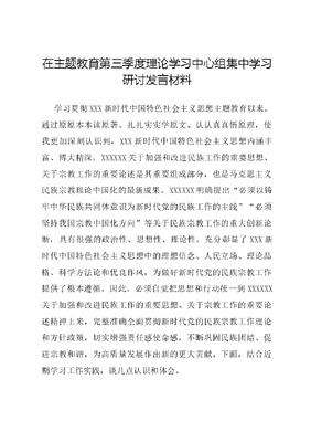 在主题教育第三季度理论学习中心组集中学习研讨发言材料学习贯彻XXX新时代中国特色社会主义思想主题教育以来,通过原原本本读原著、扎扎实实学原文、认认真真悟原理,使我更加深刻认识到,XXX新时代中国特色社会主义思想内涵丰富、博大精深,XXXXXX关于加强和改进民族工作的重要思想、关于宗教工作的重要论述是其重要组成部分,也是马克思主义民族宗教理论中国化的最新成果。XXXXXX明确提出必须以铸牢中华民族共同体意识为新时代党的民族工作的主线必须坚持我国宗教中国化方向等关于民族宗教工作的重大创新论断,具有很强的政治性、思想性、理论性,充分彰显了XXX新时代中国特色社会主义思想中的理想信念、人民立场、理论品格、科学方法论和优良作风,为做好新时代党的民族宗教工作提供了根本遵循。因此,必须自觉把思想和行动统一到XXXXXX关于加强和改进民族工作的重要思想、关于宗教工作的重要论述精神上来,完整准确全面贯彻新时代党的民族宗教工作理论和方针政策,切实增强责任感使命感,不断巩固民族团结、促进宗教和谐,为高质量发展作出新的更大贡献。下面,结合近期学习工作实践,谈几点认识和体会。一、不断强化推动民族宗教工作高质量发展的责任担当今年是全面贯彻落实党的XX大精神的开局之年,也是深入贯彻落实中央民族工作会议和全国宗教工作会议精神的关键一年,做好民族宗教工作意义重大,必须深刻领悟两个确立的决定性意义,以实际行动增强四个意识、坚定四个自信、做到两个维护。一是坚定理想信念。把讲政治作为做好民族宗教工作的第一要求,坚持用XXX新时代中国特色社会主义思想武装头脑、指导实践、推动落实,深刻认识到在民族宗教领域,马克思主义中国化时代化的集中体现就是XXXXXX关于加强和改进民族工作的重要思想、关于宗教工作的重要论述,必须深入领会其中蕴含的世界观和方法论,切实做到学思用贯通、知信行统一。二是提升政治站位。深刻认识到民族宗教工作是关系党执政前途命运的全局性、战略性工作,深刻理解党中央对民族宗教工作的深谋远虑和殷切希望,深入学习贯彻党的XX大精神,坚决落实好中央民族工作会议、全国宗教工作会议、省委民族工作会议暨全省宗教工作会议的部署要求,以高度的政治责任感,切实履行好职责任务。三是强化责任担当。清醒认识到做好民族宗教工作,解决好民族宗教领域有关问题,往往是循序渐进的长期过程,不可能毕其功于一役。必须全面贯彻党的民族宗教工作方针政策,以强烈的政治担当、扎实的工作作风、有力的工作举措、严格的工作纪律,久久为功,持之以恒抓落实。二、始终聚焦推动民族宗教工作高质量发展的实践要求坚持以XXXXXX关于加强和改进民族工作的重要思想、关于宗教工作的重要论述为指引,把贯穿其中的立场、观点、方法转变为做好民族宗教工作的思路举措,着力推动各项工作取得新成效。一是坚持以铸牢中华民族共同体意识为主线做好民族工作。深刻认识铸牢中华民族共同体意识的科学内涵和重大意义,准确领悟四个与共的共同体理念,全面理解四个必然要求,正确把握四个关系,按照增进共同性的方向改进民族工作,全面推进中华民族共有精神家园建设,持续开展民族团结进步创建工作,促进各民族交往交流交融。着眼各民族共同走向社会主义现代化,助推少数民族聚居地方经济社会发展,推动全社会形成铸牢中华民族共同体意识、加强中华民族共同体建设的思想共识和行动自觉。二是努力开创宗教工作新局面。贯彻落实新时代党的宗教工作理论和方针政策,坚持我国宗教中国化方向,积极引导宗教与社会主义社会相适应。努力践行XXXXXX提出的关键在导的要求,加强宗教工作三支队伍建设,支持宗教界和信教群众以社会主义核心价值观为引领,继承弘扬中华优秀传统文化,在教义教规、管理制度、礼仪习俗等方面实现自我调整、自我变革,在自觉践行中不断增进五个认同。三是努力提升治理能力水平。坚持依法管理民族宗教事务,不断提高运用法治思维和法治方式处理民族宗教问题的能力水平。注重健全完善宗教工作三级网络两级责任制,加强基层民族宗教工作部门执法主体和执法队伍建设,依法保障各族群众和信教群众合法权益,依法妥善处理涉民族宗教因素的案事件,有效防范化解民族宗教领域重大风险隐患,推动民族宗教事务治理体系和治理能力现代化水平再上新台阶。三、努力锤炼推动民族宗教工作高质量发展的过硬作风深刻认识到加强和完善党的全面领导,是做好新时代民族宗教工作的根本政治保证,牢记国之大者,不断提高政治判断力、政治领悟力、政治执行力,强化自身建设,提升工作质效。一是坚持党的领导。坚持从政治上看待民族宗教问题、做好民族宗教工作,把党的领导贯穿民族宗教工作全过程,推动形成党委统一领导、政府依法管理、统战部门牵头协调、民族工作部门履职尽责、各部门通力合作、全社会共同参与的新时代党的民族工作格局,着力构