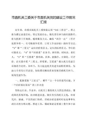 市直机关工委关于市直机关党的建设工作情况汇报近年来,市委直属机关工委探索运用345工作法,将之作为锚定奋进目标、坚定发展信心、强化责任担当的实践路径,作为把握工作规律、精准服务大局、确保两争一出(有评比的争第一、有考核的争优秀、日常工作出经验)的科学方法,3即三要义站位的价值意义、定位的标杆意义、争位的可能意义;4即四要素任务书、路径图、时间表、责任人;5即五要求要明确、具体、能操作、宜量化、可评价,在实践中把三要义、四要素、五要求融入机关党建日常履职全过程、各环节,有力促进机关党建全面提质增效,为助力全省先行区建设、加快都市圈高质量发展贡献机关担当、展现党建作为。一、把握谋划三要义,树牢上一个台阶思考问题、下一个台阶抓好落实的工作理念坚持走在前、作表率,在机关工委系统大力营造讲政治、懂政策的系统环境,倡导精进奋进、踏实务实的机关文化,培育究理、谦诚、平实的部门特质。讲政治就是要时时处处事事从政治高度分析问题、推进工作,懂政策就是要求工委全体干部成为本职业务的多面手精进就是要把工作做到极致,奋进就是要勇于攻坚克难,踏实以对己,务实以示人;究理就是要大力营造勤于思考、研修道理、探究原理的浓厚风气,搭建平台、舞台、赛台,引导人人养成善对工作作出理论思考和实践问答的良好习惯。谦诚就是要谦虚诚恳,平实就是要平平常常地想,实实在在地干,不作缘木求鱼的妄想、坐而论道的空谈,沉入基层寻症问结、破解难题。推进一项工作,首先要考量三要义,做到高站位、定准位、勇争位。(一)站位的价值意义。胸怀和眼界的宽度,决定了把握和认知的高度。在工作中,始终对标对表XXXXXX关于全面从严治党特别是机关党建的重要论述和考察湖北的重要讲话精神,强化党建引领,坚持系统观念,运用统筹方法,紧扣围绕中心、建设队伍、服务群众三大任务,自觉把机关党建放在全市工作大局、都市圈高质量发展布局中去思考谋划,做到中央有部署、机关见行动,党委有号召、机关抓落实。近年来,市委连续7年开展作风建设主题活动,工委主动出击,一线督办,有效助力脱贫攻坚、社区减负增效、乡村振兴、优化营商环境、美好环境和幸福生活共同缔造、千名干部进千企、创建全国文明城市等全市中心工作高质量推进。积极整合资源,联合市委工作部门和群团部门举办党纪法规知识竞赛、廉洁书画展、青年联谊、家风建设、技能比武等活动,把主题党日开在重点项目、乡村振兴、教育基地一线,形成了大工委、大党建、大融合工作格局。(二)定位的标杆意义。谋其上者得其中,谋其中者得其下,谋其下者必败。以跳起来摘桃子的胆识和勇气,按照两争一出的要求,坚持对标一流、紧盯先进,自我加压,高点定位,锚定争先目标,打造示范标杆,把机关党建干出省域副中心城市应有的样子。工作中,牢记代表市委统一领导机关党的工作的职责定位,坚守政治机关第一属性,理直气壮大抓党建、抓大党建,牵头市委组织部、市纪委监委机关等11个党建考核职能部门,每年全覆盖考核92个市直单位机关党建工作,考核结果经市委党建工作领导小组会议审定后通报,市委主要领导按10%的比例约谈排名靠后单位党组(党委)书记。提级配备机关党组织负责人,由部门党组(党委)书记担任机关党委书记,分管党建工作的领导担任机关党委副书记兼任机关纪委书记,组织65名党组(党委)书记接受主体责任书记访谈,持续传导管党治党压力。(三)争位的可能意义。倡导认真态度、务实作风,坚持问题导向、目标导向、结果导向,对照奋进目标找差距、补短板、抓整改、促提升,谋定后动、谋定快动,绵绵用力、久久为功,以攀高比强的争先意识、攻坚拔寨的实际行动,变可能为可行、变应然为实然。近年来,开展以组织安家、岗位安业、思想安心为主要内容的三安行动,补齐党员教育管理服务短板;开展争当实干先锋、争创实干堡垒、争树实干品牌的三争活动,激励发挥党建作用;开展五强创示范(强责任、强班子、强功能、强实力、强规范,创示范基层党组织),持续举办市直机关基层党组织标准化规范化建设示范创建观摩活动,选树一大批富有特色的先进典型,整体提升了机关党建质量。工委连续7年获全省机关党建重点调研课题成果评比一等奖(特别奖),清廉机关建设成效位居全省市州第一方阵。二、明确落实四要素,打造步步为营、环环相扣的管理闭环要求工委系统各项工作均按照任务书、路径图、时间表、责任人四要素,精细落实路径,考量落实进度,确保规范运行、有序有效。(一)讲究变与不变的章法,确定任务书。不变的是按照抓党的建设5+2体系谋篇布局,变的是推进工作的载体、形式、方法与时俱进。坚持每年举办若干场所有市直单位参加的大型党群活动,先后举办主题演讲、歌咏比赛、知识竞赛等,达到凝心聚力、减负释能的好效果。今年,在锚定两争一出