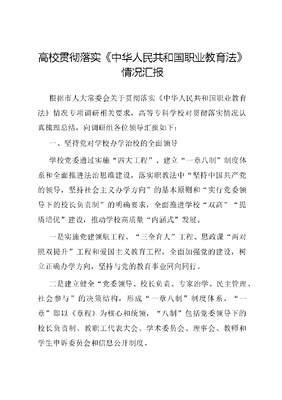 高校贯彻落实《中华人民共和国职业教育法》情况汇报根据市人大常委会关于贯彻落实《中华人民共和国职业教育法》情况专项调研相关要求,高等专科学校对贯彻落实情况认真梳理总结,向调研组各位领导汇报如下:一、坚持党对学校办学治校的全面领导学校党委通过实施四大工程、建立一章八制制度体系和全面推进法治思维建设,落实职教法中坚持中国共产党的领导,坚持社会主义办学方向的基本原则和实行党委领导下的校长负责制的明确要求,全面推进学校双高提质培优建设,推动学校高质量内涵式发展。一是实施党建领航工程、三全育人工程、思政课两对照双提升工程和爱国主义教育工程,全面加强党的建设,树立正确办学方向,坚持与党的教育事业同向同行。二是建立健全党委领导、校长负责、专家治学、民主管理、社会参与的决策结构,形成一章八制制度体系。一章即以《章程》为核心和统领,八制包括党委领导下的校长负责制、教职工代表大会、学术委员会、理事会、教师和学生申诉委员会和信息公开制度。三是用法治思维推进学校治理体系和治理能力建设。充分发挥学术委员会、教学工作委员会、专业建设委员会和教代会在学术研究、人才培养和学校管理中的咨询、决策和监督作用。以六化管理为主线,对学校8项重点制度进行修订,通过构建信息化平台强化对制度执行监督的管理。在教育教学实践中,树立法治意识,运用法治思维和法治方式,推进学校治理体系现代化。二、坚持立德树人、德技并修的育人标准学校通过构建尚医德、重基础、强技能、复合型培养体系,落实立德树人根本任务,培养一专多能、德技并修的技术技能人才。一是塑造了说学演讲唱模式思政课实践教学品牌。把敬佑生命、救死扶伤、甘于奉献、大爱无疆的育人导向融入教育教学全过程,形成了学校特色三示范、四融入、五保障的课程思政育人机制。构建了认知生命、珍爱生命、尊重生命三个生命价值观教育维度,培养高素质卫生健康人才。二是构建专业群共享基础课程,面向不同的专业群,构建应用面广、迁移性强、概括程度高的素质教育平台课程,面向专业群内所有专业学生开设,实现全员共享。三是增加实践课时比例,改善实践教学条件。强化临床实践技能。与多家医院签署合作协议,组建1+1+*医教联合体,在临床等专业探索1.5+1.5培养模式,践行早临床、多临床、反复临床。构建了校-省-国家三级竞赛机制,鼓励全员参与,提升技能水平。四是推进公共选修课模块化改革,整合校内外资源,建成思政类、美育类等6个特色模块选修课程50余门。实施1+*证书制度,为学生多样化选择、全面发展与多路径成才、终身发展搭建立交桥。获批老年照护等1+*证书试点19项,通过率97.7%。三、坚持适应产业、促进就业的办学导向积极服务健康中国一老一小国家战略需求,响应落实职教法关于加快培养托育、护理、康养、家政等方面技术技能人才的要求,立足卫生+康养双领域办学定位,加快紧缺人才培养。2022年11月,中国职业技术教育学会批复同意康养康育专业委员会成立,由省教育厅、市人民政府联合筹办,并将秘书处设在国家开放大学和我校。今年4月28日,国家开放大学和我校联合牵头承办了中国职业技术教育学会康养康育专业委员会成立大会,市长亲临医专主会场并发表讲话。目前会员单位共计403家,包括康养康育行企业85家、中职院校44家、高职院校195家、本科院校45家、开放大学34家;高职院校中双高校41家。专委会致力于服务康养康育行业发展需求,搭建培养师资、特色智库、会员交流、标准制定、共享服务、国际合作六大平台,为适应康养康育产业发展、服务健康中国战略做出职教贡献。四、坚持产教融合、医教协同的培养模式一是学校不断推进现代学徒制试点改革工作。探索建立了五双五共五融合的现代学徒制育人机制;创新了专业平台+岗位方向的模块化课程体系;打造了优势互补、互聘共用的现代学徒制双导师团队;促进了现代学徒制双主体、双身份、工学结合、岗位成才的人才培养模式的不断深化,最终顺利通过国家第三批现代学徒制试点验收。二是深化订单化培养模式。建立按需招生、以用定招的招生-人才培养-就业联动机制。积极与本地医院、企业联系合作,坚持面向基层培养卫生人才。与市中心医院成立护理急危重症教改班实施订单培养;与市朗洁百邦家政服务有限公司合作成立康养产业二级学院;与市日月潭食品有限公司进行横向课题合作;与多家渤海新区生物医药产业园区企业实施定向实习合作。为本地基层医疗卫生体系培养大批高素质技术技能人才。三是通过强化实习管理、实习机制、实习安全和实习权益四重保障,为学生提供高质量的岗位实习服务。我校践行以学生为本的实习管理理念,通过三公开、双选会、一平台,建立实习基地红黄牌制度和退出机制,将全部实习基地公开、
