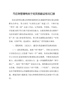 市应急管理局关于党支部建设情况汇报市应急管理局救灾和物资保障科党支部始终坚持以受灾困难群众为中心,努力深化红旗党支部创建工作,不断丰富四学一联一创支部工作法,以学政策、学理论、学典范、学技能为抓手努力提升服务群众能力,以联系帮扶受灾困难户为纽带保持与群众的血肉联系,以创全省有影响、全市有地位的一流工作业绩为目标,努力将支部锻造成为践行对党忠诚,纪律严明,赴汤蹈火,竭诚为民的坚强战斗堡垒。一、思想统领,人民至上,建设对党忠诚的坚定政治堡垒(一)强化思想武装,做到两个维护。坚持XXX新时代中国特色社会主义思想每周一学制度,每周安排时间跟进学习XXXXXX最新重要讲话重要指示批示精神,不断提高政治判断力、政治领悟力、政治执行力,进一步增强坚决拥护两个确立、做到两个维护的政治自觉。围绕推动应急管理事业发展,贯彻落实XXXXXX两个坚持、三个转变,引导支部党员不断增强同心同德推进救灾救助工作的思想自觉和实践力量。湖北日报专题报道了救灾和物资保障科党支部集中学习情况。(二)坚持问题导向,促进党建融合。坚持学以致用,坚持目标导向和问题导向,及时总结完善支部学习活动中的创新举措和有效做法,有效解决了党建和业务工作两张皮问题。坚持每周一学,在每周四下午理论学习中结合救灾救助工作中的实际问题,讨论如何运用XXX新时代中国特色社会主义思想发现问题、查摆问题、解决问题,每次安排1-2名同志主讲,支部全体党员研讨,积极献计出力,对受灾困难群众做到应救尽救、不落一人。中央电视台新闻联播报道市应急管理局开展不忘初心、牢记使命主题教育情况,救灾科党支部负责人接受采访。中央电视台新闻联播以《冬春救助达基层受灾群众过年安》为题报道了我市冬春救灾工作。人民网、新华网等主流媒体报道了我市应急物资保障、恢复重建等工作。(三)坚持人民至上,帮扶受灾群众。坚持人民至上、生命至上,运用四学一联一创支部工作法,每名党员干部联系1户因灾倒损住房困难群众家庭,帮扶其尽早完成重建,搬入新居。在下基层察民情解民忧暖民心实践活动中,全市应急管理部门通过因灾倒损居民住房恢复重建与受灾困难群众连接民情、民盼、民心三根纽带,组织结对帮扶,为群众排忧解难,获得了群众的认可。黄冈市红安县杏花乡梅英村送来锦旗:系民情解民忧,排民困解民愁。该村村民汪某星写来感谢信,感谢通过整合政策帮助其实现恢复重建。二、建章立制,攻坚克难,建设能打胜仗的坚强战斗堡垒(一)建立责任制度,形成履职闭环。实行月双会制度,月初定责,月底述责,每名党员干部按照向支部报告工作计划和完成情况,接受支部全体党员监督,促进业务工作不断上新台阶。在救灾应急工作中,不断提高自然灾害救助标准,改善受灾困难群众基本生活保障力度;在物资保障工作中,丰富救灾物资品种、数量,优化救灾衣被款式设计,让受灾困难群众更有尊严;在恢复重建工作中,坚持科学选址,避开自然灾害多发易发区域,倒排工期,加快重建进度,提前完成全面恢复重建任务。(二)强化应急救助,铸造工作品牌。救灾救助工作加班加点是常态,遇有突发性灾害发生,不管在哪里、不管干什么,都要立即进行处置,支部党员经常连夜赶赴灾区一线,查灾核灾,帮助受灾群众解决基本生活困难。有时候道路已经被毁,需要徒步走几个小时;有时候山洪还没有退去,需要蹚着湍急的水流;有时候一边是陡峭的悬崖,一边还有不断滚落的山石。支部党员不仅从无怨言还表示,灾情越是重大,灾区情况越是复杂,说明受灾群众越是需要我们,作为一名共产党员越是义不容辞。我市多维度、深层次、创造性地开展救灾救助工作,精细化管理等多项工作在全省作典型发言,及时、规范、有序完成各项工作任务,在全省打造了未灾先防、闻灾先动、受灾先救的救灾工作品牌。(三)创新工作方法,支持疫情防控。为打赢疫情防控总体战、阻击战,总结出我市应急物资保障早、快、严、好、省五字工作法,即安排部署早、组织调度快、发放管理严、使用效果好、回收利用省,全市应急管理部门高效调运帐篷、折叠床、棉衣、棉被、毛毯、大衣、枕头、被套、手电筒等20多个品种救灾物资52.24万件用于支持疫情防控工作,被中央组织部收录至《学习贯彻XXX新时代中国特色社会主义思想,打赢新冠肺炎疫情防控人民战争总体战阻击战案例》。三、对标先进,比学赶超,建设作风优良的坚韧精神堡垒(一)缅怀革命先烈,牢记初心使命。组织支部党员干部赴洪湖市开展缅怀先烈,牢记使命主题党日活动,在湘鄂西苏区革命烈士纪念碑前默哀并进献花篮,重温入党誓词,参观革命烈士纪念馆,瞻仰瞿家湾革命先烈工作、学习、生活的地方,回顾湘鄂西革命根据地的革命征程,聆听先烈不怕牺牲、艰苦奋斗的感人故事,感受革命先辈为推动革命事业发展所作出的贡献,让支部党员思想受洗礼、党性得锤炼,发自内心地感触