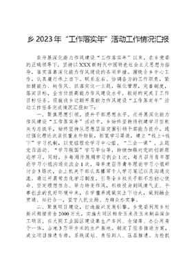 乡2023年工作落实年活动工作情况汇报自开展深化能力作风建设工作落实年以来,在乡党委的正确领导下,坚持以XXX新时代中国特色社会主义思想为指导,落实落靠深化能力作风建设的各项举措。围绕全乡中心工作,认真履行承上启下、联系左右、协调各方的工作职责,紧扣提能力、转作风、抓落实这一主题,强化管理,完善制度,落实目标,全方位提高能力作风建设水平,较好的完成了工作目标任务。现就我乡近期开展能力作风建设工作落实年活动工作任务完成情况汇报如下:一、聚焦思想引领,提升干部思想水平。在开展深化能力作风建设工作落实年活动中,乡始终坚持将创建学习型机关为总抓手,始终坚持从思想层面突围引领干部能力提升。通过强化理论武装抓重点补短板,拓宽学习渠道,建立线上+线下学习机制,以党组理论学习中心组、三会一课、主题党日活动、学习强国学习平台等,持续加强对党的创新理论学习。同时,乡每周开展周学习例会1次,每月召开青年理论学习小组沟通交流会1次,每季度召开青年理论学习小组研讨会3场次,会上机关干部认真攥写个人学习笔记以及沟通交流。通过开展常态化学习制度,引导全乡机关干部不忘初心使命、坚定理想信念、努力转变作风,积极投身到风清气正、干事创业的良好环境中来,在学懂弄通做实上下功夫,做到融会贯通、知行合一,坚守人民立场、为群众办实事。二、聚焦项目建设,打造振兴发展引擎。乡党委利用乡村振兴衔接资金2000万元,实施大同区鲜食玉米及玉米制品深加工项目,在大同工业园区建设集生产车间、仓储库、办公用房于一体,占地3万平方米的生产基地。制定了任务推进方案,成立项目推进专班,系统谋划、责任到人、压茬推进。为抢抓建筑施工黄金期,施工项目部建立24小时领导带班值班制度,根据现场情况不断完善施工计划及方案,充分考虑资源配置、协调调度以及服务保障等各个工作环节。同时,加强安全质量管理力度,确保项目建设质量和工期节点顺利推进。目前,冷库设备间及锅炉房基础建设已完成,玉米制品生产车间正在安装门窗,下一步将安装锅炉房的钢结构,加固玉米生产车间钢梁。项目专班成员做好现场监督工作,切实保障项目按工作计划如期完成。三、聚焦为民办事,优化为民服务质量。2023年10月份以来,乡全面推动秋季雨露计划补助工作并取得了显著成效。全乡上下深入宣传,全力推进雨露计划工作如期开展。我乡严格按照国家推出的雨露计划中直补到户、作用到人的要求,全面发动乡村振兴专干和网格员入户宣传雨露计划政策,全力推动雨露计划+行动,为全面推进乡村振兴提供有力人才支撑。为保证学生群体能更精准享受政策帮助,乡发动12个村网格员及乡村振兴专干积极开展排查工作,全面摸排学生情况,确保符合雨露计划政策的适龄学生不漏一人,不差一个。为保证雨露计划资料完整,审核公正,由乡村两级专干对各项申报材料进行把关,严格审核。截至目前,乡共申报雨露计划补助对象11人,其中老生8人,新生3人。共计金额16500元。乡坚持把深化能力作风建设工作落实年活动工作作为一项常抓常新的系统工程、永不竣工的民心工程,我们要以此为契机,坚决整治作风顽瘴痼疾,着力解决群众急难愁盼问题,大力弘扬改革创新精神,不断提高工作的精气神,努力为龙江振兴发展作出积极的贡献。