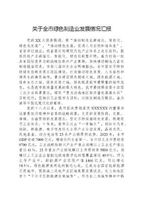 关于全市绿色制造业发展情况汇报党的XX大报告强调,要推动制造业高端化、智能化、绿色化发展,推动绿色发展,促进人与自然和谐共生。省委书记指出,我省要在构建现代化产业体系上走在前列,狠抓传统产业高端化、智能化、绿色化转型升级,着力打造一批具有国际竞争力的战略性新兴产业集群,加快推动制造大省向制造强省迈进。市委八届四次全会明确指出,全市坚定不移加快绿色低碳发展示范区建设,打造推动绿色发展、人与自然和谐共生的典范城市,重点建设绿色制造之城、绿色能源之城、绿色生态之城、绿色宜居之城。绿色既是我市最厚重的城市底色,也是我市高质量发展的最大特色,我市要按照省委十四届三次全会部署要求,锚定勇当沿海地区高质量发展排头兵目标定位,坚持以工业强市为目标,以绿色制造为路径,奋力谱写中国式现代化新篇章。党的十八大以来,我市坚决贯彻落实XXXXXX的重要讲话重要指示精神和省委的战略部署,立足新发展阶段,完整、准确、全面贯彻新发展理念,坚定不移实施绿色发展,构建现代工业体系。十年来,我市从过去一车独大,到如今汽车、钢铁、新能源、电子信息四大主导产业全面发展,晶硅光伏、风电装备、动力电池等23条产业链厚积成势。2023年,全市GDP突破7000亿元,增速位列全省第一。全口径工业开票销售9700亿元,工业战略性新兴产业产值占规模以上工业总产值比重达41%,23条重点产业链规模以上开票销售5800亿元,规模以上工业企业智能化改造数字化转型覆盖面达40.9%。四大主导产业中,新能源产业实现产值1466亿元,同比增长58.5%。绿色能源使用比例接近七成,已成为全国首批新能源示范城市、国家海上风电产业区域集聚发展试点、长三角地区首个千万千瓦新能源发电城市。作为长三角城市群和中韩产业合作重要节点,我市具备平台载体较多、资源要素较足、服务环境较优、集疏运体系较为完备等优势,正顺应长三角区域一体化发展趋势,深度融入长三角创新集群和高端产业集群,打造长三角北翼先进制造业高地。当前,我市制造业绿色发展仍然面临种种挑战。一是制造业大而不强、质效不高。近年来,我市产业结构持续优化,但仍然存在一产偏高、二产不强、三产不优的问题。二是县域发展不平衡。相较于苏州、南通等地县域经济齐头并进的协调发展格局,我市县域工业发展不平衡的问题较为突出。三是研发投入不足。2023年全市全社会研发经费投入占GDP比重为2.12%,低于全省和全国的平均水平。四是转型动力不足。部分制造企业受外部经济环境、产业基础、经营实力、人才支撑等局限,对绿色转型意愿不强。针对这些挑战和问题,要加强统筹规划、坚持创新引领、推动绿色转型、布局绿色赛道、发展循环经济、加快智改数转,从技术创新、标准体系、产业深度融合等方面发力,着力打造我市绿色制造之城,也为全省推进制造业绿色转型升级提供有益借鉴。加强统筹规划,推动人产城互融互促。推进制造业绿色转型,要加强统筹规划,系统谋划生产空间,立足各区域功能定位和比较优势,增强产业发展整体性和协调性。一是要统筹工业强市与工业强县,牢固树立一盘棋思想,补齐县域发展失衡的短板。明确各板块定位和功能,推动空间协同、交通互联、产业互补、市场融合、资源共享。二是要统筹工业强市与城市建设,加快产城互补的融合步伐。城市发展需要产业支撑,产业发展需要城市配套。我市仍然处于新型工业化和新型城镇化的发展期,应统筹好工业发展与城市建设的关系,推进以人为核心的新型城镇化,坚持以产兴城、以城促产、产城融合,使产业与未来城市现代化相融共生。围绕投资者、创业者和就业者需求,不断提升城市功能品质,让软环境更优,硬环境更强,实现城市化与工业化互动并进。坚持创新引领,完善产学研创新体系。科技是实现制造业绿色转型的关键支撑,要坚持创新引领,以科技创新为制造业绿色发展提供不竭动力,加快制造业从要素驱动转向创新驱动。一是整合科创资源,布局建设重大科技创新平台,探索建立产业技术研究院,统筹构建全市产业技术研发转化体系和区域创新体系。二是强化企业创新主体地位。党的XX大报告指出,要加强企业主导的产学研深度融合,提高科技成果转化和产业化水平。促进各类创新要素向企业集聚,加快构建以科技型中小企业为基础,高新技术企业为主体,专精特新企业、瞪羚企业和独角兽企业为标杆的创新型企业集群。引导企业加大研发创新力度,激发人才创新活力。三是加快绿色低碳等新技术突破。高质量运营中科院上硅所新能源创新中心等平台,引导企业与高校、科研院所建立低碳技术创新联盟,支持发展面向碳中和的相关技术,围绕可再生能源大规模利用、新型动力电池和前沿储能技术等重点领域,推进原创性、引领性科技攻关,推动成果转化运用。四是加快产业融合。促进互联网、大数据和新能源产业深度融合,围绕产业链部署创新链,加快建设绿色产业集群,推动产业结构