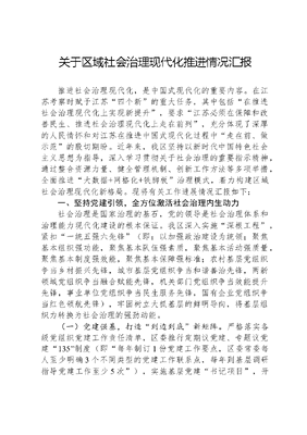 关于区域社会治理现代化推进情况汇报推进社会治理现代化,是中国式现代化的重要内容。在江苏考察时赋予江苏四个新的重大任务,其中包括在推进社会治理现代化上实现新提升,要求江苏必须在保障和改善民生、推进社会治理现代化上走在前列,充分体现了深厚的人民情怀和对江苏在推进中国式现代化过程中走在前、做示范的殷切期盼。近年来,我区坚持以新时代中国特色社会主义思想为指导,深入学习贯彻关于社会治理的重要指示精神,通过整合资源力量、健全管理机制、创新工作方法等多项举措,全面推进大数据+网格化+铁脚板治理模式,着力构建区域社会治理现代化新格局。现将有关工作进展情况汇报如下:一、坚持党建引领,全方位激活社会治理内生动力社会治理是国家治理的基石,党的领导是社会治理体系和治理能力现代化建设的根本保证。我区深入实施深根工程,紧扣一统五强六先锋(即:以加强政治建设为统领;聚焦基本组织强功能,聚焦基本队伍强素质,聚焦基本活动强质量,聚焦基本制度强效能,聚焦基本保障强标准;农村基层党组织争当乡村振兴先锋,城市基层党组织争当和谐善治先锋,两新领域党组织争当融合赋能先锋,机关部门党组织争当效能提升先锋,事业单位党组织争当民生服务先锋,国有企业党组织争当红色领航先锋),牢固树立大抓基层的鲜明导向,将基层组织力转换为社会治理的强劲动能。(一)党建强基,打造到边到底新矩阵。严格落实各级党组织党建工作责任清单,区委推行定期议党建、专题议党建135制度(即每年制订1份党建工作要点,区委常委每人至少明确3个不同类型的党建工作联系点,每年到基层调研指导党建工作至少5次),实施基层党建书记项目,开展书记抓基层党建述职评议,形成书记抓书记、一级抓一级、层层抓落实的责任机制。深化双有(即:从业人员100人以上的有单独党组织、50人以上的有党员)提升行动,出台行业党建高质量发展三年行动计划,新组建非公企业党组织64个,升格党委建制7个,构建条块结合、齐抓共管的行业党建新局面。建强智能装备、新一代信息技术等6个优势产业链党建联盟党委,有效扩大产业链重点企业组织覆盖范围。围绕三个一线要求,持续深化攻坚支部工作法,在项目建设、改革重组等重点一线组建攻坚支部14个,引导党员干部在重大任务攻坚中发挥先锋模范作用。(二)党网融合,畅通基层治理微循环。深入实施精网微格红网格通通建工程,全区1024个综合网格单独建立党支部,8503个微网格同步建立4257个党小组,规范化建设红网格之家614个。探索构建党建引领城乡基层治理365全域工作体系,研发上线红网格智慧平台,建成红网格之家示范站10个、标杆站42个、标准站798个,全区建成率100%。动态调优镇(街道)党工委—村(社区)党组织—网格党支部—微网格党小组—党员中心户组织链条,推行网格吹哨、部门报到,分级响应、协同处置治理模式,健全红网格力量配备、规范运行、工作成效一体化评估机制。(三)服务下沉,站稳为民解忧落脚点。坚持建管用相结合,完善党群服务中心功能布局,优化提升服务群众功能,做到小办公、大服务,把党群服务中心建设成为党领导基层治理的坚强阵地、服务党员群众的温馨家园、区域资源开发的发展平台。在全区基层党组织和党员中开展四敢争先、一线建功活动,聚焦民生、治理、改革等12类64项重点课题,推动主管部门揭榜领题、党员干部合力攻坚。深化双报到双服务活动,建设新兴家园好通驿站等百佳服务阵地,构建蜂享汇红色服务圈,建立统一活动日制度,68名部门单位一把手和4700多名在职党员常态化进社区、进网格,帮助解决群众急难愁盼问题532个,汇聚基层治理强大合力。二、强化科技支撑,立体化注入社会治理先进智力随着新型城镇化建设不断推进,社会面人口流动日益频繁人际社会关系愈发复杂,社会治理体系越来越需要通过智慧化科技手段为基层治理赋能增效。我区以智慧大脑建设为主攻方向,在电子政务外网、公安内部专网同步部署技防智慧大脑,全面推动力量融合、功能聚合、手段综合,为区域社会治理、智慧城市管理、平安XX建设提供强大智力支撑。(一)织密扎牢管理体系。全面落实存量升级、新增智能的建设要求,统筹人、车、码、端多维采集体系建设,优化完善以市县圈层、智慧单元、管控阵地、人员落脚点为主线的感知采集网络,对标点线面相衔接、水陆空相策应的更高标准,构筑环XX、环城区、环乡镇三道防控圈。截至目前,全区自建一类视频14823路,其中结构化相机1452个、人脸抓拍630个、卡口电子警察2812套、鹰眼10套、高空瞭望20套,全域感知设备覆盖率达到每平方公里70.6台,总在线率达98%。在持续抓好公共安全监控视觉感知体系建设的同时,全面落实双体