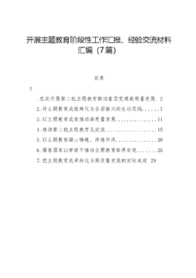 开展主题教育阶段性工作汇报、经验交流材料汇编(7篇)目录1.扎实开展第二批主题教育推动基层党建高质量发展.22.将主题教育成效转化为全面振兴的生动实践73.以主题教育成效推动高质量发展114.推动第二批主题教育见实效.155.以主题教育凝心铸魂、淬炼作风206.强基固本以学促干推动主题教育取得实效.257.把主题教育成果转化为高质量发展的实际成效29扎实开展第二批主题教育推动基层党建高质量发展基层治理是党联系群众的最后一公里,也是人民群众感知党的执政能力的最近一公里。党的报告指出坚持大抓基层的鲜明导向,要求推进以党建引领基层治理,持续整顿软弱涣散基层党组织,把基层党组织建设成为有效实现党的领导的坚强战斗堡垒。这一重要要求,为坚持党的领导、加强基层党组织建设指明了方向、提供了遵循。第二批主题教育开展以来,xxxx围绕x进先锋•贵在行动总载体,以配强一个支书、建好一支队伍、打造一个中心、健全一个机制、找准一条路子的五个一行动为总揽,深入实施筑固工程,着力探索主题教育与强基固本相结合的生动实践,不断增强基层党组织的政治功能和组织功能,切实把基层党组织建设成为有效实现党的领导的坚强战斗堡垒。一、设擂比武增强基层领头雁履职能力我们以x进先锋•x在行动为总载体,深入实施筑固工程,扎实推进五个一行动,不断建强四级动力主轴,在至美观山引领下,以一网引领三网融合为实施路径,探索构建三共建三共享工作新格局,致力建设共建共享幸福xx社区品牌,让社区成为居民最放心、最安心的港湾。xxxx年xx月xx日,在xx公园,首届xxxx社区党组织书记擂台比武火热举行,xx街道xx社区党总支书记xx在擂台上声情并茂地讲述起这几年不断强化社区为民、便民、安民功能,以共建共享建设幸福xx的所思所得。比赛现场,xx名从各区(市、县)擂台比武中脱颖而出的社区党组织书记登台打擂,通过视频展示、上台汇报、现场问答等方式,现场比拼开展主题教育和抓党建、抓治理、抓服务等任务落实情况,比工作实绩,也比群众满意度。xxxx坚持以比促学、以比促干、以比促改,围绕政治素质、理论水平、发展实绩、服务群众等重点,市县乡三级逐级开展擂台比武。在各级基层党组织书记的比武擂台上,各村(社区)党组织书记既亮相打擂又互学互鉴,既同台比武又碰撞思想。参加这次活动,让我印象最深的是现场问答环节,一些村支书带领支部抓理论学习的做法让我深受启发。xx说。xxx说:通过擂台比武,我了解到其他社区的经验做法,学习他们的思路、理念,让我思想受到洗礼、思路得到拓宽,我将增强本领能力,以党建为引领,更好地服务社区。在学和干中练兵、讲和赛中互鉴、看和听中启发,近年来通过擂台比武这一平台,xxxx进一步推动了各村(社区)党组织书记在乡村振兴和基层治理中思路更加清晰、目标更加明确、履职能力和服务水平更加突出。二、建好队伍发挥基层党组织战斗堡垒作用自从回到村里工作后,通过参加各类学习和工作实践,我找准了奋斗的方向,立志要成为xx村乡村振兴的中坚力量。xx后xx从xx师范学院毕业后就进入xx乡xx村村委会工作,并被推选为村委会委员,现在还是清镇市人大代表。从校园到扎根基层,在xx看来,最难的就是积累经验。为更好地建立起年轻干部干事创业的信心,xx村由联系村领导、支部书记、驻村工作队从思想、工作和作风等方面对新进人员进行帮带培养。xx于去年加入党组织,村里也给她压紧了担子,让她负责党建、治垃圾、应急管理等工作。乡村振兴,关键在人。xx村在新一届村两委换届工作中,坚持选优配强村两委班子成员,x名村干部中,有x人是xx后年轻干部,大专以上学历x人。xx村党支部书记、村委会主任xx说:通过一对一多对一帮带培养,xx村正积极发挥基层党组织的战斗堡垒作用,着力打造一支素质优良、结构合理、适应乡村振兴需求的村级干部力量,为群众办好更多实事。xx村的党建成效只是xxxx狠抓基层党组织队伍建设、发挥基层党组织战斗堡垒作用的一个缩影。五年来,xxxx持续建强以党员、村(社区)两委成员、社区工作者和志愿者为主的基层治理队伍,从青年和产业工人、农民、知识分子中发展党员xxxxx名,推动xxxx名村(社区)两委成员和后备力量实现学历提升,将xxxx名社区工作者纳入职业体系建设,选派两批xxxx余名机关企事业单位党员干部下沉村(社区)担任民情助理,x万余名党员到社区开展双报到共建志愿服务,各方力量不断向基层汇聚。无论是大战大考,还是平常时候,这支队伍始终冲锋在第一线、