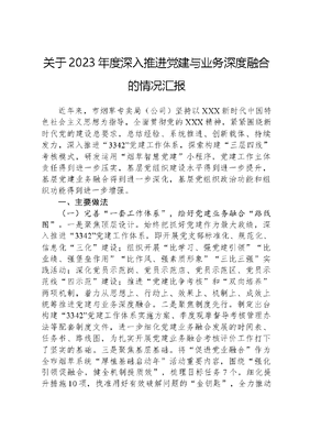 关于2023年度深入推进党建与业务深度融合的情况汇报近年来,市烟草专卖局(公司)坚持以XXX新时代中国特色社会主义思想为指导,全面贯彻党的XXX精神,紧紧围绕新时代党的建设总要求,总结经验、系统推进、创新载体、持续发力,深入推进3342党建工作体系,探索构建三层四线考核模式,研发运用烟草智慧党建小程序,党建工作主体责任得到进一步压实,基层党组织建设水平得到进一步提升,基层党建业务融合得到进一步深化,基层党组织政治功能和组织功能得到进一步增强。一、主要做法(一)完善一套工作体系,绘好党建业务融合路线图。一是聚焦顶层设计。始终把抓好党建作为最大政绩,深入推进3342党建工作体系,即开展党支部标准化、规范化、信息化三化建设;组织开展比学习、强党建引领比业绩、强堡垒作用比作风、强素质形象三比三强实践活动;深化党员示范岗、党员示范店、党员示范区、党员示范线四示范建设;推进党建比争考核和双向培养两项机制,着力从思想上、行动上、效果上、机制上、成效上统筹推进党建与业务深度融合。二是聚焦制度先行。制定出台构建3342党建工作体系实施方案、季度观摩督导考核管理办法等配套制度文件,进一步细化党建业务融合发展的时间表、任务书、路线图,为扎实开展党建业务融合考核评价工作打下了坚实的基础。三是聚焦基层基础。将促进党业融合作为全市烟草系统厚植基础启动年活动重要内容,围绕强化引领促融合,健全机制提质效,梳理目标任务7个,细化提升措施10项,找准用好有效破解问题的金钥匙,全力推动形式上的融合向实质上的融合迈进。(二)构建一种标准模式,织密党建业务融合经纬网。紧紧围绕考核层级、考核内容和结果运用等关键环节,探索完善上下贯通、层层传导、跟踪问效的三层四线考评工作模式。一是压实层级责任。以全面落实三级四岗责任清单为基础,建立市局、县局、基层队所三层和党支部、党小组、党务工作者、党员四线考核模式,抓牢抓实市局指导县局、县局督导基层队所三层的责任,充分发挥党支部战斗堡垒、党小组红色根系、党务工作者示范带动、党员先锋模范四线的作用,进一步明确了分层次、分条线、链条式、全过程的融合考核评价和责任落实模式。二是细化考评流程。在考核权重设定上,将考核内容细分为理论学习、工作业绩、纪律作风及创新荣誉等四个方面,理论学习和工作业绩各占50%,纪律作风及创新荣誉为加减分项;在制定标准细则时,聚焦围绕中心、突出业绩、动态管理的考核导向,将各业务条线的阶段性重点、难点工作,及时动态调整纳入考核标准,以考核推动重点工作的落实,持续提升考核评价的融合性、针对性、实效性;在考核评价过程中,按照党员报绩、支部算绩、集中评绩、汇总定绩、公开晒绩五个步骤,采取定期考核与日常检查相结合、集中考核与巡回观摩相结合等创新方式开展考核。三是强化激励奖惩。依据考核结果,全面实行三亮一积工作措施,即亮旗表彰党支部、亮星定级党小组、亮像测评党务工作者、积分管理党员,推进考核结果与绩效工资定向挂钩、与两优一先评选有机结合,并作为双向培养机制的参考依据,广泛营造你追我赶比学赶超的浓厚氛围,切实打通党建业务融合的最后一公里。去年以来,市局通过季度、年度考核各直属单位,评选党业融合提升先进单位3个;各机关党委(党总支部)、党支部通过季度、月度考核,评选先进党支部25个,评选先进党小组16个,评选优秀党务工作者56人次,评选优秀党员120余人次,有力激发了各级党组织和广大党员抓党建、促发展的工作动能和强大合力。(三)运用一个载体平台,打造党建业务融合硬支撑。借助信息化技术手段和工具,研发运用商烟智慧党建小程序,以此作为学习交流的阵地、考核评价的载体、展示业绩的平台,赋能党建与业务融合信息化、智能化、常态化。一是拓展功能应用。在基础栏设定上求实,围绕常规的理论学习、教育管理、工作动态、成效展示等功能,突出手机移动端易操作、便捷性等特点,做到编发及时、信息全面、互动高效,精心打造线上学习主阵地。在特色栏目设定上推新,积分管理模块实现了三层四线考核的全过程支撑,在线答题模块增强了日常学习的有效性和针对性,典型选树模块提供了先进经验交流和模范典型展示的平台渠道。二是强化过程管理。基于考核是果,过程为要的工作定位,依托小程序强化工作过程的记录和信息的收集,实现了理论学习与工作业绩的及时上传、三会一课与党日活动的动态记录、考核内容与考核结果的主动公开,实现了对全市系统50个党支部、593名党员的组织生活、在线学习和考核过程的全覆盖。三是注重结果展示。依托小程序功能模块,有效促进考核