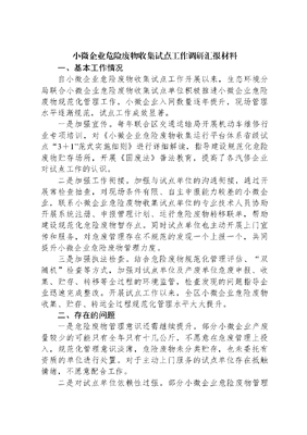 小微企业危险废物收集试点工作调研汇报材料一、基本工作情况自小微企业危险废物收集试点工作开展以来,生态环境分局联合小微企业危险废物收集试点单位积极推进小微企业危险废物规范化管理工作,小微企业入网数量逐年提升,现场管理水平逐渐规范,试点工作成效显著。一是加强宣传。每年联合区交通运输局开展机动车维修行业专项培训,对《小微企业危险废物收集运行平台体系省级试点3+1范式实施细则》进行详细解读,指导建设规范化危险废物贮存场所,开展《固废法》普法教育,提高了各汽修企业对试点工作的认识。二是加强工作衔接。加强与试点单位的沟通衔接,通过开展常检查抽查,对现场条件有限、自主申报能力较差的小微企业,联系小微企业危险废物收集试点单位的专业技术人员协助开展系统注册、申报管理计划、运行危险废物转移联单,帮助建设规范化危险废物暂存点。同时试点单位也主动开展上门宣传和服务,对危废管理存在不规范的发现一个上报一个,共同提升小微企业危险废物管理力度。三是加强执法检查。结合危险废物规范化管理评估、双随机检查等方式,加强对试点单位及产废单位危废申报、收集、贮存、转移等全过程的环境监管,检查发现的问题指导企业迅速完成整改。开展试点工作以来,全区小微企业危险废物收集、贮存、转运全过程规范化管理水平大大提升。二、存在的问题一是危险废物管理意识还需继续提升。部分小微企业产废量较少的可能只有全年只有十几公斤,不愿意在危废管理上投入,规范化管理意识淡薄,危险废物未分类贮存,也未委托有资质的单位进行处置。对于主动上门服务的试点单位存在抵触情绪,不愿意配合工作。二是对试点单位依赖性过强。部分小微企业危险废物管理主体责任意识薄弱,虽执行了电子联单管理制度,但自身管理制度不健全,存在危险废物台账不完善、贮存设施不规范等问题,危险废物各项管理工作过于依赖试点单位。三是危废收集转运效率有待提高。目前试点工作开展现状实质上还是分散收集、分散转运的模式,我县偏远山区较多,这些地区企业少、分布散、山路难行,全市3家试点单位每家包保4-5个县区,企业数量难以统计,很难制定合理、全面的危险废物收集路线。即便建立了收集路线,由于每次车辆仅到指定企业,能收集到的危险废物量极小,运输成本过高,增加处置成本,小微企业的委托处理费也会相应增加,危废收集转运总体效率还有待提高。三、下一步建议一是进一步加强宣传推广。进一步加大对试点工作的宣传力度、丰富宣传方式,充分利用网络、电视、报刊等媒体,广泛宣传危险废物收集试点的相关政策。同时联合行业主管部门和相关行业协会,广泛宣传,引导符合条件的小微企业和相关机构,主动纳入危险废物集中收集体系,将这项绿色惠企举措做大做深。二是进一步强化危险废物环境监管能力。持续加强对小微企业危险废物规范化管理的培训力度,积极开展小微产废单位危废专项帮扶指导,对现场检查发现的问题,形成问题清单,现场指导、督促企业进行整改。对于态度不积极不配合的,坚决开展执法,同时积极开展警示教育,增强企业法制观念和污染防治责任一是,形成强力震慑。三是进一步加强服务网络建设。尽快推出统一的信息化管理平台,着力推动监控视频、电子标签、安全报警等信息化建设的落实,便于小微企业利用移动端进行危险废物申报登记,为试点单位规划收集路线提供大数据支撑,同时提升生态环境部门监管效率,实现危险废物收集、贮存、转运、处置资源的最优调配。文可居文库——海量学习资料,手机电脑均可下载www.wenkeju.com