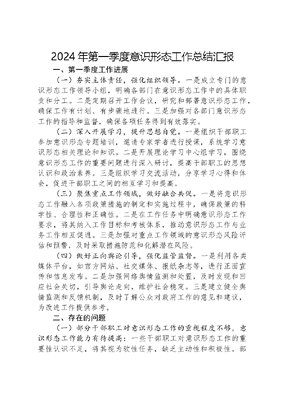 2024年第一季度意识形态工作总结汇报一、第一季度工作进展(一)夯实主体责任,强化组织领导。一是成立专门的意识形态工作领导小组,明确各部门在意识形态工作中的具体职责和分工。二是定期召开工作会议,研究和部署意识形态工作,确保工作有计划、有步骤地进行。三是加强对各部门意识形态工作的指导和监督,确保各项任务得到有效落实。(二)深入开展学习,提升思想自觉。一是组织干部职工参加意识形态专题培训,邀请专家学者进行授课,系统学习意识形态相关理论和知识。二是开展理论学习中心组学习,围绕意识形态工作的重要问题进行深入研讨,提高干部职工的思想认识和政治素养。三是组织学习交流活动,分享学习心得和体会,促进干部职工之间的相互学习和提高。(三)聚焦重点工作领域,做好融合共促。一是将意识形态工作融入各项政策措施的制定和实施过程中,确保政策的科学性、合理性和正确性。二是在工作任务中明确意识形态工作要求,将其纳入工作目标和考核体系,推动意识形态工作与业务工作相互促进。三是加强对重点工作领域的意识形态风险评估和预警,及时采取措施防范和化解潜在风险。(四)做好正向舆论引导,强化监管监督。一是利用各类媒体平台,如官方网站、社交媒体、报纸杂志等,进行正面宣传和信息发布。二是加强网络舆情监测和处置,及时发现和回应社会关切,引导舆论走向,维护社会稳定。三是建立健全舆情监测和反馈机制,及时了解公众对政府工作的意见和建议,为改进工作提供参考。二、存在的问题(一)部分干部职工对意识形态工作的重视程度不够,意识形态工作能力有待提高:一些干部职工对意识形态工作的重要性认识不足,将其视为软性任务,缺乏主动性和积极性。部分干部职工对意识形态工作的方法和技巧掌握不够,缺乏应对复杂情况和突发事件的能力。(二)意识形态工作方法单一,创新性不足,难以满足新时代需求:沿用传统的工作模式和方法,缺乏创新意识和创新能力,不能适应信息时代的发展要求。对新媒体、新技术的运用不够充分,无法有效利用这些资源开展意识形态工作。(三)对意识形态领域的风险研判不够准确,应对措施不够有效:对当前意识形态领域的形势和风险认识不足,缺乏深入的分析和研究。制定的应对措施缺乏针对性和可操作性,不能有效防范和化解意识形态风险。(四)意识形态工作考核机制不够完善,激励约束作用不够明显:考核指标不够科学合理,不能全面准确地反映意识形态工作的实际情况。考核结果与奖惩机制结合不够紧密,对干部职工的激励和约束作用不明显。(五)与其他部门的沟通协调不够顺畅,存在工作推诿现象:部门之间的信息共享和沟通交流不够及时和充分,导致工作衔接不顺畅。存在部门本位主义,对需要协同解决的问题推诿责任,影响工作效率和质量。三、第二季度的工作计划(一)加强教育培训,提高干部职工对意识形态工作的重视和能力:组织开展意识形态工作专题培训,邀请专家学者进行授课,系统讲解意识形态工作的重要性、方法和技巧。定期组织经验交流和案例分析,提高干部职工对意识形态工作的认识和理解。建立健全干部职工教育培训机制,将意识形态工作纳入干部职工的培训内容和考核体系。(二)创新工作方式方法,利用新媒体等手段增强意识形态工作的吸引力和感染力:加强对新媒体的研究和应用,充分利用微信、微博、抖音等平台开展意识形态工作。创新宣传内容和形式,制作推出一批具有吸引力和感染力的宣传作品,提高宣传效果。加强与网民的互动和沟通,及时回应网民关切,文可居文库——海量学习资料,手机电脑均可下载www.wenkeju.com增强网民对政府工作的认同感和支持度。(三)加强风险研判,完善应对措施,提高防范和化解意识形态风险的能力:建立健全意识形态风险研判机制,定期分析和评估意识形态领域的风险和挑战。加强对社会舆情的监测和分析,及时发现和处置潜在的风险和问题。完善应急预案和应对措施,提高对突发事件和危机的应对能力。(四)完善考核机制,强化激励约束,推动意识形态工作责任落实:优化考核指标体系,将意识形态工作纳入政府部门的考核内容,提高考核权重。加强对考核结果的运用,将考核结果与奖惩机制、干部任用等挂钩,形成激励约束效应。建立健全意识形态工作责任追究制度,对工作不力、出现问题的单位和个人进行严肃问责。(五)加强部门间沟通协调,形成工作合力,确保意识形态工作落实到位:建立健全部门间沟通协调机制,定期召开联席会议、工作协调会等,加强信息共享和工作交流。明确各部门在意识形态工作中的职责和分工,加强部门间的协同配合。加强对部门间工作落实情况的监督和检查,确保意识形态工作各项任务落到实处。文可居文库——海量学习资料,手机电脑均可下载www.wenkeju.com