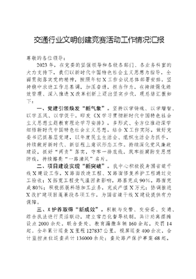 交通行业文明创建竞赛活动工作情况汇报尊敬的各位领导:2023年,在党委的坚强领导和各级各部门、各业务科室的大力支持下,我们以新时代中国特色社会主义思想为指导,全面贯彻落实党的精神,按照年初X工作会议总体部署安排,坚持稳中求进工作总基调,加压奋进,担当作为,在持续强化绩效管理、深入推进X改革创新上迈出坚实步伐,现总结汇报如下:一、党建引领焕发新气象。坚持以学铸魂、以学增智、以学正风、以学促干,印发《X学习贯彻新时代中国特色社会主义思想主题教育理论学习安排》,多形式、全方位推动深学细悟新时代中国特色社会主义思想。结合X工作实际,做好党委书记抓基层党建,以年度民主生活会、组织生活会为抓手,持续做好新时代、新征程上意识形态工作。持续深化党风廉政建设,抓好两责落实,守牢一排底线,筑牢拒腐防变思想防线,持续擦亮一路清风名片。二、项目建设实现新突破。我中心积极投身国省道干线X建设工作,X路面改造工程、X路面修复养护工程通过交工验收;X拓宽工程受气温因素影响,路基完成90%,路面完成80%;积极拓展料场加工业务,完成产值X万元;协调推进X改扩建项目蓬莱段各项工作,为国省道干线X建设提供有力保障。三、X护养取得新成效。积极与交警、交安委、交通、综合执法进行灵活联动,建立常态化督导机制,共计劝离摆摊设点2000余处,联合查处、教育漏撒车辆160余起,处罚14起。全年累计巡查X里程127837公里,视屏巡查400余次,合计监控点位巡查共计136000余处;查处路产保护事案68起,受理涉路工程许可19起,涉路工程监管1200余次。收取X设施损害赔偿费X元,收取国有资源有偿使用费X元;案件查处率、X设施损坏赔偿费回收率均达100%。认真开展X预防性防护和日常性养护基础工作,对全线50座桥梁进行了数据采集;建立北沟X站应急抢险物资库;23年10月X试验段施工通车,目前总体通行情况较好;完成X排水设施改造工程,确保了国省干线X安全畅通,切实提升了群众出行的幸福感、安全感和满意度。四、安全管理交出新答卷。年内印发各类安全文件18个,组织各项应急演练4次,开展安全进基层活动6次,培训一线干部职工140余人次。开展应急救护培训,累计75名职工获得蓬莱区红十字会颁发的心肺复苏培训证书。在全中心范围内开展全员讲安全专项活动,通过职工自编自导自演的安全宣传短视频,营造起人人讲安全、人人重安全的良好氛围。在料场宿舍安装独立式光电烟感报警器,现场声光报警的同时,还可通过关联舍长、安全负责人和主要负责人的微信、电话发送预警信息,以技防+人防相结合,提升干部职工安全防范意识。五、文明创建激发新动能。充分发挥新时代文明实践阵地作用,承办市X中心匠心·传承道德讲堂,聚力推进美德信用五进工程建设与X文化相互赋能、同频共振。多形式多路径组织开展新时代文明实践活动22次、语润仙境宣讲28次、志愿服务活动126次;把为居民解难事、办实事作为首要任务,以高效处理+有效答复的工作模式,妥善解决群众各类12345工单618个;积极对接双报到社区,于六月、十月对X小区314户居民进行了满意度大走访,有效收集社情民意,倾听群众心声。六、预算管理拓展新路径。以预算管理为着眼点,强化财务审计管控。严肃财经纪律,强化内控管理,严格执行先批后支、计划先行,合理调配资金,杜绝超预算、无预算、超范围、超标准等问题的出现。强化资产管理,加强工程领域廉政建设,做好招投标管理,严格执行跟踪审计、第三方审计,根据工程量,提前测算增值税进项税和销项税,调控预算工程成本,为工程管理、工程造价、成本控制等方面提出合理化建议,保证工程利润最大化。七、综合管理激荡新气象。以规范化、精细化管理为主线,全面提升综合管理水平,降低运行损耗;深化智慧X运营,提高全员数字化办公水平,提升行政效能;规范优化人事、劳资管理,依法推进法制工作,和谐促进工团、妇女、档案、离退休、后勤保障等各项工作稳步提升,资源集约、成本核算、内部管理水平提高,全中心综合服务质效持续释放。2023年,我中心在继续保持省级文明单位荣誉基础上,先后荣获奋进新时代塑造新优势创新创优劳动竞赛建功班组、市学习强国先进学习组织、劳动和技能竞赛建功班级等各级集体荣誉18项,省总工会授予的新时代岗位建功劳动竞赛标兵等各级个人荣誉12项,新获实用新型专利1项,全省交通行业优秀质量管理小组三等奖3项。千帆过尽向新行,总结提升再出发。2023年,X各项工作都取得了长足进步,成绩的取得离不开市X中心的坚强领导,相关业务科室和在座各位领导的大力支持帮助,以及全体干部职工的实干担当!站在新的起点上,将始终坚持人民X为人民的发展理念,锚定三讲九抓一守住工作要求,聚焦X工作目标任务,以等不起的紧迫感,