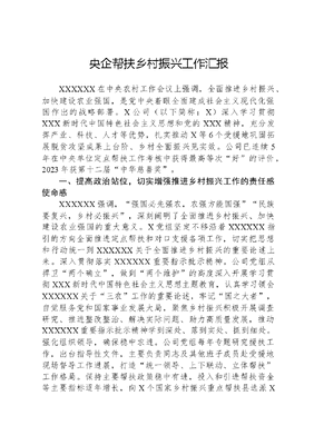 央企帮扶乡村振兴工作汇报XXXXXX在中央农村工作会议上强调,全面推进乡村振兴、加快建设农业强国,是党中央着眼全面建成社会主义现代化强国作出的战略部署。X公司(以下简称:X)深入学习贯彻XXX新时代中国特色社会主义思想和党的XXX精神,充分发挥产业、科技、人才等优势,扎实推动X等6个受援地巩固拓展脱贫攻坚成果上台阶、乡村全面振兴见实效。公司已连续5年在中央单位定点帮扶工作考核中获得最高等次好的评价,2023年获第十二届中华慈善奖。一、提高政治站位,切实增强推进乡村振兴工作的责任感使命感XXXXXX强调,强国必先强农,农强方能国强民族要复兴,乡村必振兴,深刻阐明了全面推进乡村振兴、加快建设农业强国的重大意义。X党组坚定不移沿着XXXXXX指引的方向全面推进定点帮扶和对口支援各项工作,切实把思想和行动统一到XXXXXX关于全面推进乡村振兴的重要论述上来。深入贯彻落实XXXXXX重要指示批示精神。公司党组从捍卫两个确立,做到两个维护的高度深入开展学习贯彻XXX新时代中国特色社会主义思想主题教育,认真学习领会XXXXXX关于三农工作的重要论述,牢记国之大者,自觉服务党和国家事业发展大局,聚焦乡村振兴积极开展调查研究、推进整改整治、解决实际问题、助力高质量发展,推动XXXXXX重要指示批示精神学到深处、落到实处、抓到细处。强化组织领导,确保稳中求进。公司党组每年专题研究援扶工作,出台指导性文件,主要负责同志及其他班子成员赴受援地现场督导工作进展,打造统一领导、上下联动、立体帮扶工作格局。保持主要帮扶政策稳中有进,投入和引进帮扶资金等主要指标逐年增长,向X个国家乡村振兴重点帮扶县选派X名科技特派员,着力建设一支政治过硬、本领过硬、作风过硬的乡村振兴干部队伍。提振精神动力,营造浓厚氛围。公司着力塑造新时代X精气神,认真开展乡村振兴领域不正之风和腐败问题专项整治,加强对帮扶资金和项目的检查监督,严守纪律规矩,强化底线意识。总结宣传创新做法和先进典型,数十次获国家主流媒体报道,多次入选联合国全球减贫案例征集活动、《中央企业助力乡村振兴蓝皮书》,持续营造扶弱济困的浓厚氛围,扩大社会影响力。二、突出产业帮扶,着力促进农业增产增效、农民增收致富XXXXXX强调,产业振兴是乡村振兴的重中之重。X坚持把抓产业促增收作为干好乡村振兴工作的出发点和落脚点,在长期实践中逐步形成了以现代农业产业为引领、多产业齐头并进的产业帮扶格局。创新打造MAP模式。X现代农业技术服务平台(MAP)聚焦做好土特产文章。公司在受援地全面布局、建设MAP现代农业技术服务中心、示范农场和农牧业现代产业园,以良种+良法带领农民获得好收成,以品控溯源+溢价订单帮助农民卖出好价钱,以发展数字农业为农业产业集成大数据,形成了规模经营+多方合作的阿旗模式、良品优技+示范带动的林西模式、盘活资本+一二产融合的古浪模式、精品种植+一村一品的平山模式。探索种养循环模式。在林西县,公司依托自有技术设备,创建从养殖粪污收集利用,到有机废弃物深加工还田提升土壤地力,再到以健康土壤服务农业种植的全链条模式,建设1年2季大白菜种植基地,并配套现代育苗工厂、水肥一体化和智慧农业系统全流程服务,同步建设大型碳中和污水处理站和配套管网。此外,公司在X市开展盐碱地综合治理与利用系统示范工程,并形成盐碱地水田综合治理技术体系,得到《人民日报》《新闻联播》关注和报道。深耕农业普惠金融。公司结合业务场景开发农资贷、农产贷、农机贷、种植贷等多个业务品种,为农户提供耕种管收全流程金融支持,覆盖X个种植大省。同时,公司充分发挥信托模式跨市场、多金融工具集成的优势,基于农户和市场需求,灵活设计符合三农特点的乡村振兴综合服务方案,同步打造线上系统平台,简化贷款办理流程,切实解决农民贷款难烦贵的问题。。三、稳固脱贫根基,不断激发脱贫地区和脱贫群众内生发展动力XXXXXX强调,巩固拓展脱贫攻坚成果是全面推进乡村振兴的底线任务,要继续压紧压实责任,坚决防止出现整村整乡返贫现象。X严格落实四个不摘要求,加大对国家乡村振兴重点帮扶县和易地扶贫搬迁集中安置区的倾斜支持力度,帮助受援地坚守住不发生规模性返贫的底线。持续巩固提升三保障和饮水、生活保障水平。公司重点帮助解决受援地义务教育、基本医疗、住房安全以及饮水安全、生活保障等领域突出问题,捐赠X辆医疗救护车、X台医疗设备、X万册图书。连续11年组织员工开展圆梦助学行动,创新引入慈善信托模式提升项目运营质效,2023年员工自愿捐助X余万元,帮扶学生X余人,并在受援地开展奖教金奖学金自强班等项目。全方位赋能稳就业促发展。公司采取走出去+请进来线上+线下政策解读+技术指导等方式2
