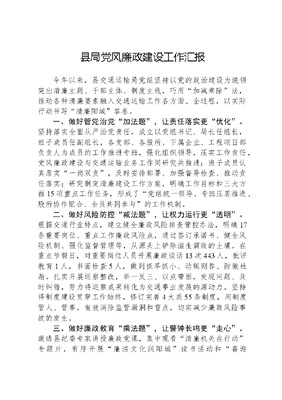 县局党风廉政建设工作汇报今年以来,县交通运输局党组坚持以党的政治建设为统领突出清廉主题、干部主体、制度主线,巧用加减乘除法,推动各种清廉要素融入交通运输工作各方面、全过程,以实际行动书写清廉阳城答卷。一、做好管党治党加法题,让责任落实更优化。坚持落实全面从严治党责任,成立以党组书记、局长任组长,班子成员任副组长,各支部、各股所、下属企业、工程项目部负责人为成员的工作推进专班,强化组织领导,压实工作责任,党风廉政建设与交通运输业务工作同研究共推进;班子成员认真落实一岗双责,及时安排部署、加强督导检查、推动责任落实;研究制定清廉建设工作方案,明确工作目标和三大方面15项重点工作任务,形成了党组统一领导、专班压茬推进、股所协作配合、全员共同参与的工作机制。二、做好风险防控减法题,让权力运行更透明。根据交通行业特点,建立健全廉政风险排查管控办法,明确17条重要岗位、重点工作廉政风险点,通过签订承诺书、健全风险机制、强化监督管理等,从源头上铲除滋生腐败的土壤。在重点节假日,对重要岗位人员开展廉政谈话13次443人,批评教育1人,书面检查5人,做到抓早抓小、动辄则咎、防微杜渐。扎实开展巡察整改,举一反三、以点带面,发现问题、及时纠错,努力将巡察成果转化为交通事业发展的源动力。坚持将制度建设贯穿工作始终,修订完善4大类55条制度,用制度管人、管事,有效消除监管漏洞和盲点,切实减少廉政风险事故的发生。三、做好廉政教育乘法题,让警钟长鸣更走心。邀请县纪委专家讲授廉政党课,集中观看清廉机关在行动专题片,有序开展廉洁文化润阳城读书活动和喜迎XXX、翰墨颂廉洁主题展,传承廉洁文化,弘扬清风正气。坚持以案促改,集中收看警示教育片《*》、通报典型案例,引导党员干部心存敬畏、自警自醒。积极开展红色教育和廉政教育主题党日活动,让党员干部有所思、有所悟,常怀律己之心,保持良好作风,树立良好形象。全年组织开展党组中心组学习24次,党员干部职工集中学习24次,党组书记讲党课4次,每人撰写心得体会5篇。四、做好作风建设除法题,让服务为民更暖心。经常开展思想教育与谈心谈话,了解党员干部所思所想,对上班纪律、工作态度、服务作风等方面问题及时提醒改正,消除不良风气。持续开展道路运输从业人员素质教育,强化服务理念,提升服务质量;开展执法人员行政执法培训,规范执法行为,提高执法水平。研究出台办事不求人工作方案,优化办事流程,改善营商环境。聚焦重点领域、重点环节,一体推进不敢腐、不能腐、不想腐体制机制建设。强化五级公交运营管理,有效推动我为群众办实事常态化,协调开通10路城市公交,有效解决演礼快速通道沿线群众出行难题。五、存在的问题及下一步工作打算虽然我局党风廉政建设工作取得了一定成效,但依然存在一些问题:一是主动监督意识有待进一步增强。我们习惯于贯彻上级纪委工作安排及部署,对本单位党风廉政建设工作缺乏系统调查和研究。二是队伍整体素质有待进一步提高。表现在当前如何尽快适应工作中的新形势和任务,知识层面和业务能力亟需提升。三是自我监督方式有待进一步加强。主要是对工作效能、廉洁自律方面监督的多,对品德修养等其他方面监督的少;对工作八小时以内监督的多,对八小时以外监督的少。下一步,我们将围绕四个方面开展工作:一是加强党风廉政建设学习,切实落实党风廉政建设的两个责任,二是认真梳理党风廉政和反腐败工作存在的不足,建立健全党风廉政的各项制度,通过教育和制度的落实,确保队伍的廉洁。三是深入落实中央八项规定精神,持之以恒纠正四风方面存在的问题,继续加大正风肃纪力度,杜绝违纪违规行为发生,确保我局各项工作顺利推进。
