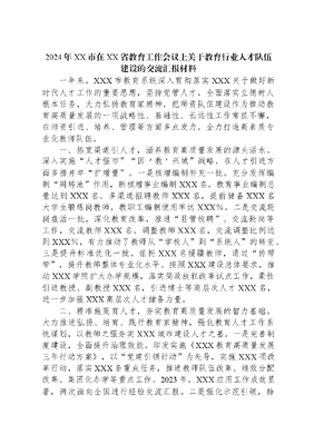 2024年XX市在XX省教育工作会议上关于教育行业人才队伍建设的交流汇报材料一年来,XXX市教育系统深入贯彻落实XXX关于做好新时代人才工作的重要思想,坚持党管人才,全面落实立德树人根本任务,大力弘扬教育家精神,把师资队伍建设作为推动教育高质量发展的一项战略性、基础性、长远性工作常抓不懈,在师资引进、培养、管理等方面多点发力,全力打造高素质专业化教师队伍。一、拓宽渠道引人才,涵养教育高质量发展的源头活水。深入实施人才强市因ʻ教ʼ兴城战略,在人才引进方面多措并举扩增量。一是核增编制补充一批。充分发挥编制周转池作用,新核增事业编制XXX名,教育事业编制总量达到XXX名。多渠道招聘教师XXX名,提前储备XXX名大学生锻炼岗教师,教职工编制使用率达XXX%。二是交流轮岗盘活一批。深化教育改革,推进县管校聘、交流轮岗等工作,交流教师XXX名,调整教师XXX名,交流调整比例达到XXX%,有力推动了教师从学校人到系统人的转变。三是提升标准优化一批。依托XXX名援疆教师,通过传帮带,提升教师整体专业化水平。按照XXX建设总体要求,推动XXX学院扩大办学规模,落实简政放权改革试点工作,柔性引进教授、副教授XXX名,引进博士等高层次人才XXX名,进一步加强XXX高层次人才储备力量。二、精准施策育人才,夯实教育高质量发展的智力基础。大力推进弘扬、培育、践行教育家精神,强化教育人才工作系统谋划,以教师之强夯实XXX城市建设人才之基。一是完善制度建设,全面提升治理效能。印发实施《XXX教育高质量发展三年行动方案》,以党建引领行动为先导,实施XXX项改革行动,落实XXX条重点任务,推进教师队伍改革、绩效分配改革、集团化办学等重点工作。2023年,XXX应用工作成效显著,两次面向全国进行经验交流汇报。二是强化示范引领,持续推动作风转变。印发实施师德师风建设三年行动计划,建立健全宣传、教育、考核、奖惩、监督五位一体的师德建设长效机制。评选师德标兵XXX名;XXX个XXX名班主任工作室被评定为优秀,师德师风建设再上新台阶。三是聚焦能力提升,构建协同培养机制。印发实施XXX三年行动计划,依托XXX个教育集团,组建学科教研基地XXX个,大力开展学、训、赛、督、研五位一体的集团教研活动,提升教师素养和教师执教水平。健全教师发展培训体系,发挥XXX个国家级,XXX个省级三名工作室头雁引领作用,XXX市三名工作室增加至XXX个,师资培养形成雁阵效应。近三年,XXX市本级累计投入XXX万元,继续教育累计XXX人次。2023年,XXX市在XXX教学类赛事中获奖项XXX个,其中一等奖占XXX%以上。三、千方百计留人才,激发教育高质量发展的持久动力。把留住人才作为教育高质量发展的重头戏,关心解决好涉及教师切身利益的关键事。一是创建优越的干事创业环境。落实学校领导干部选拔任用制度,建立XXX人的后备干部库,选拔XXX名优秀骨干进行集中培训,提拔XXX名优秀中层干部担任学校领导职务。实施学科带头人骨干教师梯队攀升计划,选拔XXX市各类骨干教师XXX名。畅通职称晋升通道,完成XXX名教师职称评审,岗位晋升人数达到XXX名,教师干事创业的积极性明显提升。二是营造浓厚的尊师重教氛围。以全媒体矩阵讲好教师故事,注重发挥正向激励作用,评优评先、表彰奖励等向XXX及一线教师倾斜,评选最美教师、优秀教师等XXX名。三是落实拴心留人的保障待遇。建立健全义务教育教师平均工资收入不低于公务员长效机制,足额发放XXX教师补贴。加强对教师队伍的关心关爱,按照高级职称XXX元、其他教师XXX元的标准,常态化开展教师每年一次的健康体检工作;解决XXX名教师夫妻两地分居问题;为XXX名新入职教师提供周转房。XXX本级财政划拨近XXX万文可居文库——海量学习资料,手机电脑均可下载www.wenkeju.com元,对幼儿园临聘教师实行同工同酬。逐步压缩使用编制的非教学人员比例,XXX本级投入XXX余万元保障政府购买服务人员待遇,做优后勤服务。下一步,XXX市教育系统将深入学习XXXXXX关于教育的重要论述,牢牢把握教育的政治属性、战略属性、民生属性,主动融入XXX大局,建强教育人才队伍,为建设XXX城市做出教育应有的贡献。文可居文库——海量学习资料,手机电脑均可下载www.wenkeju.com