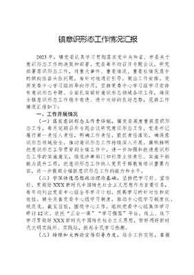 镇意识形态工作情况汇报2023年,镇党委认真学习贯彻落实党中央和省、市委关于意识形态工作的决策和部署。党委每年均召开专题会议,研究部署意识形态工作,对重大事件、重要情况、重要社情民意中的倾向性苗头性问题,有针对地进行引导,做出工作安排。发挥党委中心学习组的导向作用,坚持党委中心学习组学习安排有意识形态专题。全面扎实做好意识形态领域各项工作,确保全镇意识形态工作稳中有进、进中向好的良好态势,现将工作情况汇报如下:一、工作开展情况(一)落实意识形态工作责任制。镇党委高度重视意识形态工作,每月定期召开专题会议研究意识形态工作,党委书记履行第一责任人责任,明确工作责任,狠抓责任落实,确保意识形态领域安全,推动意识形态工作持续深入开展,旗帜鲜明把意识形态工作贯穿到全镇工作中,进一步加强和改进意识形态工作的实施意见,强化涉事部门和村居主体责任。实施干部能力提升工程,把意识形态工作纳入党员干部教育培训重要内容,进一步提高全镇抓意识形态工作的能力和水平。(二)学深悟透思想政治理论基础。坚持把学习好、宣传好、贯彻好XXX新时代中国特色社会主义思想作为首要任务,每年均列出党委中心组全年学习计划,提高学习的针对性和实效性。健全完善党委中心组学习制度,推动中心组学习制度化、规范化。截至目前,围绕中心工作,组织党委中心组集体学习研讨12次。依托三会一课学习强国平台,线上、线下学习贯彻好XXX新时代中国特色社会主义思想,管好用好新时代文明实践所、实践站,掀起全民学习热潮。(三)持续加大舆论宣传引导力度。结合工作实际,掌握舆论宣传要点和工作思路,深入挖掘我镇工作亮点,从内容、形式等方面综合发力,有重点地打造有影响力X品牌,根据年度宣传工作重点工作计划,力争在人民日报、新华网等重量级报刊,同时积极对上X省电视台、X市电视台等上级电视媒体栏目,以正确的舆论导向为引导,耐心宣传解读各项政策,协调化解群众矛盾问题,以富有成效的宣传报道强有力推动工作,切实传播X声音、提升X形象、打造X品牌。(四)加强阵地管理倡树文明文化。以X镇三创一提升创建工作为重要抓手,全力全速推进创建全国文明城市、全国卫生乡镇、镇驻地提升工作,着力推进环境综合治理、文明出行、文明餐桌等重点工作,围绕移风易俗、文明创建、倡树美德新生活开展宣传宣讲活动上传至邹鲁融媒平台200余条,推动文明新风深入人心,不断提升全镇环境面貌和群众文明素质。深入推进新时代文明实践工作,打造X志愿服务品牌,优化全镇37个实践站,切实发挥文明实践志愿队伍先锋作用。(五)细化工作措施应对网络舆情。深入排查梳理涉网各类风险隐患,建立隐患台账,逐条制定防控措施,切实维护网络意识形态安全。建立村、办事处、镇三级舆情管理应急队伍,及时关注相关舆情危机事件及其苗头动向,分析评估态势趋向和可能产生的社会效果,掌握舆论的主动权和话语权。组织镇级舆情处置专项培训会12次,增强了网军成员的舆情意识和舆情应急处置技能,开展党政机关所属网站及新媒体账号信息安全专项督导检查,政务网站、微博微信、互联网应用系统进行登记备案。二、存在的主要问题及下步工作计划当前,全镇意识形态领域总体形势积极健康向上,但依然存在薄弱环节和问题。一是系统地学习政治理论方面较欠缺;二是面对探索新形势下工作开展的新思路、新方法较少,工作的标准性和方案性有待进一步加强;三是思想政治学习工作要进一步加强;四是学习相关业务知识的积极性不够高,工作不文可居文库——海量学习资料,手机电脑下载www.wenkeju.com扎实。这些问题需要引起高度重视,采取有力措施加以解决,牢牢掌握意识形态工作的领导权、管理权、话语权。下步,镇将针对以上问题采取有力措施加以解决。(一)提高政治站位,强化理论学习。镇党委政府把要学习贯彻XXX新时代中国特色社会主义思想作为第一议题要求写入党委议事规则,列入党委会、理论学习中心组重要议程。坚持党委领导班子带头学、党支部委员会组织学、普通党员广泛学,及时深入学习党的创新理论,在全镇向下营造人人争当先进的浓厚氛围。(二)持续壮大意识形态主阵地。深化2处宗教活动场所规范化建设,每月定期开展点对点深入调研、分析研判,严厉打击非法宗教传播和邪教势力渗透;用足用好37处新时代文明实践所、实践站建设,以X志愿服务为主要抓手,确保所有村居实践站发挥平台载体作用,力争达到周周有活动、月月有主题新时代文明新风尚,全力助推我镇新时代文明实践志愿活动创新有效开展。(三)确保意识形态工作落地落实。完善全镇X意识形态安全预警和分析研判体系,围绕镇党委政府项目建设、城镇开发、民生事业、新时代文明实践、党的建设等重点工作,精准开展舆情监测与研判,排查梳理意识形态风险点,加强风险预警和管控。健全舆情应急处置联动机制,完善每季度舆情管控