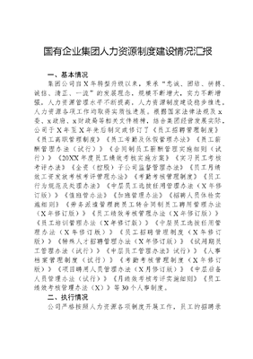 国有企业集团人力资源制度建设情况汇报一、基本情况集团公司自X年转型升级以来,秉承忠诚、团结、拼搏、诚信、清正、一流的发展理念,规模不断增大,实力不断增强,人力资源管理水平不断提高,人力资源制度建设稳步推进,人力资源各项工作均取得实质性进展。根据国家法律法规及x委、x政府、x财政局等相关文件精神,结合集团经营发展实际,公司于X年至X年先后制定或修订了《员工招聘管理制度》《员工离职管理制度》《员工考勤及休假管理办法》《员工薪酬管理办法(试行)》《合同制员工薪酬管理实施细则(试行)》《20XX年度员工绩效考核实施方案》《实习员工考核考评办法》《全资(控股)子公司监督管理办法》《员工月绩效工资发放考核考评管理办法》《考勤考核管理制度》《员工行为规范及处理办法》《中层员工选拔任用管理办法(X年修订版)》《值班管办法》《加班管理办法》《招聘人员体检实施细则》《劳务派遣管理岗员工转合同制员工聘用管理办法(X年修订版)》《员工绩效考核管理办法(X年修订版)》《员工培训管理办法(X年修订版)》《中层员工选拔任用管理办法(X年修订版)》《员工招聘管理制度(X年修订版)》《特殊人才招聘管理办法(X年修订版)》《试用期员工管理办法(试行)》《中层员工管理办法》试行)》《人事档案管理制度(试行)》《考勤考核管理制度(X年修订版)》《项目聘用人员管理办法(X月修订版)》《中层后备人员管理办法(试行)》《月绩效考核考评实施细则》《员工绩效考核管理办法(X)》等30个人事制度。二、执行情况公司严格按照人力资源各项制度开展工作,员工的招聘录用、员工的考核考评、人才的选拔培养、人事档案的分类管理工作正常有序。如员工的月绩效考核,月绩效考核主要是对员工每月工作业绩进行量化考核,考核员工对月工作目标任务完成情况以及月度内履行自身岗位职责所体现出的工作内容、做出的成绩等。考核流程为员工次月初根据上个月完成工作任务情况填写《员工月绩效考核考评表》,进行逐层评分(被考核人自评→分管领导考评→总经理考评→董事长考评)后,交由监督审计室统分汇总,最后由人力资源部根据考核结果进行运用(即根据考核分数进行月绩效工资的核算)。三、存在问题与不足随着集团公司的发展壮大,用工形式由单一的合同制用工逐步转为以合同制用工为主,劳务派遣用工、项目临聘用工、劳务用工等相结合的多元化用工形式,人员逐渐增多,专业性人才短缺的现象日益突出,人力资源制度的建设已不能完全满足公司发展的需要,人力资源制度的执行和完善方面还存在以下问题:(一)绩效考核制度不够健全。X年以来,绩效考核制度的制定与经营目标系数、岗位层级系数以及考核等次系数紧密结合,但由于在经济指标的确定和考核考评上力度较弱,考核制度不能很好地执行到位。X以来,集团公司进一步健全了员工绩效考核的激励约束机制,在原绩效制度基础上进行了大胆改革创新,打破了以往平均主义吃大锅饭现象,但要真正体现功效挂钩、酬应其值的绩效分配制度,还需进一步完善。(二)培训制度执行力较弱。俗语讲玉不琢不成器,再有潜质的员工,若不受到良好的培训也难以发挥更大作用。近几年,虽然集团内部进行了入职培训工作,但因培训内容仅涉及公司的企业文化、规章制度,礼节礼仪、心理健康等方面的内容,培训内容偏少,培训执行力度不够,使培训达不到预期的效果;因为公司业务繁多以及疫情原因,员工外出培训学习机会较少,难以学到同行先进的管理经验和技术成果。(三)中层后备人员管理制度不够完善。近年来,随着公司开发建设、物资贸易、医疗健康、新能源、金融创新、城市服务六大主业的相继发展,涌现出了一批能干事、想干事、会干事的员工,为了增加员工的积极性和创造性,公司也大胆提拔使用了一些政治素质过硬、业务能力突出的优秀员工,但因职数有限,制度建设不够完善,影响了员工的工作热情,员工成长速度较为缓慢。(四)人才流动性不强。集团公司在人事管理制度上存在人员和岗位固定的现象,这不利用公司的改革和发展,因此应加强人才的流动与岗位的轮换。在公司的发展中有些业务部门岗位人员较为固定,虽然有利于公司工作的稳定性,但从长时间来看,人才的流动是非常必要的,这可以回避公司管理中出现的漏洞,减少舞弊行为的发生,同时也能够促进公司人事管理水平的提升。四、下一步改进措施针对上述这些问题,人力资源部门将进一步改革方法,更新观念,强化措施,认真加以解决。(一)进一步建立健全绩效考核约束机制。真正激发员工紧紧围绕企业战略目标,高效完成公司各项工作目标任务,促进公司又好又快发展。(二)进一步加强培训制度执行力度。有针对性地制定培训计划,丰富培训内容,使公司内部培训和外部培训有效结合,增加员工外出培训学习考察的机会,通过学习增强业务知识和能力,更好地为公司发展服务。(三)进一步完善中层后备人员管理制度。强化优秀年轻干部的选拔培养,着力