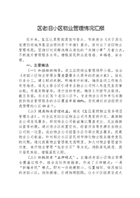 区老旧小区物业管理情况汇报近年来,X区认真贯彻落实市委办、市政府办《关于深化党建引领城市基层治理的若干举措》要求,面对当下老旧物业管理难题,坚持以切实解决群众身边的关键小事为着力点,不断提升管理服务水平,增强居民群众获得感、幸福感、安全感。一、主要做法(一)加强组织领导。成立区级物业管理领导小组,出台《老旧小区物业管理全覆盖暨服务大提升的实施方案》,细化任务分工,建立联动机制,明确考评标准,确保各项工作有力有序推进。将无主管小区引进专业物业公司列入年度民生实事台账,开展定期督导,进行目标考核,确保工作按节点推进。截至目前,在全区X个老旧小区中,专业物业公司和单位后勤提供物业管理服务的小区覆盖率超80%,居民通过自治组织自我管理的小区40余个。(二)提高物业管理收益。制定《X区星级物业服务项目管理办法》,对全区老旧小区物业公司开展星级评定,激励物业公司优化服务。针对物业公司收益难以覆盖支出、无法维持运营等问题,通过将小区闲置空间、经营用房等资源交由物业公司统一运营,或由物业公司经营小区内部分商业服务,提高物业公司收益。针对部分小区居民对市场化物业服务接受度低的问题,通过提高物业管理收支透明度、加大对物业管理宣传力度、推行物业管理先尝后买等方式,消除居民疑虑、提升居民体验、增强居民认同。(三)积极探索五种模式。在推进老旧小区物业管理全覆盖过程中,结合实际积极探索,形成了五种模式:一是拆墙并院模式,即对一些规模较小、位置相邻、情况相似的老旧小区,拆除围墙、打通物理阻隔,让小片区组团变成大社区,通过扩大经营规模降低物业服务成本,引进专业物业公司入驻。二是以大带小模式,即把规模较小的零星住宅纳入临近规模较大小区的物业服务范围,通过以大带小、肥瘦搭配,共享物业管理服务。三是资源兑换模式,即把小区周边部分市政服务项目,打包交给承担小区物业服务的公司,提高物业公司收益,吸引物业公司入驻。部分背街小巷的道路清扫、绿化管养、小游园、公厕清洁等资源,成功吸引物业公司为辖区内无物业小区提供服务。四是志愿服务模式,即社区党委通过一定激励措施,引导小区各类志愿服务力量,为小区提供部分物业服务。五是红色物业模式,通过向物业公司选派物业党建指导员、小区党支部与物业党支部成员双向进入、交叉任职等方式,将社区物业打造成党的工作队,以基层党建引领物业管理,巩固提升物业管理覆盖成果。二、存在的困难问题虽然我区老旧小区物业管理工作取得了一定成效,但还有100余个小区尚未实现物业管理覆盖,主要存在以下问题:一是部分老旧小区管理成本高、收益低、收费难,物业公司不愿入驻。二是部分老旧小区既不具备引入专业物业公司条件,居民又缺乏自我管理自我服务能力,导致物业失管三、下一步工作打算(一)坚持市场和公益相结合,因地制宜分类施策。指导不具备引入专业化物业管理的小区,通过居民自我管理自我服务解决基础物业问题,同时注重用好用活市场化手段提升管理服务水平。充分借鉴先进经验、结合实际情况,选择物业服务企业接管、居民自治组织自管等不同模式,实现无物业老旧小区有组织机构、有清扫保洁、有物业维修保养、有绿化养护、有安全防范、有停车管理的基本物业服务目标。(二)坚持运营思维,创新解决收益难题。顺利引入专业化市场化物业管理公司,以系统思维考虑问题,打破原有的空文可居文库——海量学习资料,手机电脑均可下载www.wenkeju.com间界限和服务界限,通过捆绑打包,发挥规模效应,解决物业管理公司无利可图的问题。在充分调研的基础上,统筹整合资源,为引进物业管理公司扫清障碍、创造条件,通过拆墙并院、以大带小等方式扩大物业管理区域,降低物业管理成本,促使物业管理公司薄利多销;通过盘活小区停车位、广告位、闲置房屋等公共资源,承揽小区养老、托幼、家政、维修等有偿便民服务,承接小区周边背街小巷清扫、游园绿地管养等市政项目,拓展物业管理公司收入来源,平衡物业管理成本,使居民花更少的钱、享受更多更好的服务。(三)坚持权利和义务相统一,提升居民付费意识。引导居民转变传统观念,培养有偿享受物业服务的意识。通过媒体报道、入户走访、发放宣传册等方式,宣传解读物业服务法规政策,引导居民正确认识付费购买服务的必要性和必然性。建立物业费收支情况公开制度,增加物业管理服务透明度,增强群众对物业公司的信任。(四)坚持群众主体,提高居民自我服务能力。加快培育居民自治组织,对具备成立业主委员会条件的小区,由街道办事处指导、监督业主依法选举业主委员会;对暂时无法成立业主委员会的小区,由街道办事处牵头组建物业管理委员会或自管小组。指导居民自治组织规范化开展工作,制定小区管理规约、业主大会议事规则、专项维修基金管理规约等制度,提高管理服务水平。引导志愿者参与物业服务,制