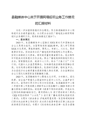 县融媒体中心关于开展网络视听业务工作情况的汇报材料为进一步加强网络意识形态建设,努力推进融媒体中心网络视听业务高质量发展,全力配合自治区广播电视台做好网络视听业务调研工作,现将具体情况汇报如下:一、基本情况2023年,X县融媒体中心坚持以XXX新时代中国特色社会主义思想为指导,全面贯彻党的XXX精神,深入学习贯彻XXX文化思想,聚焦举旗帜、聚民心、育新人、兴文化、展形象使命任务,坚决落实全区广播电视和网络视听工作总要求,坚定扛起新的文化使命,锚定高质量发展首要任务,突出铸牢中华民族共同体意识工作主线,聚合广播电视和网络视听两大业务,紧紧围绕县委、政府中心工作,结合三基三力三年行动,巩固壮大主流思想舆论,加快推进我县媒体深度融合发展,切实构建全媒体传播体系,弘扬时代旋律,唱响X声音,为全县经济社会高质量发展提供强大舆论支撑,为全面建设社会主义现代化美丽新X贡献融媒力量。2023年,X县融媒体中心聚焦生态文明、乡村振兴、深化改革、安全生产等重大主题宣传和全县中心工作,主流声音不断壮大,宣传的引导力和公信力切实提高。X县融媒体中心第二季度和第三节度连续上榜新华社全国县融中心2023年综合传播力影响力调研报告;短视频《我看不到你的容颜,但我永远记得你的奉献!谢谢你们,最可爱的人!》获宁夏好新闻三等奖;《XX村里的喂养小分队》获宁夏广播电视奖电视新闻类三等奖;专题片《崇法善治 护航高质量发展—X县跨领域跨部门综合执法改革工作纪实》成功助力我县申报全区第三批法治政府建设示范地区;专题片《打造特色美食品牌—X县全面推进餐饮行业高质量发展纪实》助力我县获评浪宁夏·品味道2023XX美食文化节全区餐饮行业发展环境最优县。发挥新媒体传播优势,持续主攻短视频摄制、加强网络直播频次,不断提高报道的传播力和影响力,策划推出《乡村振兴看这里 乡村小夜市 点燃乡村夜经济》《躬耕教坛 强国有我 买晓燕:把爱传递给每个学生》等高质量的短视频佳作;铸牢中华民族共同体意识方面,先后开设《民族团结故事我来讲》《闽宁山海情》 《石榴花开 籽籽X》 《X好吃头》等话题栏目,受到广泛好评;发挥全媒传播优势,通过X融媒视频号、抖音号直播红色X·魅力旱塬宁夏折腰沟赛车旅游文化节开幕式和整个赛事,仅X融媒直播平台收看达7万余人次,外部链接观看人次上千万。二、2024年工作重点1.突出实,抓牢主责主业大道至简,实干为要。2024年,融媒体中心将继续围绕全区广播电视和网络视听总要求、全面落实县委政府中心工作、服务经济社会发展大局,积极策划主题宣传报道,为各项重点工作舆论开道,坚持一手抓传统媒体、一手抓网络视听,精简精办频率频道,提质增效、轻装上阵,全力塑造业务清晰、协同发展的全媒体发展新格局。一是围绕主题主流,认真学习宣传贯彻党的XXX精神,强化正面宣传,壮大主流舆论,加强阵地管理,聚焦聚力用党的创新理论武装党员、教育人民的首要任务,持续深化广播电视媒体头条建设、网络视听平台首页首屏首条建设和短视频首屏首推工程,策划推出新闻系列专栏《奋进新征程》、短视频《XXX文化思想》、新媒图文《学习进行时》《每日一学》、新闻系列《我为群众办实事》、电视专栏《我的故事》等栏目。二是紧扣铸牢中华民族共同体意识主线,充分发挥主流媒体优势和新媒传播特点,推出一批受众喜爱、刷屏热传的可视化、交互式融媒体产品,更好强信心、聚民心、暖人心、筑X。继续办好电视专栏《石文可居文库——海量学习资料,手机电脑均可下载www.wenkeju.com榴花开 籽籽X》《今儿个来说法》、新闻系列《移风易俗大家谈》、短视频《X好吃头》、开设新媒图文《探秘X》、电视专栏《追寻红色记忆》。三是聚焦乡村全面振兴样板县建设,充分发挥平台优势,重点围绕全县农村基础设施建设和产业发展的成效,唱响经济发展光明论。继续办好《X话共富》、《我的家乡有特产》专栏、推出短视频《瞰见 X好村光》、新闻系列《希望的田野》。2.强化融,推动媒体融合融为一体,合而为一。2024年,X县融媒体中心将继续深入贯彻落实XXXXXX关于媒体融合发展的重要论述和党中央、国务院关于推进媒体深度融合发展的各项决策部署,顺应全程媒体、全息媒体、全员媒体、全效媒体的发展大势,着眼于夯实党执政的社会基础、群众基础,推动传统媒体与新兴媒体在体制机制、政策措施、流程管理、人才结构、内容渠道、平台人员、经营管理等方面深度融合。一是人员管理机制坚持统筹兼顾、综合平衡,逐步打破身份和资历限制,工作人员实行同工同酬、按绩定薪的量化考核机制;合同聘用人员工作认真负责、能力业绩突出也可纳入单位中层。同时,不断完善和落实考勤管理、内容审核、学习培训、安全保障、应急处置等一系列管理制度,促进实现各种资源充分融合、人员高效协调。二是建强用好县融