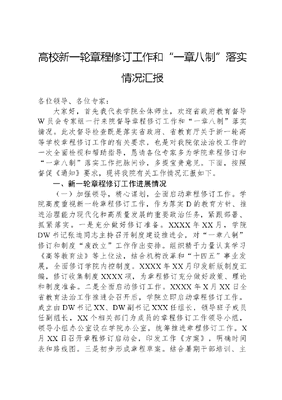 高校新一轮章程修订工作和一章八制落实情况汇报各位领导、各位专家:大家好,首先我代表学院全体师生,欢迎省政府教育督导W员会专家组一行来院督导章程修订工作和一章八制落实情况。此次督导检查既是落实省政府、省教育厅关于新一轮高等学校章程修订工作的有关要求,也是对我院依法治校工作的一次全面检视和帮助指导,恳请各位专家多为学院章程修订和一章八制落实工作把脉问诊,多提宝贵意见。下面,按照督促《通知》要求,现将我院有关工作情况汇报如下。一、新一轮章程修订工作进展情况(一)加强领导,精心谋划,全面启动章程修订工作。学院高度重视新一轮章程修订工作,作为落实D的教育方针、推进治理能力现代化和高质量发展的重要政治任务,紧跟部署、抓紧落实。一是充分做好修订准备。XXXX年XX月,学院DW书记张迪同志主持召开制度建设推进会,对一章八制修订和制度废改立工作作出安排。组织精干力量认真学习《高等教育法》等上位法,结合机构改革和十四五事业发展,全面修订学院内控制度。XXXX年XX月印发新版制度汇编,修订收集制度XXXX项,为章程修订充分做好政策、理论和制度准备。二是全面启动修订工作。XXXX年X月XX日全省教育法治工作推进会召开后,学院立即启动章程修订工作。成立由DW书记XX、DW副书记XXX任组长,领导班子成员任副组长,XX个相关部门为成员的章程修订工作领导小组,领导小组办公室设在学院办公室,统筹推进章程修订工作。X月XX日召开章程修订启动会,印发工作《方案》,明确时间表和路线图。三是初步形成章程草案。结合暑期干部培训、主题教育等,认真学习相关法规政策,组织相关职能部门修订章程对应条款,9月底形成章程修订草案。XX月XX日召开教代会讨论章程草案,就章程起草情况做出说明。XX月XX日召开院长办公会,审议章程草案和起草说明,以及征求意见情况。XX月XX日召开DW常W会,第一次审议章程草案,尚未形成审定意见。(二)紧跟政策,结合院情,保证章程稳定性适用性。学院紧跟国家政策导向,密切结合事业发展实际,科学精准、务实重效推进章程修订工作。一是坚持依法依规。认真对照《教育部办公厅关于启动新一轮高等学校章程修订工作的通知》和省教育厅要求,严把章程修订责任关、质量关、程序关、组织关。严格按照《高等教育法》《职业教育法》《高校基层D组织工作条例》等法规政策,依法科学规范修订章程。例如根据《职业教育法》,在章程举办者章节中,增加按照国家规定和高职院校经费标准,按期足额拨款,保证学院办学经费,逐步增加办学投入表述。二是突出修订重点。突出加强高校D的建设、落实立德树人根本任务、新时代学院改革发展目标定位等重点,集中修订章程重要条文。例如将XXXX新时代中国特色社会主义思想等加入办学指导思想;将XXXX,XXXX高职学院办学目标修改为XXXX、XXXX职业大学等。三是紧跟决策部署。紧紧围绕D的十九大以来特别是D的XX大报告中对职业教育改革发展的新决策新部署,认真落实全国教育大会等会议精神,以及中办、国办《关于深化现代职业教育体系建设改革的意见》等文件精神,充分运用学院十四五规划中期研判结果,确保章程修订上接天线、下接地气,为引领学院未来改革发展提供根本保障。例如:在学院功能与教育形式章节中,增加统筹职业教育、高等教育、继续教育,推进职普融通、产教融合、科教融汇,培养高素质技术技能人才、大国工匠、能工巧匠表述等。文可居文库——海量学习资料,手机电脑均可下载www.wenkeju.com(三)严格程序,汇集众智,充分调研吸纳各方意见。学院严格按照《高等学校章程制定暂行办法》规定程序,扎实规范推进章程修订工作。一是充分调研论证。全面总结分析学院章程建设的历史沿革和现实情况,并对XX职院、XX职院等十余所兄弟院校章程修订情况系统分析,就市属高职院校治理体系、DW领导下的院长负责制、校院两级管理体制等具体问题专题调研论证。二是广泛征求意见。遵循科学、民主、公开的原则,使章程修订成为学校凝聚共识、促进管理、增进和谐的过程。组织召开座谈会和书面意见征集,在校园网发布公告,设置意见邮箱等多种形式,广泛公开征求院领导、院内各部门、师生员工、校友和社会各界等意见建议,有效保证了章程的科学性民主性。三是持续修改完善。坚持问题导向,深入分析学院《十四五发展规划》《高质量发展意见》以及近年来亟待解决的体制机制问题,认真研究遴选采纳意见,突出XX特色,体现大职教思想,形成与中国特色高水平高职院校及学院新三步走发展战略、2035远景目标相适应的办学定位、发展目标、治理体系和责任义务等,打造了科学有效的核心制度基础。二、一章八制落实情况(一)章程实施情况。学院坚持把章程学习贯彻作为一项重要任务,将章程作为学院的根本法,通过官网首页