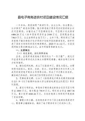县电子商务进农村项目建设情况汇报一年多来,我县按照政府引导、企业主体、协会整合、分步推进的总体思路,强力推进电子商务进农村国家综合示范项目建设,全面完成了项目建设任务,项目累计完成投资4484.26万元(其中国家项目资金2000万元、县级配套资金796.9万元、企业自筹资金X万元),去年7月,顺利通过了商务部电子商务绩效评估并得到评估组专家的高度肯定,初步形成了具有本地特色的农村电商模式,2023年1—12月,全县实现网络交易总额53.4亿元,其中网络零售额X亿元。一、主要做法(一)高度重视,强化保障措施县委、县政府将发展电子商务列为一号工程,通过召开县委常委会等形式先后8次专题研究部署,确保各项工作有力有序推进。1、健全组织机构。成立了以县委书记、县长为组长,分管领导为副组长,商务、发改、农办、财政等相关单位负责人为成员的促进电子商务工作领导小组。形成了书记县长亲自抓、商务部门具体抓、相关部门协同配合抓的工作格局。2、完善政策支撑。出台了《县促进电子商务发展奖励扶持办法》和《关于鼓励和扶持大学生村官电商创业的意见》等系列政策。3、落实专项资金。争取电子商务进农村综合示范项目专项资金2000万元,地方配套796.9万元,吸引社会资金1867.36万元,累计投资4484.26万元,为农村电商工作顺利开展提供了资金保障。4、增配工作力量。在机构改革中专门设立电商发展促进中心,配备事业编制8名,确保了电子商务有专门机构和人员。5、营造电商氛围。开展培训93期,培训各级干部职工、农村新型经营主体负责人及网商、微商创业人员等10000余人次;同时利用会议、网络媒体、电视、广播等多种形式开展农村电商发展政策措施宣传,形成全民上网、全企触网的发展氛围。(二)完善配套,推进项目建设1、全面建成电商公共服务中心。由市高水农副产品批发有限公司和东航公司投入资金600余万元,在粮食物流园,建成集公共服务、在线运营、产品展示、培训推广等功能为一体的电子商务公共服务中心。梦马商务公司依托县科技型中小企业孵化中心打造的电商聚集区,已建成创客空间、电商特色产品展示馆、创客餐吧、培训室等公用平台,56家电商企业和中小企业集中入驻,2023年电商聚集区实现电商交易额3.1亿元,形成了功能完善的电商产业园区。2、科学布局镇村电商服务网点。以电商服务网点的成活率为核心,依托万村千乡市场工程农家店、邮政便民服务点,结合农副产品生产加工企业、新型农村专合组织等产业实际,实行多行业整合、多业态叠加选点,规划确定的398个服务网点已全部建成,并全部开通邮掌柜云端363等电商运营系统,其中360个网点实现了交易实绩,目前网点成活率达到90.1%,收到了建成一个、成活一个、示范一片的效果。支持X易田和田田圈农业服务有限公司等企业建立电商服务网点30余个,进一步充实了我县农村电商服务网络。3、畅通农村电商物流配送渠道。把新建成的低温冷链库和农产品分拣中心作为电商物流基地,由高农司X分公司和X州云商牵头,分别建成了县外大宗农产品物流管理系统和县内小物流管理系统,形成健全的物流配送体系。4、完善电商产品网销配套设施。建成总面积约400平方米的景福镇电子商务创业孵化中心;邮乐购、网购吧、惠当家、台沃电商等4个农产品线下体验店建成投入使用;以台沃公司文可居文库——海量学习资料,手机电脑均可下载www.wenkeju.com万亩生态大米为代表的电商产品示范基地加速壮大;在芦溪镇建成农村电商示范镇,入驻物流快递企业8家,发展微商网店X余家,推动盛世樱花悠乐谷、兰少友水果专业合作社等多家涉农企业电商应用持续升级,让老百姓真正体会到网购可以省钱、网销可以赚钱的便捷和好处。(三)构建五大体系,探索建立电商进农村X模式县以促进县域经济发展为目标,立足产业实际发展电子商务,积极探索,逐步形成了以2+N平台体系、属地化结算体系、区域性物流体系为核心的农村电商X模式。1、构建2+N平台体系。以中国邮政邮乐网和本地电商平台云端363为基础,协调融合淘宝京东网购吧融e购惠当家台沃电商等各类电商平台,建设X商城,共推X系列产品,逐步形成多元化的X特色产品销售平台。截止目前,云端363电商综合服务平台发展互联网+定制农业+示范基地,己实现定制销售3600余万元,带动农民增收30余万元;邮乐网邮掌柜发生总订单数55436笔,交易总金额382.66万元,其中X香菜籽油58.9万元、平强种植专业合作社的台香米42.6万元。2、构建属地化结算体系。我县立足中国邮政邮乐网和云端363网购吧惠当家台沃电商等本地电商平台,携手农商银行、邮政储蓄银行等金融机构构建本地结算系统,形成顺畅的电
