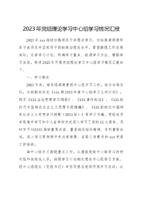2023年党组理论学习中心组学习情况汇报2023年xxx持续加强领导干部理论学习,切实提高局领导班子成员及中层党员干部的政治理论水平,紧密围绕工作发展实际,完善学习计划、明确学习重点、改进学习方法、增强学习实效,现将2023年开展党组理论学习中心组学习情况汇报如下。一、学习情况2023年来,局党组高度重视中心组学习工作,结合本局实际,及时制定印发《xxx局2023年度中心组学习工作计划》,购买《XXX法治思想学习纲要》、《XXX著作选读》、《XXX新时代中国特色社会主义思想专题摘编》、《XXX新时代中国特色社会主义思想学习纲要(2023版)》等学习书籍,党组成员采取集中学习和个人自学的方式深入学习了党的XX大报告、及时学习XXXXXX最新重要讲话、重要批示指示精神、系列重要论述,深入学习贯彻党中央决策部署、省委工作要求和xxx党委工作安排。局中心组学习围绕重点工作,从增强党组中心组学习的针对性和实效性入手,按照学习计划制定理论中心组学习方案,经中心组组长(党组书记)审签同意后组织开展学习活动,必要时将参加人员扩大至局中层党员干部,对每次的中心组学习建立学习档案,保证各项学习任务落到实处,截止到目前,共组织集体学习8次,开展集中学习研讨4次。严格执行考勤制度,要求中心组成员自觉遵守学习时间和学习纪律,妥善处理工学矛盾,严格执行请假和签到制度,因工作无法参加学习的,必须事先向组长请假、事后自觉学习补课,确保学习质量和学习效果,根据需要及时征订、购买理论书籍以及辅导材料,或收集整理相关学习资料,把学习内容与时事政策结合起来、与工作实际结合起来,统筹安排理论学习。二、取得成效通过开展中心组学习,坚持把马克思主义理论作为领导班子和领导干部必备的看家本领,深入学习XXXXXX系列重要讲话精神,通读精读讲话原文,深刻把握精神实质,切实做到用讲话精神统一思想、凝聚力量、指导实践、推动工作,深入学习中央、省、xxx重大决策部署、重要会议精神,为奋力推进xxx各项事业发展提供有力的思想保证和理论支撑,指导党员干部全面领会掌握,并创造性地将理论知识运用到实际工作中。不断完善和规范学习形式,把集体学习、交流研讨作为主要形式,把个人自学作为重要基础,从提高学习质量出发,以集中学习为主,辅以知识讲座、案例分析、交流研讨等多种形文可居文库——海量学习资料,手机电脑均可下载www.wenkeju.com式丰富中心组学习方法,不断增强中心组学习的生动性和吸引力。在此基础上,在学习党的方针政策,党章党史党纪党情相关内容的基础上,中心组组长还重点将xxx领域党风廉政建设、精神文明建设、安全生产、法律法规、财务知识等内容融合进党组中心组集中学习内容,切实做到学习有专题,讨论有重点,发言有质量。三、存在问题和改进措施根据实际情况,我局2023年开展党组理论学习中心组学习活动,存在党员干部自学理论知识效果不佳,学习强国活跃度不高等问题。下一步,我局将一如既往地严格执行《党组(党组)中心组理论学习制度》,加强对党组中心组学习制度的学习、理解和运用,加强对学习强国参与率的提醒与通报,始终把抓好中心组学习作为领导班子思想政治建设的重要内容,坚持学以致用、学用结合的方法,持之以恒地开展好中心组学习。文可居文库——海量学习资料,手机电脑均可下载www.wenkeju.com