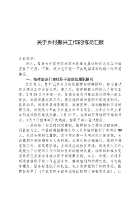 关于乡村振兴工作的情况汇报各位领导:刚才,X县长已就市农村综合改革发展试验区总体工作情况作了汇报。下面,我补充汇报一下前线指挥部近期工作开展情况。一、指挥部运行和挂职干部到位履职情况2月X日,X书记亲自为前线指挥部授牌授印,标志着试验区建设工作全面拉开。第二天,指挥部就立即投入了相关工作。2月25日开年第一天,X部长亲自召集试验区领导小组工作会,安排部署近期工作,要求指挥部和挂职干部迅速到位、抓紧动早,迅速开展调查摸底、政策宣传、规划编制和项目梳理工作,特别是今年的工作重点和开工项目,力争在今年上半年形成试验区建设热潮。2月27日,指挥部召开挂职干部动员会;3月2日指挥部正式运转,挂职干部入驻试验区。一是挂职干部及时到位履职,指挥部全力做好后勤保障。到目前为止,市县抽调指挥部工作人员和驻村挂职干部共计89人,已经全部到位履职。其中市纪委一名同志因办案请假,县派挂职干部前期有5人未到岗,本周已经全部就位。挂职干部克服工作、家庭等困难,主动适应试验区环境,迅速投入工作,展现出了过硬的工作作风和良好的精神风貌。指挥部和镇乡党委政府已妥善安排好挂职干部通勤交通、办公、食宿,并将不断改善挂职干部工作生活条件,解决他们的后顾之忧。为切实管理好、服务好挂职干部队伍,充分发挥挂职干部的作用,指挥部起草了《市农村综合改革试验区挂职干部管理办法》,已提交市委组织部,待审定后印发执行。二是强化规范管理,明确职责任务。为科学有序推进各项工作,指挥部建立健全了前线指挥部组织架构,明确指挥长分工,成立了规划统筹、基础设施、产业发展、村镇建设、社会事务、政策宣传等7个工作组,明确了职责任务。联系协调驻村挂职干部,对接市县相关部门,努力形成工作合力。指挥部制定了例会制度和财务管理等一系列制度规定,各工作组拟定了年度工作任务和时间表,各项工作有序推进。二、指挥部近期开展工作(一)认真开展宣传调研。一是制定了春节期间试验区宣传工作方案,起草了《致试验区老乡朋友的一封信》,在公路沿线设置大型公益广告牌和宣传标语,先期开展宣传动员、营造试验区建设氛围,组织基层干部春节走访慰问群众,针对返乡农民工开展政策宣传和思想动员。二是拟定了调查工作提纲,指导镇乡和驻村干部针对基础设施、农房改造、产业发展、公共服务、劳动力资源、贫困人口等方面系统开展调查研究,以村为单位形成基础台账和调查报告,同时请清华大学社会学系开展试验区三农问题调查研究;梳理中央和地方农村改革政策文件组织大家学习贯彻,编写政策宣传通稿,走街串户,广泛宣传动员,发动群众参与试验区建设,鼓励村社农户通过一事一议、以奖代补,筹资投劳修建村社道路;针对土坯房改造和基础设施奖补政策,广泛征求群众意见;组织返乡农民工创业座谈会,听取乡镇代表创业历程、面临困难和期盼诉求。截至目前,驻村干部召开动员会、宣传会610次,发放传单1万5千余张,制作悬挂标语X条,进村入户走访群众11332户,搜集意见建议500条,主要集中在基础设施建设、改善人居环境、加快发展产业、改善乡村治理等方面。挂职干部的工作,得到了当地党委政府、村社干部及广大群众全力支持和充分肯定。(二)切实做好规划统筹。为确保规划编制高起点、高标准、高要求,同时可操作、可实施、能落地,充分发挥规划对文可居文库——海量学习资料,手机电脑均可下载www.wenkeju.com试验区建设的科学引领作用,指挥部全力抓好规划统筹工作,主动与有关部门沟通衔接,参与规划编制工作。目前中国农大富通城乡规划设计研究院已经完成前期现场调研;清华同衡城市规划设计院、省城镇规划院等5家单位全面开展11乡镇的规划调研;指挥部会同相关部门和设计单位,结合今年启动的涉农基础设施项目和产业项目开展幸福美丽新村选址规划,加强项目的空间统筹和资金统筹,按照产村相融的要求,统筹新村聚居点建设要素,努力做到重点突破、以点带面。(三)积极助推项目建设。指挥部通过挂职干部与镇乡村干部一道制定本乡本村发展规划,主动对接参与县级部门项目资金梳理,充分利用现有条件,积极谋划今年启动项目,积极为乡镇产业发展牵线搭桥。截至目前,通过群众一事一议,试验区已筹集村社道路建设资金517.53万元、开工道路17条;配合县水务局编制立项方案,成功争取到2024年省级小农水重点县项目,财政总投资2200万元,目前已完成财政投资674万元;筹集土坯房改造资金732万元,已开工建设36套;产业发展方面,目前已签订土地流转协议24个,协议流转土地8502亩,其中已流转土地4753亩,其中景福镇与X夏荣农业科技有限公司签订3500亩土地流转协议种植毛豆,价值20余万元的农机具和种子已经到位,县藤丰藤椒专业合作社在双乐乡扩建基地1400亩;试验区与浩隆润川、铁骑力士等龙头企业和62家种养大户对接洽谈,洽谈项目55个,其中铁骑力士选定
