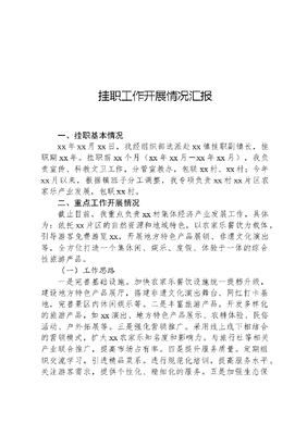 挂职工作开展情况汇报一、挂职基本情况xx年xx月xx日,我经组织部选派赴xx镇挂职副镇长,挂职期xx年。挂职前xx个月(xx年xx月-xx年xx月),我负责宣传、科教文卫工作,分管宣教办,包联xx村、xx村;今年xx月以来,根据镇班子分工调整,我专项负责xx村xx片区农家乐产业发展,包联xx村。二、重点工作开展情况截止目前,我重点负责xx村集体经济产业发展工作,具体为:依托xx片区的自然资源和地域特色,以农家乐餐饮为载体,引导游客免费游览xx,开展地方特色产品展销、非遗文化演出等,全方位打造一个集休闲、娱乐、度假、体验于一体的综合性旅游产品。(一)工作思路一是完善基础设施。加快农家乐餐饮设施统一提档升级,建设地方特色产品展厅,搭建非遗文化演出舞台、网红打卡基地,完善景区内休闲娱乐等。二是丰富旅游产品。开发多样化的旅游产品,如xx演出、地方特色产品展示、农耕体验、民俗活动、户外拓展等。三是强化营销推广。采用线上线下相结合的营销模式,扩大xx农家乐知名度和影响力。与旅行社等相关产业联合推广,提高市场占有率。四是提升服务质量。定期组织交流学习,引进精品菜系。进行规范化培训,提高服务水平。关注游客需求,提供个性化、精细化的服务。五是加强生态保护。严格执行环保政策,确保生态环境的可持续发展。(二)具体措施一是健全发展模式。坚持党支部+公司+农户发展模式,成立项目实施公司(xx市xx旅游服务有限公司),具体负责项目建设的各项工作,如基础设施建设、旅游产品开发、服务质量管理等。二是实施精细管理。建立完善的质量管理体系,对旅行社等各类合作伙伴进行严格把关,确保项目品质。实行农家乐星级评定制度,以游客打分、大众点评为公司分配游客流量的主要评定标准,激发农户内部再生动力,杜绝恶意竞争,维护市场公平。三是强化安全保障。完善卫生防疫、消防、食品等各项制度建立定期检查与随机抽查机制,对农家乐进行季度考核,保证服务质量。四是加强队伍建设。围绕接待礼仪、职业道德、安全知识和诚信经营等方面,定期开展规范化培训。引进导游、文化宣讲、地方特色推荐等多方面专业人才,推进产业链条向纵深开展。(三)进展情况一是筹备工作完成。经过与xx集团沟通协商,xx镇人民政府与景区管理公司在xx月底就合作模式达成一致。xx月初,双方签署了安全协议,xx景区开放,农家乐+免费游xx模式全面启动。二是运营步入正轨。xx旅游服务公司办公场地已装修完毕,xx特色产品展厅布置已妥善完成,目前各项展销产品正在陆续上架,预计xx月中旬完成。公司初步制定了一套管理制度、旅行社协议书、农户承诺书等,计划xx月下旬全面实施。三是经营日益规范。组织农户进行外出参观学习,通过座谈交流改进服务方式,完善农家菜品和用餐标准。农户统一采购定制服装,户前标牌、巷道灯箱等logo宣传标识标牌已挂设到位,市融媒体中心拍摄的宣传系列视频已至第二期,整体氛围浓厚。户内户外环境卫生保持高标准、常态化整治,初步满足了旅游景区的要求。截至目前,周末节假日日均游客已达xx余人次,整体运行良好,已初具规模。文可居文库——海量学习资料,手机电脑均可下载www.wenkeju.com三、挂职工作感悟挂职以来,我深感广大农民群众的文化底蕴深厚,利益诉求多样,唯有秉持诚恳、真挚的态度,才能赢得信任,打通基层政策落实的最后一公里。一是要脚踏实地。基层政策的落实并非轻而易举,只有充分发挥自身优势,稳扎稳打,不断创新方法,才能化被动为主动,攻克难题,做好各项民生工作。二是要实事求是。经济发展、民生改善并非仅体现在数字增长,更关乎每一个群众的生活品质,唯有真诚务实的工作,才能助力群众增收,真正为群众服务。三是要主动作为。深入基层让我对农村经济社会发展有了全面认识,深切感受到农村产业结构调整等方面的迫切需求,只有主动作为,从产业发展、环境整洁、村风提升等各方面用心用力,才能以实际行动助力乡村振兴。文可居文库——海量学习资料,手机电脑均可下载www.wenkeju.com