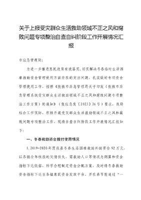 关于上报受灾群众生活救助领域不正之风和腐败问题专项整治自查自纠阶段工作开展情况汇报市应急管理局:为进一步推进惠民政策有效落实,切实解决冬春临时生活困难救助资金管理使用方面存在的突出问题,扎实做好专项资金管理使用工作,按照《张掖市应急管理局关于印发〈张掖市应急管理系统受灾群众生活救助领域不正之风和腐败问题专项整治工作方案〉的通知》(张应急发〔2023〕26号)要求,我局结合工作实际,积极开展受灾群众生活救助领域不正之风和腐败问题专项整治工作,现将自查自纠阶段工作开展情况汇报如下:一、冬春救助资金拨付使用情况1.2019-2020年度我县冬春生活困难救助补助资金92万元,以各镇全年核报的灾情损失、需救助人口等情况为测算和资金指标下达依据,科学合理制定资金分配方案,及时将冬春救助资金指标下达至各镇惠民资金发放平台,并在春节前通过一卡通全部发放至救助对象账户,没有预留资金,未超出资金发放时限要求。全县共救助受灾困难群众457户1687人,有力确保了受灾困难群众基本生活和安全过冬。2.2020-2021年度我县冬春生活困难救助补助资金25万元,通过户报、村评、镇审、县定的程序确定冬春受灾困难群众救助对象185户775人,截至2021年1月20日,25万元冬春生活救助资金已全部通过一卡通发放至救助对象账户,没有预留资金,未超出资金发放时限要求。3.2022-2023年度我县冬春生活困难救助补助资金189万元,通过户报、村评、镇审、县定的程序确定冬春受灾困难群众救助对象683户2279人,2023年1月16日通过惠农一卡通全部发放到户,没有预留资金,未超出资金发放时限要求。二、专项整治自查自纠工作开展情况(一)强化组织领导,及时安排部署。冬春临时生活困难救助资金管理使用是目前社会关注的热点,也是易发微腐败的重点领域,市局方案下发后局党委高度重视,迅速组织班子成员、全体干部深入学习省、市纪委二次全会精神和全市文可居文库——海量学习资料,手机电脑均可下载www.wenkeju.com应急管理系统受灾群众生活救助领域不正之风和腐败问题专项整治工作实施方案等文件,进一步提高政治站位,切实把受灾困难群众生活救助和灾情报送工作作为深入贯彻落实党的XXX和中纪委、省纪委二次全会精神的重要举措。并迅速成立了专项整治工作领导小组,制定了《XX县受灾群众生活救助领域不正之风和腐败问题专项整治工作实施方案》,明确目标任务和监督重点,及时召开会议安排部署专项整治工作,并积极安排部署专项资金自查自纠工作,要求加强协调,形成合力,确保自查自纠工作不出偏差。(二)突出工作重点,密切协作配合。全面对照履职尽责不到位、灾情报送不及时、资金管理不规范、背后可能存在的作风和腐败问题等四个方面的整治重点,找准存在的突出问题、风险隐患以及侵害群众利益的作风和腐败问题,结合我县实际制定专项整治工作方案,全面部署开展专项整治工作。组织召开动员部署会议,强调专项整治工作的重要性并对本次专项整治工作的整治重点、实施步骤、工作要求等方面进行详细安排部署,形成各负其责,一级抓一级的工作格局,确保专项整治文可居文库——海量学习资料,手机电脑均可下载www.wenkeju.com工作取得实效。(三)强化宣传动员,接受各方监督。结合三抓三促行动,我县积极通过微信、抖音等方式广泛宣传,营造社会广泛知晓、群众积极参与的浓厚氛围。通过与纪委监委沟通协调,主动接受纪委监委的监督和指导,通过乡村振兴监督平台,利用平台的数据比对、群众监督、统计分析等功能,对2019年以来的我县受灾群众生活救助资金逐一对照检查,至目前未发现资金管理和使用中的问题。县、镇、村三级通过发布整治公告和设立信访举报箱、投诉电话、电子邮箱等方式接收社会的监督,共设立信访举报箱11个,粘贴公告120余份。至目前未接收到群众的投诉和举报。(四)加强监督检查,确保工作实效。我县严格按照户报村评、镇审县定的程序,坚持公开公平公正的原则,于2019年以来每年派出检查组对涉及冬春生活困难救助资金发放的农户按25%的比例进行了抽查检查。2019-2021年度的冬春救助资金我局已接收审计检查,检查采取查阅资料,走访农户的方式,查阅镇、村评审会议记录、公示花名册,对照查看农户户口簿、文可居文库——海量学习资料,手机电脑均可下载www.wenkeju.com粮食直补折和冬春生活困难补助资金收款短信,询问农户村级评议、家庭受灾、补助资金发放情况,并且签署了冬春生活救助资金发放告知单,确保了群众对冬春救助资金的知晓率。三、下一步工作措施在专项整治工作自查中发现,我们也还存在对灾情统计更新时效性不强、灾情上报不及时等情况。下一步,我们将专项整治作为开展三抓三促行动的重要内容,继续做好以下几方面工作:(