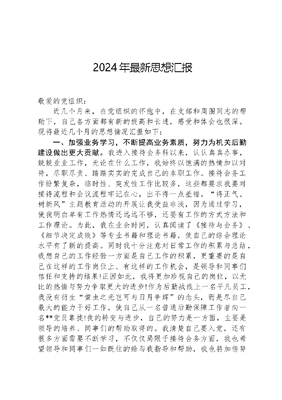 2024年最新思想汇报敬爱的党组织:近几个月来,在党组织的怀抱中,在支部和周围同志的帮助下,自己各方面都有新的提高和长进,感受和体会也很深。现将最近几个月的思想情况汇报如下:一、加强业务学习,不断提高业务素质,努力为机关后勤建设做出更大贡献。我进入接待会务科以来,认认真真办事,兢兢业业工作,无论在什么工作,我始终以饱满的热情加以对待,尽职尽责、踏踏实实的完成自己的本职工作。接待会务工作纷繁复杂,临时性、突发性工作比较多,这些都要求我要对接待流程和会议流程牢记在心,出不得一点差错。将正气、树新风主题教育活动的开展让我受益非浅,因为通过学习,使我明白单有工作热情还远远不够,还要有工作的方式方法和工作理论。为此,我在业余时间,认真阅读了《接待与会务》、《细节决定成败》等专业书籍和理论书籍,使自己的综合理论水平有了新的提高。同时我十分注意对日常工作的积累与总结,我想自己的工作经验一方面是自己工作的积累,更重要的是自己在这样的工作岗位上、有这样的工作机会,是领导和同事们信任和支持的结果!正因如此,我将更加珍视自己的岗位,以无比的热情与努力争取更大的进步!作为后勤战线上一名平凡员工,我没有衍生萤虫之光岂可与日月争辉的念头,而是尽自己最大的能力干好工作,使自己从一名普通后勤保障工作者向一名**党员靠拢!我的转变与进步,自己的努力是一方面,主要是领导的培养、同事们的帮助取得的。我清楚自己要入党,还有很多方面需要不断学习,不仅仅局限于接待会务方面,我也希望领导和同事们一如既往的给与我指导和帮助,我也将加倍努力,争取更大的二、工作中,严以律己,宽以待人,向身边的党员模范学习,起相应模范带头作用。一直以来,我在平时工作中,始终严格要求自己,模范遵守单位的各项规章制度,时刻严格要求自己,有条不紊地做好各项工作,努力起的表率作用,协助大家开展各项工作。生活上,我虽然年龄不是很大,但我保持我是一名员的心态在生活中关心同事们的点点滴滴,让他们觉得党员的榜样和光辉时刻在身边。同时,我还积极向身边党员靠拢,学他们的精神实质,做到在工作中克服浮躁心态,珍惜自己的岗位,牢固树立为后勤保障事业无私奉献的精神,把个人的追求融入到后勤保障事业之中,把自己所在岗位的每一件事做好、做到位,这是我最对工作的最低标准。我认真坚持学习制度,积极参加各项学习,以两个《条例》的学习为契机,深入领会《条例》的精神,在政治思想觉悟和对党的认识上均得到了进一步提高。通过系列的学习与批评和自我批评活动,我的思想得到了净化,工作的责任心得到了加强。三、缺点与不足通过自己查,同事帮、领导点,我认识到自己在工作中还存在很多的不足与缺点,通过缺点定措施,有助于我在今后工作中更好的开展工作。我的缺点与不足自己总结有以下几点:1、政治理论学习深度不够,缺乏深厚的理论功底和素养。2、在工作过程中,缺乏创新的主动性,今后我应加强学习不断提高自己的管理水平,工作中不断总结经验。3、与同事交流少,关心同事不够。具体表现:和同事们的联系不够,缺乏交流;工作中对同事们的关心不够;业务知识不够精通,钻研不够。我这方面的缺点,同志们曾给我指出过,所以我还需进一步努力改进。回顾这一段时间的工作,我基本完成了本职工作,这与领导的支持和同事们的帮助是分不开的,以上是我这一季度思想、工作方面情况的总结,不全面和不准确的地方,请批评、指正。这就是我近几个月的思想情况,如有错误或认识不够深刻的地方,请党组织给予指正。文可居文库——海量学习资料,手机电脑均可下载www.wenkeju.com此致敬礼 汇报人:年月日文可居文库——海量学习资料,手机电脑均可下载www.wenkeju.com