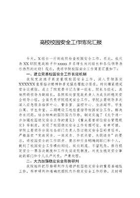 高校校园安全工作情况汇报今天,X组长一行到我院检查校园安全工作。在此,我代表XX职院党政班子和xxxxx多名师生向刘组长和各位领导表示热烈的欢迎!现在,我将学院校园安全工作简要汇报如下:一、建立完善校园安全工作长效机制我院党政班子高度重视校园安全工作,深入贯彻落实XXXXXX重要指示精神和李克强总理批示要求,时刻绷紧稳定安全这根弦。成立了院党委书记为第一组长、院长为组长,其他院级领导为副组长,各院部处室党政负责人为成员的稳定安全领导小组,全面负责学院稳定安全工作。学院主要领导多次深入应急服务指挥中心、警务室、监控中心、生活超市、学生公寓、学生食堂、二期建设工地检查指导校园安全工作,解决存在问题。结合特殊的国际国内形势,制定实施了《关于进一步加强校园稳定安全工作的意见》《重点要害部位安全管理规定》等制度,实现了校园稳定安全工作有据可依、有章可循。学院主要领导分别与各部门负责人签订稳定安全目标责任书,严格落实党政同责、一岗双责、齐抓共管、失职追责的要求,将校园安全的工作职责、要求和任务明确到部门和个人,做到了校园安全工作横向到边、纵向到底、不留死角。推行稳定安全一票否决制度和工作失误追究制度,对发生稳定安全事故的部门和个人从严问责,严肃处理。二、大力加强稳定安全形势研判我院始终把形势研判作为维护校园稳定安全的重要基础性工作,科学研判和准确把握院内外稳定安全工作形势,及时研究解决校园稳定安全面临的困难和问题,全院上下形成了保稳定才能促发展、保稳定就是促发展的共识。健全了院内三级稳定安全信息员和宣传员队伍,及时发现和反馈校园及周边的苗头性、倾向性问题,确保学院能够第一时间响应和处置。加强了校园网络信息管理,教育引导师生利用网络正确发声,坚决杜绝负面言论。加强了值班制度,实行学院领导带班和24小时值班备勤制度以及二级学院主要负责人和学生管理人员夜间值班制度,完善了信息报送工作机制,做到重大紧急信息不漏报、不迟报、不瞒报、不谎报,客观反映工作成绩和不足。三、做实做细重点领域安全工作我们坚持重心下移、关口前移的思路,以预防、排查和消灭安全隐患为重点,以安全生产月为抓手,集中时间和人力对敏感节点和要害部位开展大排查、大化解、大整治活动,彻底解决影响稳定安全的矛盾和问题。一是加强疫情防控。认真贯彻落实中省市疫情防控工作要求,精细制定常态化疫情防控方案,织密织细织牢防控网络,重点做好寒暑期离校与开学返校工作。加强校园公共卫生体系建设,不断完善校园疾病预防控制体系。大力开展新时代校园爱国卫生运动,做好消毒消杀工作。扎实推进新冠疫苗接种,截至目前全院共有xxxxx名师生完成疫苗接种。二是加强食品安全。遵照XXXXXX关于食品安全工作四个最严要求,严格执行《学校食品安全与营养健康管理规定》,严把食品采购关、储存关、加工关、出售关、清洗消毒关、留样检查关、从业人员准入关,坚持每周对食堂食品安全工作检查两次,库房做到通风、防潮、防霉变质。坚决不使用不符合卫生标准的原材料。严格食品添加剂管理,做到专人、专柜、专用工具并建立台账。制作的成品饭菜,一律留样48小时。从业人员一律持证上岗,定期体检,定期培训,强化卫生安全意识。三是加强消防安全。学院设有消防设施火灾自动报警系统、自动灭火系统、消防给水系统、安全监控系统、应急照明设施及报警设备、室内外消防栓等,建有微文可居文库——海量学习资料,手机电脑均可下载www.wenkeju.com型消防站等。按照安全生产月要求,我们部署排查了消防设施、灭火器材、耐火材料、用电安全、燃气管道、压力容器的安全有效性,确保全院消防安全。投入xx万元,对场馆消防设施进行了检查维修。四是加强实验室安全。学院自上而下成立了实验实训室安全领导小组和各二级学院领导小组,负责实验实训室安全工作的监督、检查、指导和管理,健全完善了高校科研实验室安全分级管理责任体系,按照谁实用、谁负责,谁主管、谁负责的原则,落实责任到岗到人。定期开展实验实训室安全隐患排查,对于危化品安全、生物安全、特种设备等隐患较多的部门,定期开展安全培训。五是加强校园车辆安全。严格落实车辆派遣、审批、驾驶、检查等工作程序,严把用车范围,要求如实准确填写用车人数、随行人员、用车事由、行驶路线、起止时间等相关信息。指定专人负责校车的使用、停放、维修保养,严格执行节假日车辆集中封存制度。加强驾驶员安全教育,强化安全意识,认真落实用车安全措施,确保行车安全。加强校内机动车管理,实行校园道路高峰时段交通管制,纠正乱停乱放、不按规定行使等现象,确保校内交通安全。六是加强特种设备安全。对学院所有电梯实行专人管理、定期维护制度,做到每天运行有记录。在寒暑假、开学初、学期末四个重要节点,对电梯进行全面、系统检查排查、维护保养,并从xxxx年开始购买电梯意外险
